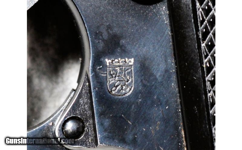 Description: A Polizei trade in pistol bearing the coat of arms of Berlin. 7.65mm SOLD Chambers: 7.65 Metal Condition: "Good-Very Good, Some holster wear and little else. Wood Condition: "Excellent, Clean and free of damage except for some scratches on the bottom. Bore Condition: "Very Good, Shiny with good rifling. Barrels: 3.5" Barrel Triggers: Factory DA/SA trigger. Butt Pad: Black plastic grips Weight: 1lb 9oz Sights: Fixed iron sights with a matted rib Item Location: Lacey, WA |