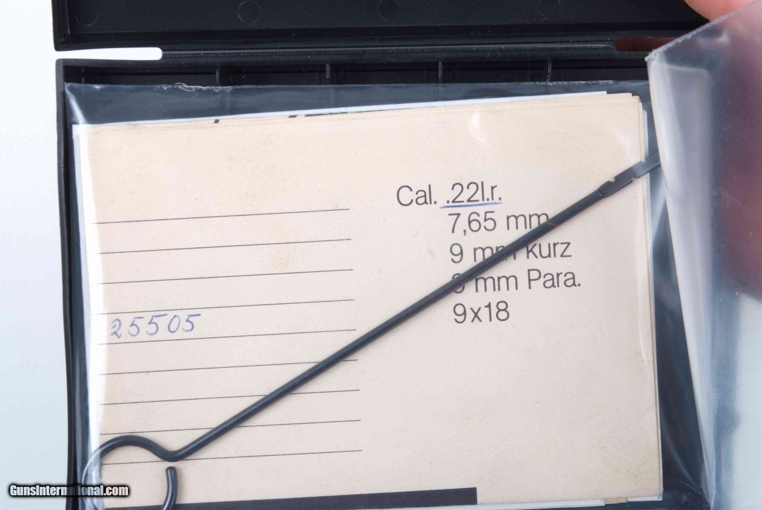 Description: Description: Very scarce Postwar Walther PP, factory engraved and silver plated, in presentation case. Standard foliate engraving with matted background, crosshatching over exposed chamber and bottom of spare magazine floorplate. Left side of slide with the usual Walther banner, model and caliber. Coded manufacturing date “HH” on exposed chamber. Full serial number on right side of slide and frame. Ivory colored 2 piece grips and magazine extension. Each of the chrome plated magazines are unmarked with an indicator slot on the right side. The floorplate has crosshatched engraving, complimenting the pattern on the exposed chamber. Complete with blue leatherette presentation case, silvered Walther banner on the silk lining inside the lid. Burgundy velour base with corded trim and single chrome plated clasp securement. Also includes the original numbered shipping box, cleaning rod, instruction booklet and numbered test target. Synopsis: Spectacular Walther PP, Factory Engraved, silver plated in factory presentation case with spare magazine, cleaning rod and original factory shipping box. Condition: The ensemble appears nearly new, with just the most minor handling marks. There is no scuffing over the exposed barrel hood or sharp edge wear anywhere on the gun. Comparable condition white grips with no cracks even around the escutcheons. The only discernable wear relates to the insertional scuffing on the magazines. Presentation case is virtually new, no discernable scuffing on the outside. Minor impressions around pistol silhouette on base. Comparable condition black shipping box with crisp paperwork. A fantastic ensemble that could not be more complete. SOLD Handgun Caliber: .38 Auto (.38 ACP) Manufacturer: Walther Model: PP, Silver Engraved Serial Number: 25505LR |