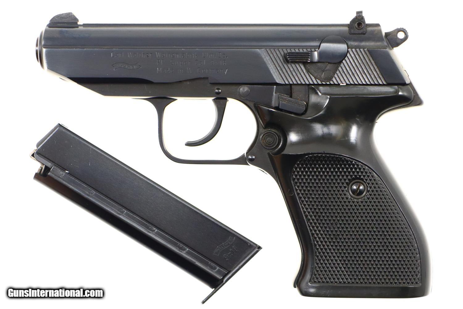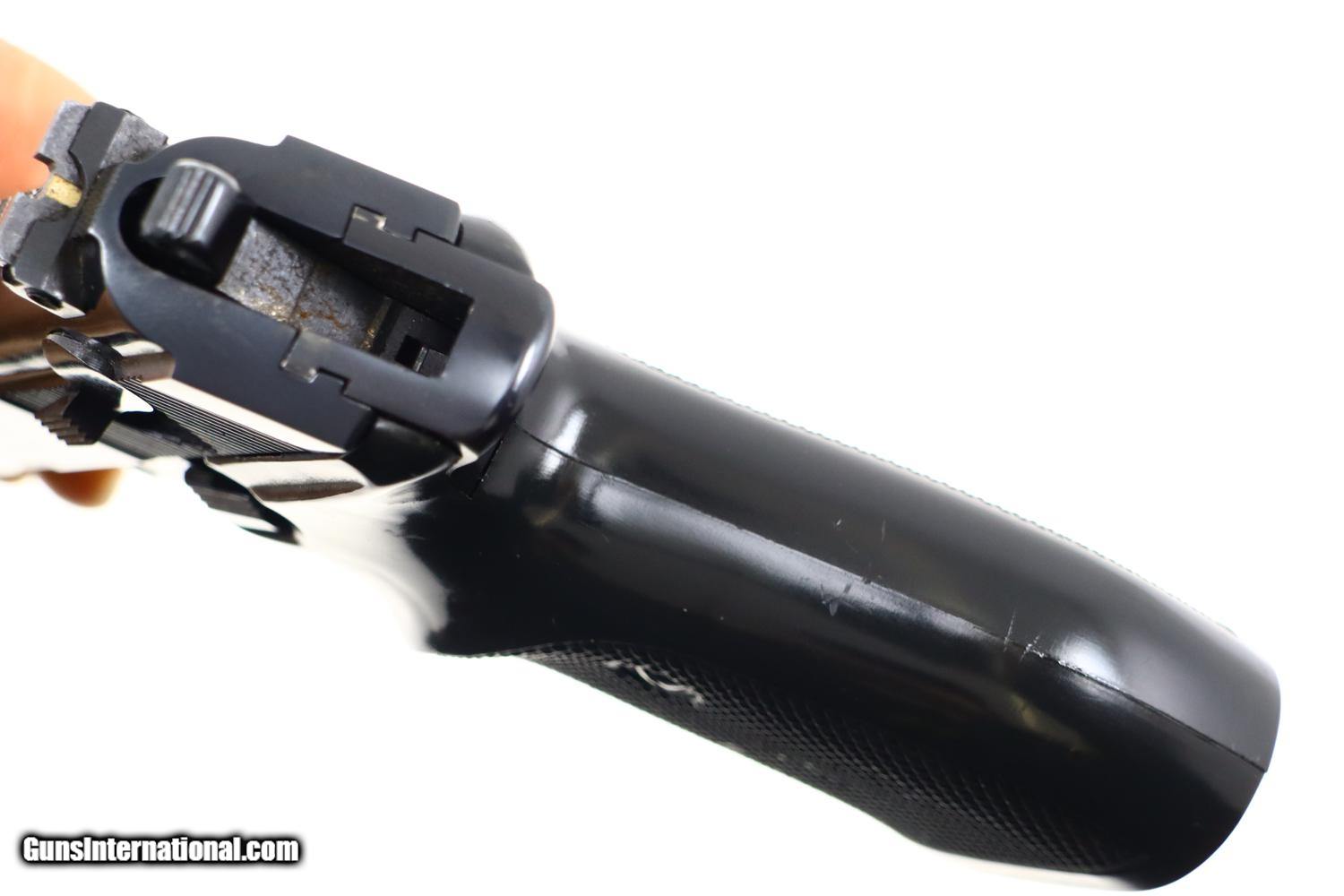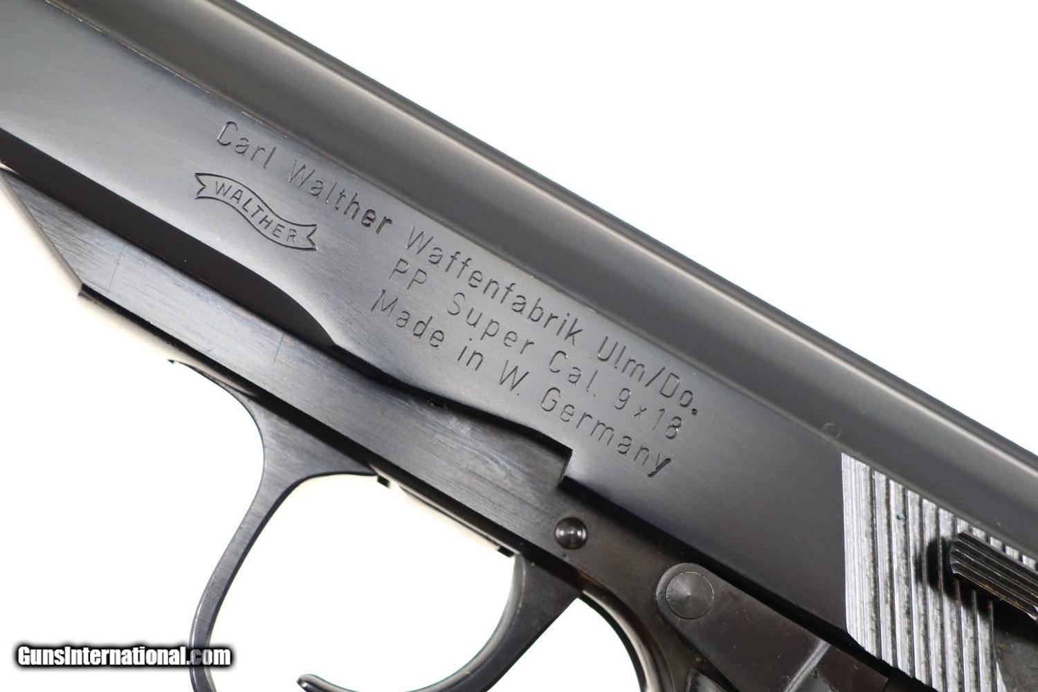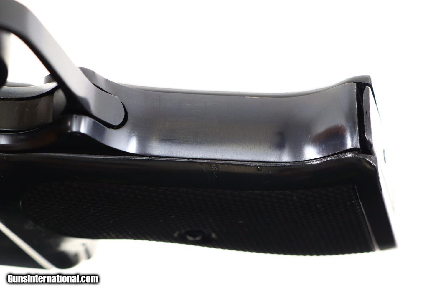 Description: Standard configuration Walther PP Super with fixed front sight and horizontally adjustable rear sight, both with white highlights. Left side of slide with usual three line address including manufacturer, model, caliber, and location in West Germany. Right side of slide is marked with the full serial number. Eagle/N proofing on barrel hood, slide and frame, the barrel hood having been marked “HH” to reflect the production year 1977. Fitted with two piece black plastic grips, left panel with a shallow thumb rest. Each of the panels have a large uniformly checkered field, the pair secured with a single transverse screw. Magazine with four vertical indicator slots and a separate hole on the right side. Left side marked with the Walther banner and caliber 9×18. Detachable base. Synopsis: Walther PP Super 9x18, Excellent! Condition: Excellent, bright original finish with only a few tiny rub marks that are nearly imperceptible. Minor scuffs on grips. Mirror bore. Perfect manual mechanics. ~~Insured shipping fee of $45; most packages shipped using FedEx 2nd Day.~~ SOLD Manufacturer: Walther Serial Number: 16268 Caliber Info: 9x18 |