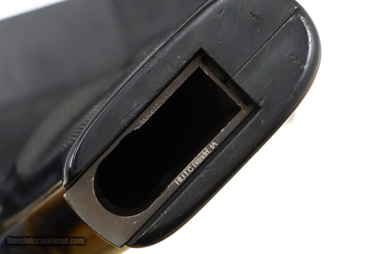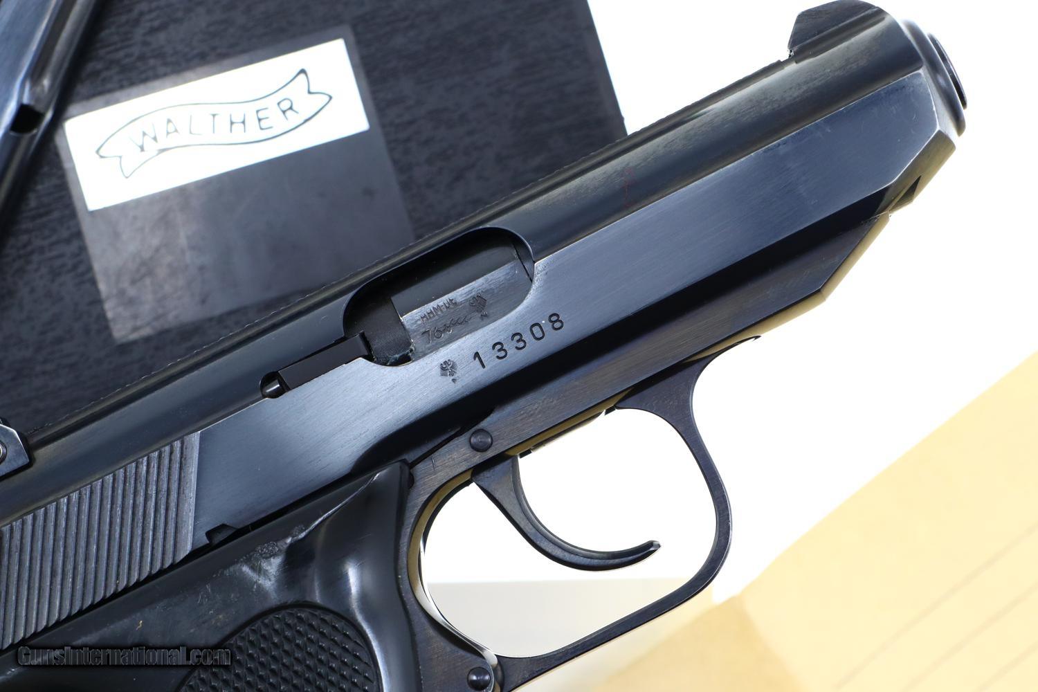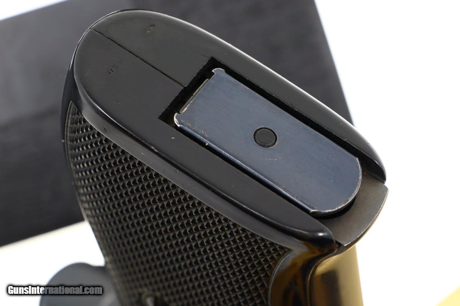 Description: Standard configuration Walther PP Super with fixed front sight and horizontally adjustable rear sight, both with white highlights (the white paint in the rear sight missing). Left side of slide with usual three line address including manufacturer, model, caliber, and location in West Germany. Right side of slide is marked with the full serial number. Eagle/N proofing on barrel hood, slide and frame, the barrel hood having been marked “76” to reflect the production year. Fitted with two piece black plastic grips, left panel with a shallow thumb rest. Each of the panels have a large uniformly checkered field, the pair secured with a single transverse screw. Magazine with four vertical indicator slots and a separate hole on the right side. Left side marked with the Walther banner and caliber 9x18. Detachable base. Complete with spare magazine, an original PP Super instruction booklet, cleaning rod, matching test target, all in factory matching shipping box. Synopsis: Walther PP Super in 9x18, Spare Magazine, Literature, Matching Test Target and Shipping Box. Condition: 99+% original bright salt blue, just the faintest sharp edge wear around the muzzle and trigger guard. Grips have handling marks, largely above the checkered field, especially the right panel. Mirror bore. Perfect manual mechanics. Excellent condition instruction booklet. An excellent, complete, Walther PP Super ensemble, Cal. 9X18, as shipped from the factory. ~~Insured shipping fee of $55; most packages shipped using FedEx 2nd Day.~~ SOLD Manufacturer: Walther Serial Number: 13308 Caliber Info: 9x18 |