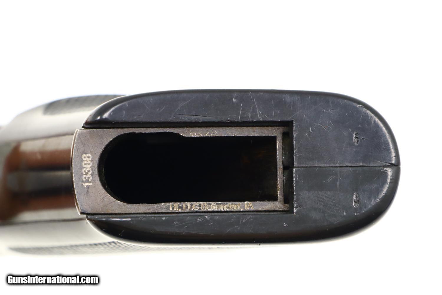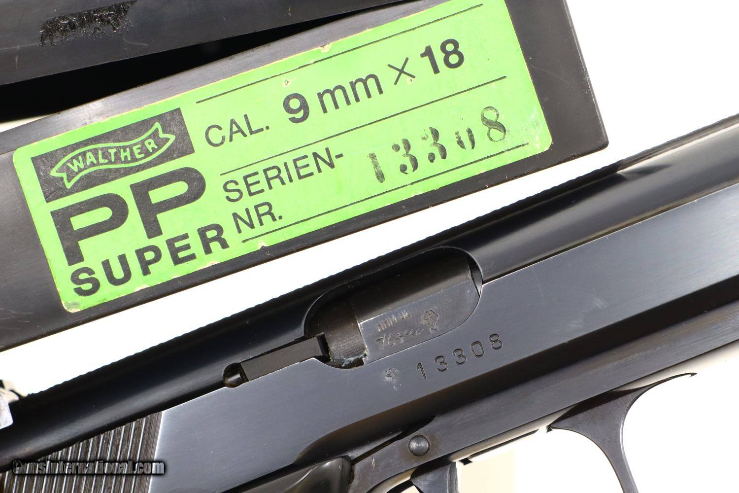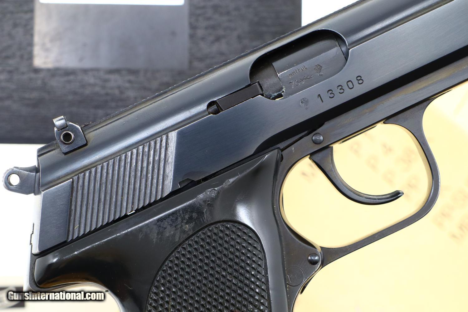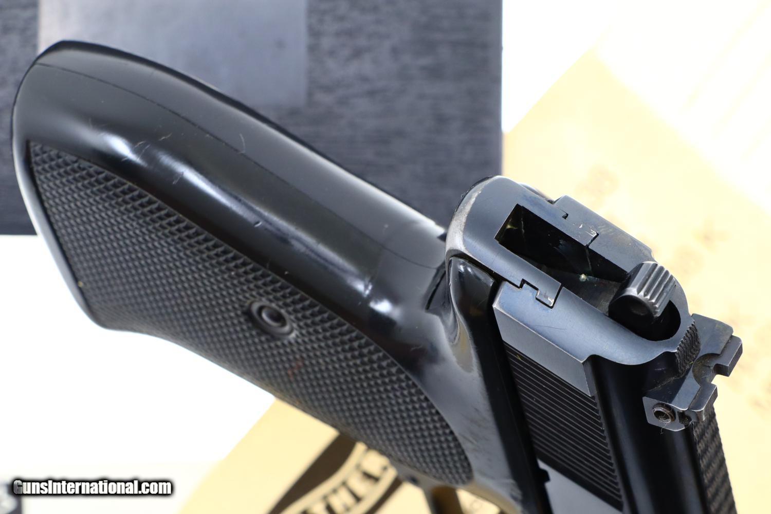 Description: Standard configuration Walther PP Super with fixed front sight and horizontally adjustable rear sight, both with white highlights (the white paint in the rear sight missing). Left side of slide with usual three line address including manufacturer, model, caliber, and location in West Germany. Right side of slide is marked with the full serial number. Eagle/N proofing on barrel hood, slide and frame, the barrel hood having been marked “76” to reflect the production year. Fitted with two piece black plastic grips, left panel with a shallow thumb rest. Each of the panels have a large uniformly checkered field, the pair secured with a single transverse screw. Magazine with four vertical indicator slots and a separate hole on the right side. Left side marked with the Walther banner and caliber 9x18. Detachable base. Complete with spare magazine, an original PP Super instruction booklet, cleaning rod, matching test target, all in factory matching shipping box. Synopsis: Walther PP Super in 9x18, Spare Magazine, Literature, Matching Test Target and Shipping Box. Condition: 99+% original bright salt blue, just the faintest sharp edge wear around the muzzle and trigger guard. Grips have handling marks, largely above the checkered field, especially the right panel. Mirror bore. Perfect manual mechanics. Excellent condition instruction booklet. An excellent, complete, Walther PP Super ensemble, Cal. 9X18, as shipped from the factory. ~~Insured shipping fee of $55; most packages shipped using FedEx 2nd Day.~~ SOLD Manufacturer: Walther Serial Number: 13308 Caliber Info: 9x18 |
