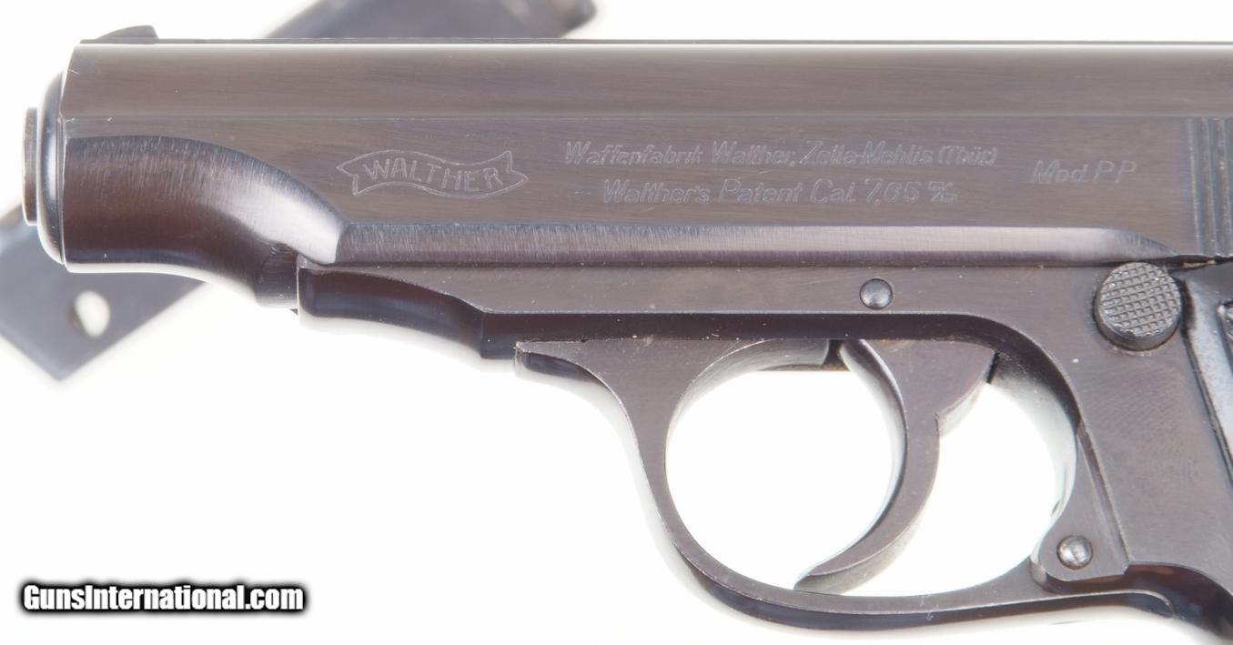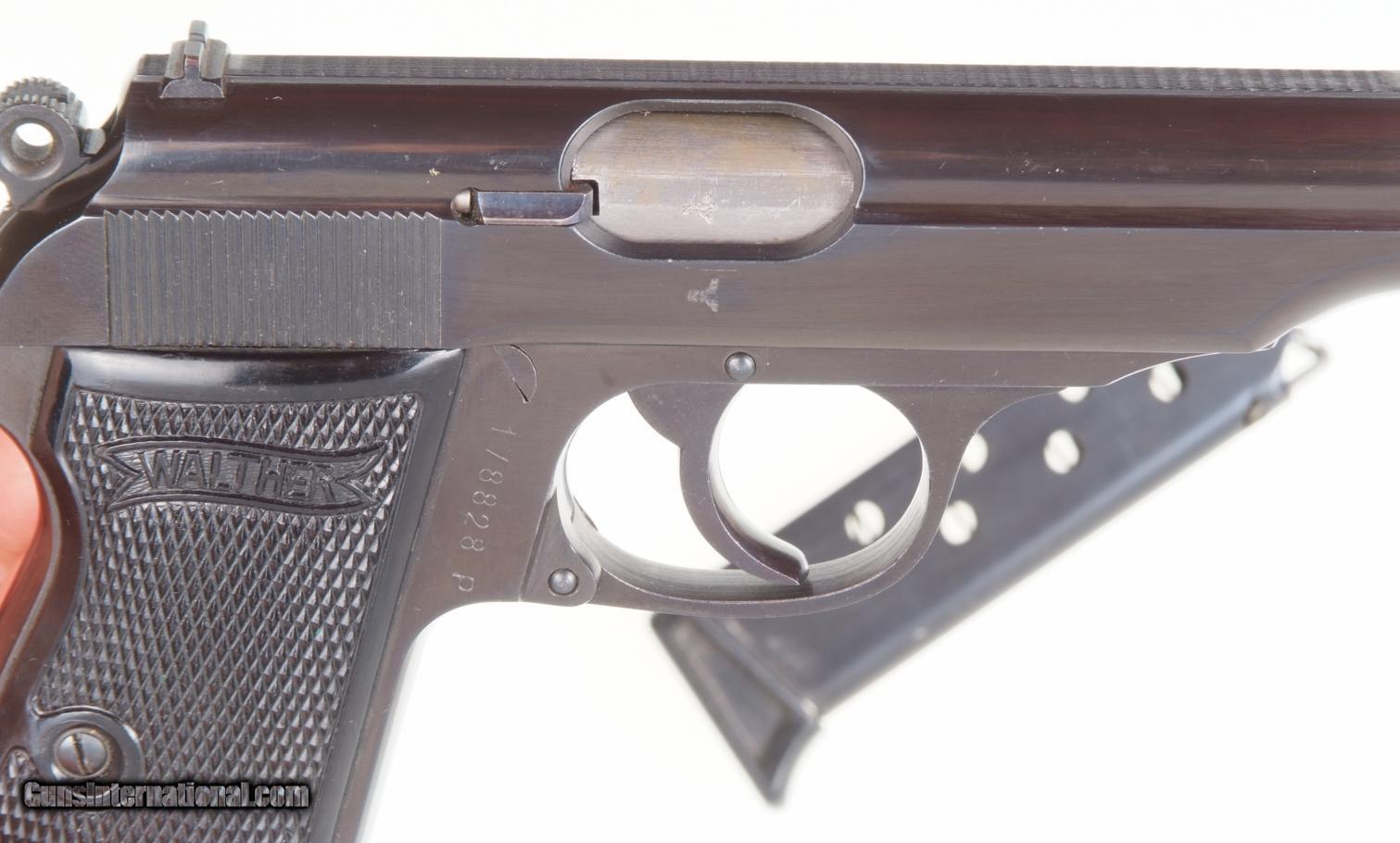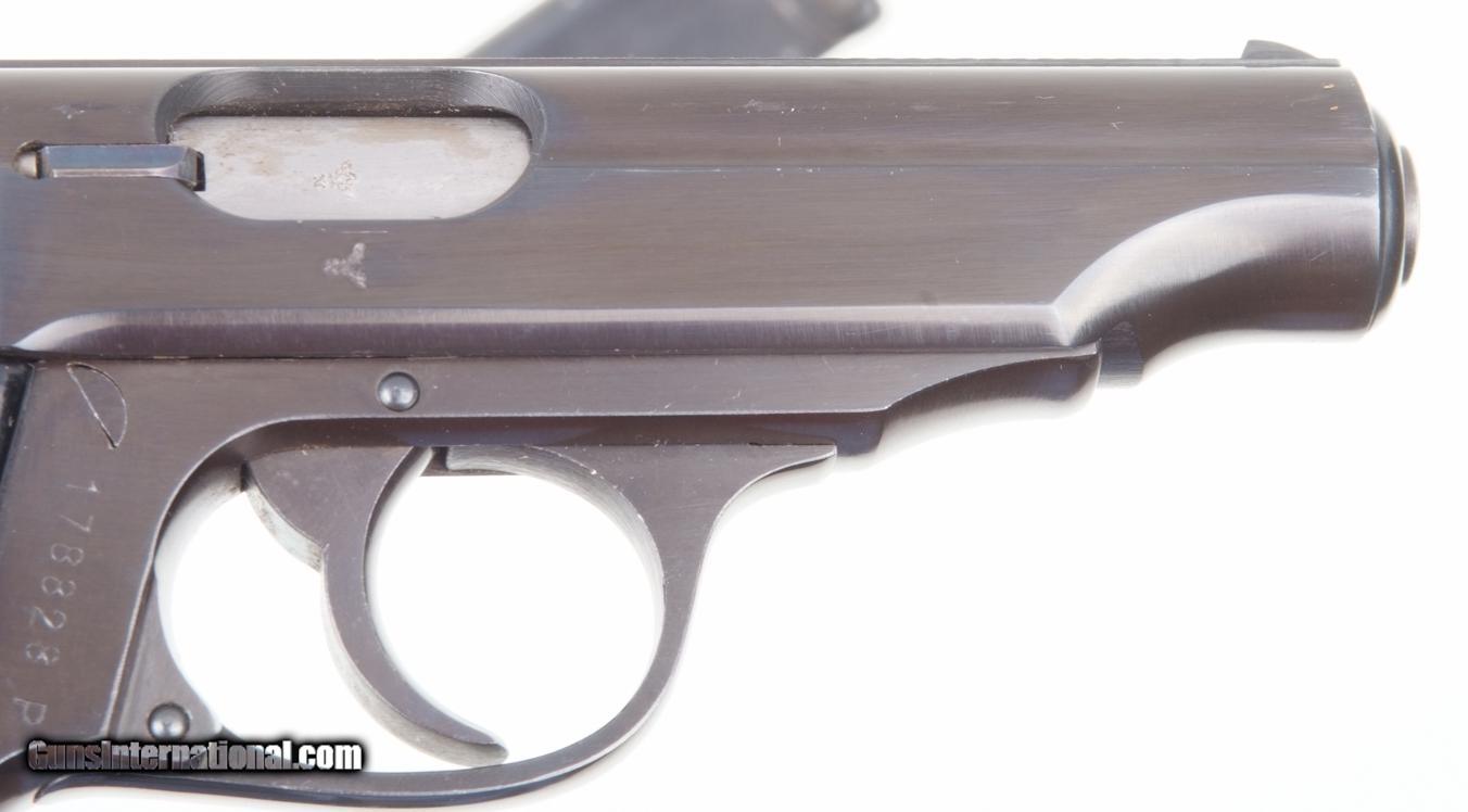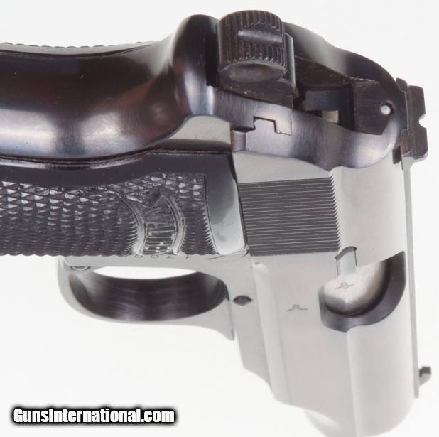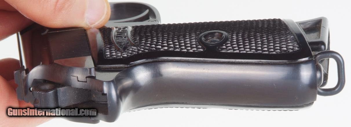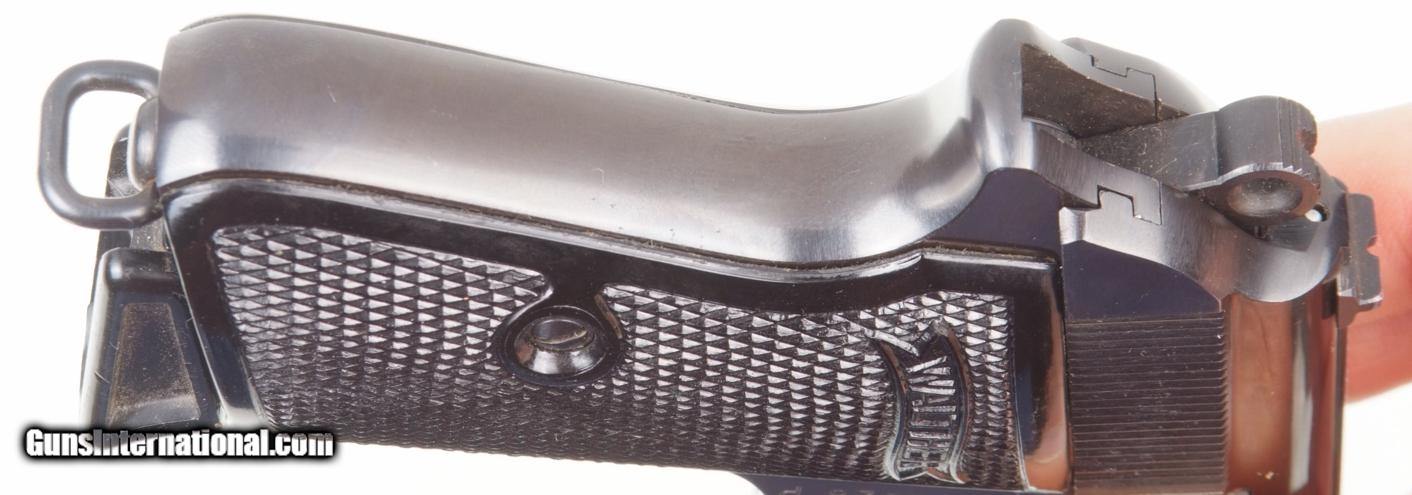 Description: Standard configuration Walther PP with fixed front and drift adjustable rear sight. Left side of matching slide (internally lightly scribed “828”) with usual address. Sixty degree red dot safety. Eagle/N proof on exposed barrel shroud and repeated on slide. Full serial number on right side of frame behind trigger. Standard black plastic Walther banner grips. Factory lanyard ring. Later finger extension magazine with matte body having seven indicator holes whose left side is marked “PP 7.65mm”. NO IMPORT MARKS. Synopsis: Superb Walther PP, Hi Polish Eagle/N with lanyard ring and finger extension magazine. Condition: 99++% original salt blue finish having the most minute marks. No discernible wear on front or backstrap. Grips are as new. Magazine in same condition. Mirror bore. Perfect manual mechanics. An absolutely superb Wartime Commercial, Nazi Era, Walther PP with factory lanyard ring. A HISTORIC INVESTMENT! ~~Insured shipping fee of $65; most packages shipped using FedEx 2nd Day.~~ SOLD Manufacturer: Walther Serial Number: 178828P Caliber Info: 7.65mm |
