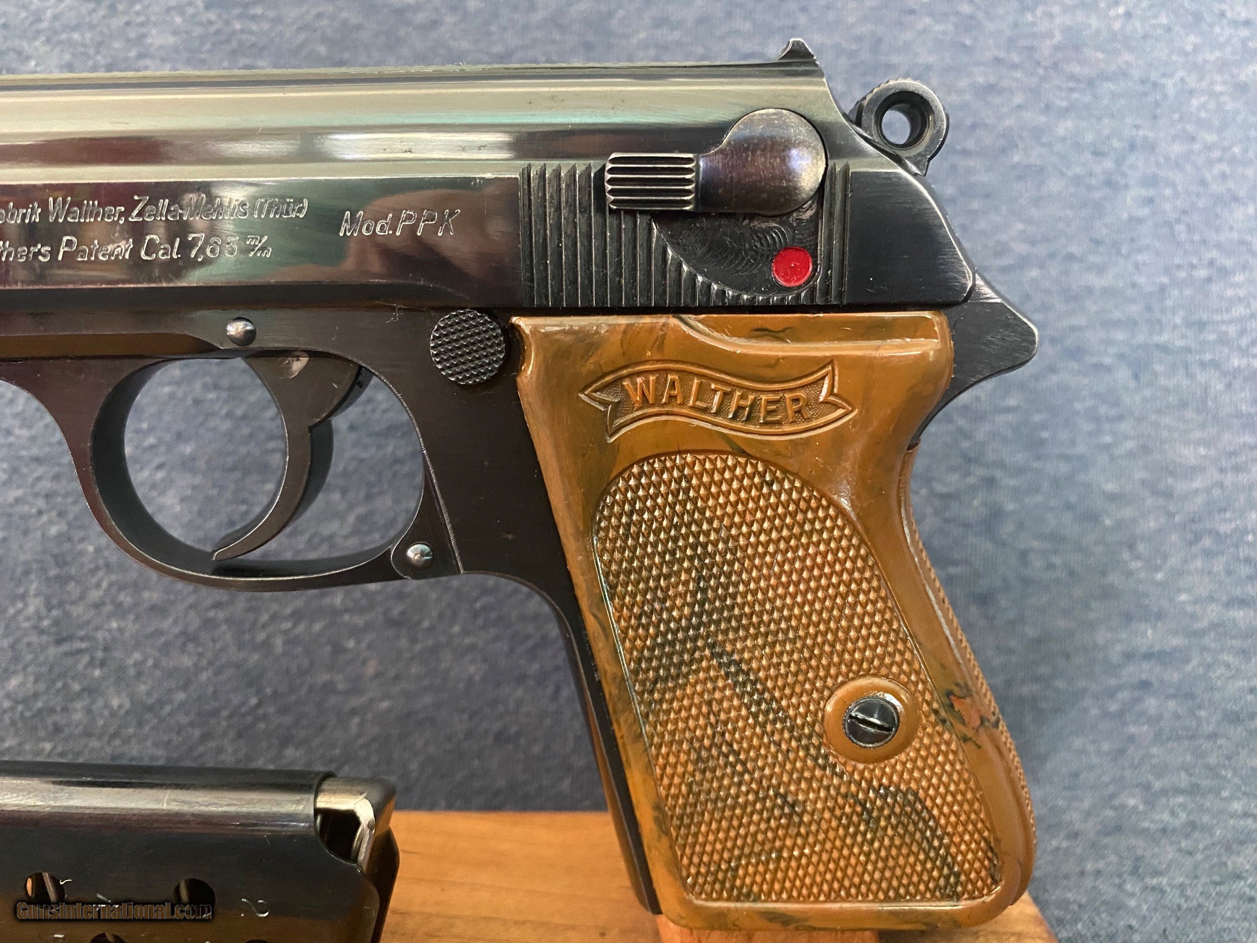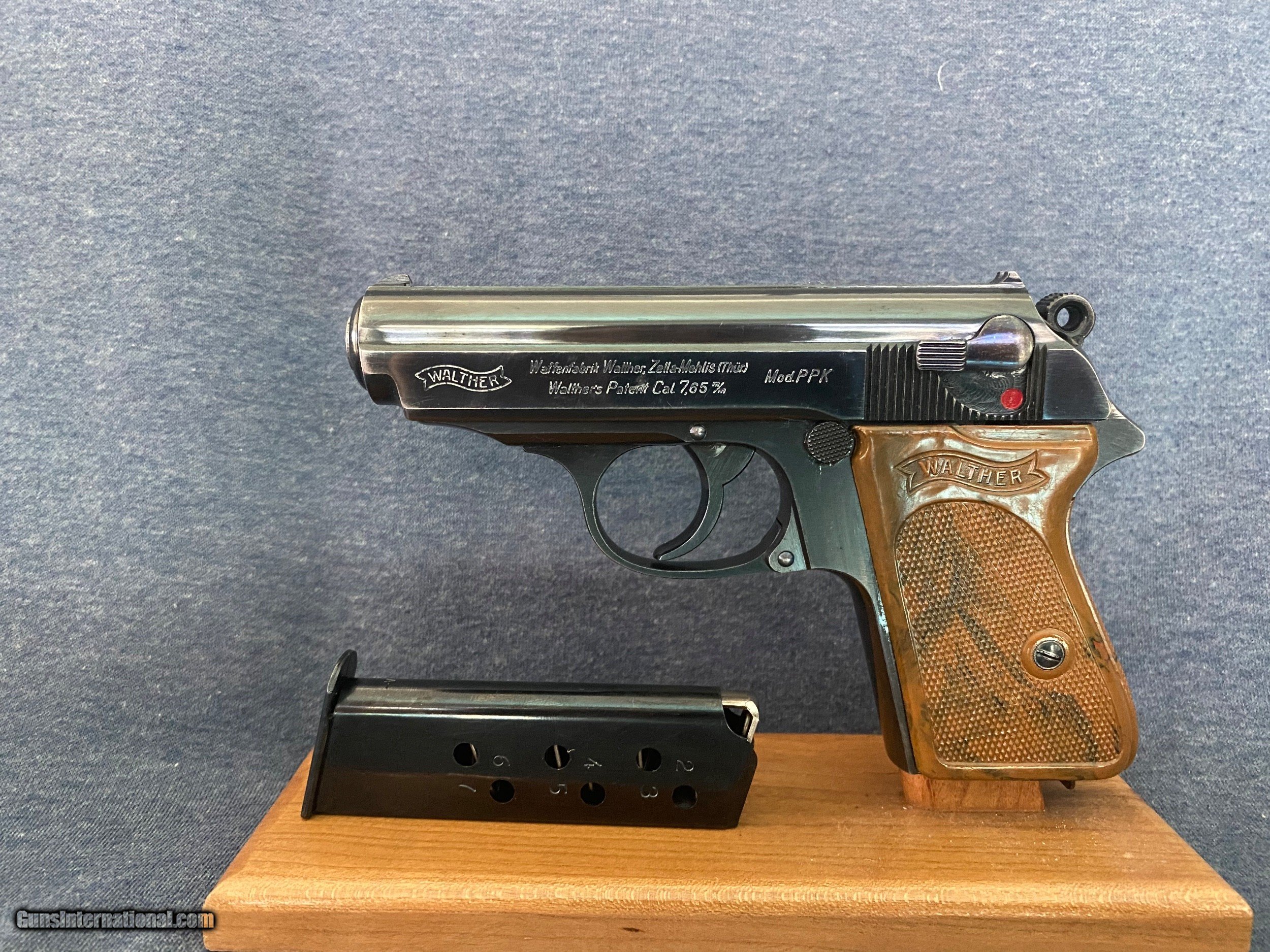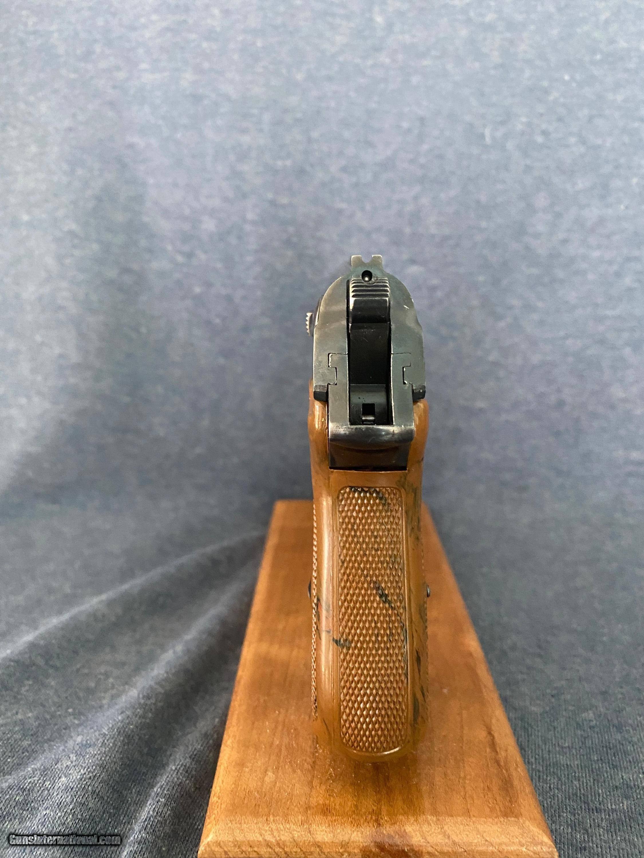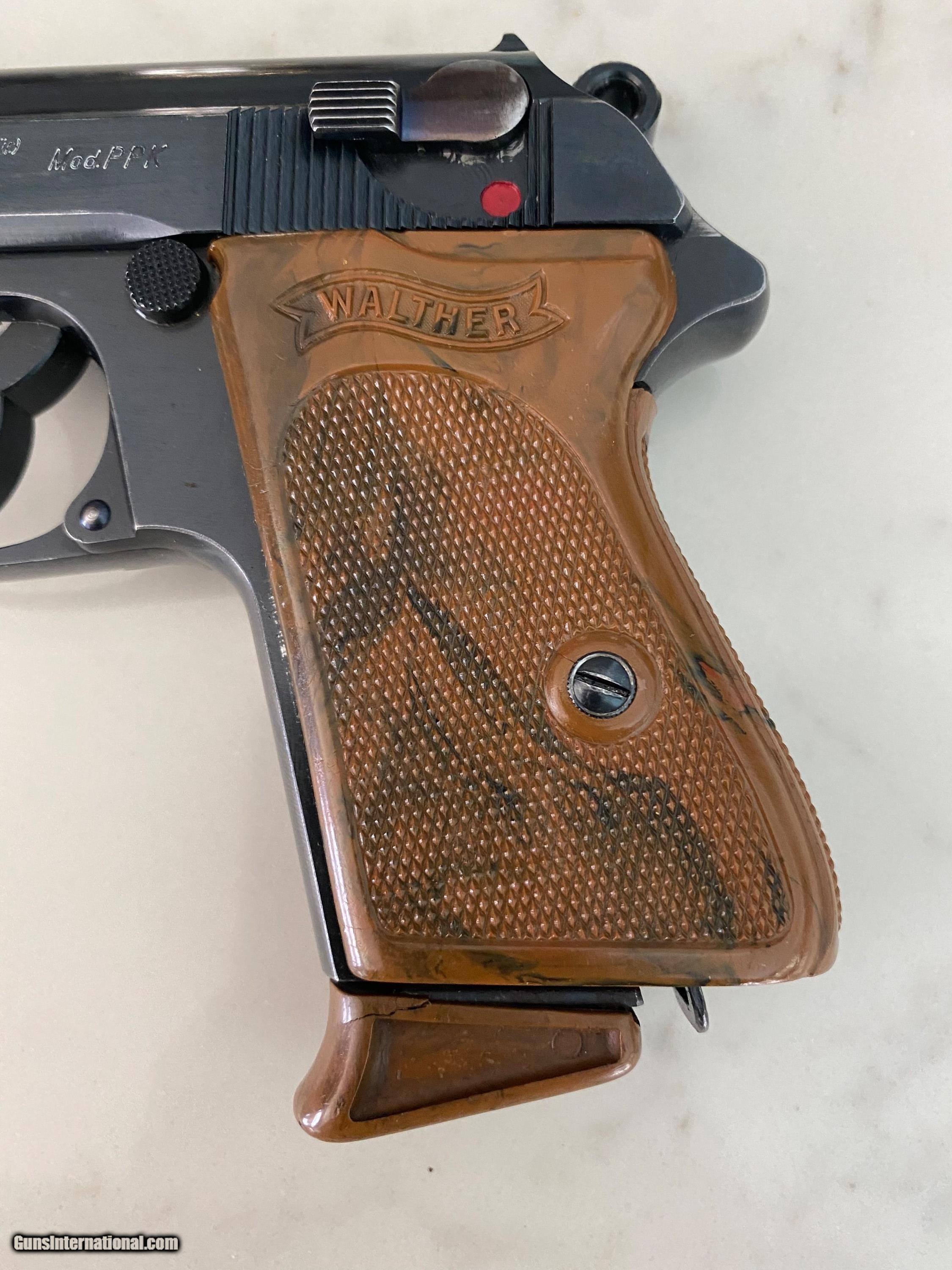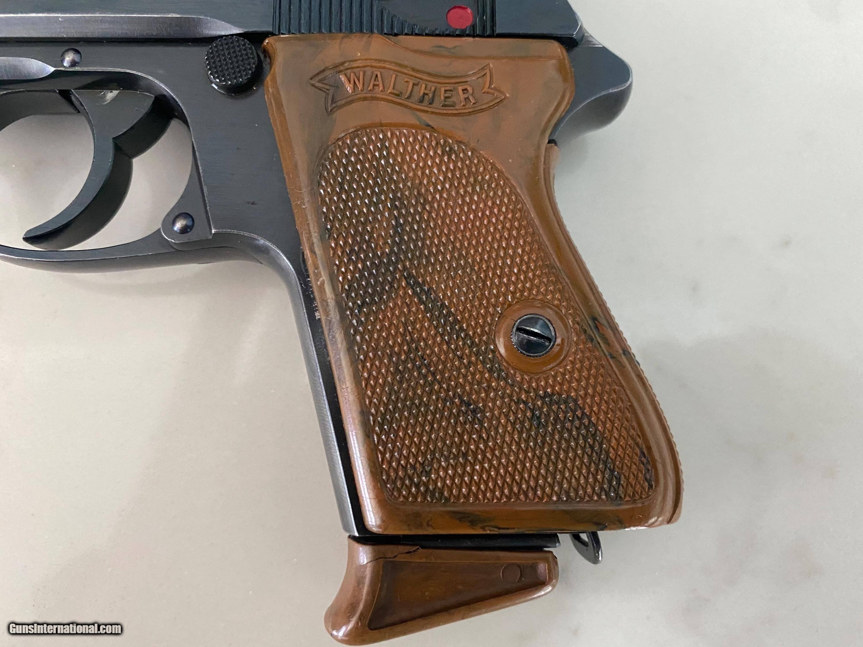 Description: Another, Price reduction! This is is an excellent example of a walther ppk from 1935 when they were still making the beautiful high polish finish this pistol is all original and has a fire blue safety! Look and the color! The grips are a beautiful swirl of brown and black absolutely perfect with no cracks or defects of any kind! See photos this pistol has only a little wear from holster, this pistol was likely owned by a Nazi or other official in order to have this in 1935 it was very common for high ranking officers of the German military buy there own weapons on the commercial market a very sharp looking pistol in awesome shape and is rated at 96% 3 day inspection period purchase price refunded less shipping shipping both ways and any fees usps money orders only accepted bank checks and personal checks ok. ##### comes with magazine ithat is now a correct proper Walther banner only prewar finger extension mag see photos comes with one magazine not the after market mag pictured with the gun. $85 insured 2 day shipping from my ffl to yours I am not a dealer I am a collector and this pistol is from my personal collection you will not be disappointed this pistol is in excellent condition and is worth more than the asking price.the grip is the early type very beautiful with great coloring very rare call me if interested usps money order only SOLD Curio/Relic: Yes |