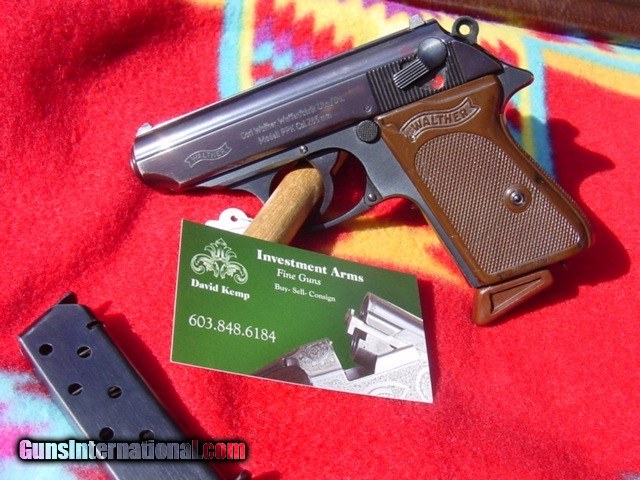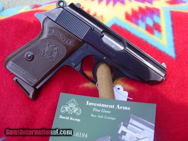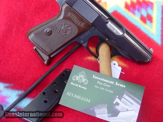 Description: SOLD ! Walther PPK German made, Interarms Import 7.65 mm (32 Acp), 2 mags Nice German made PPK,last of the pre 68 GCA PPK guns-1968 proof date. About 99% blue, grips have the Federal Eagle on right, and Interarms on left, nice condition with a couple small handling marks on left side grip. Comes with 2 mags, one finger rest and one flat bottom and cleaning rod Offered at Reduced $1395, to local NH buyer,can view purchase gun ,after 4473/NICS check,at business premise-please email call first to be sure I am there and gun is available. Paymnet by bank check,USPS Money order or cash-sorry no CC's Non NH buyers can have gun shipped to your FFL-add $45 for USPS Priority Insured to dealer FFL. I can take a C&R(to most states-Not NJ,Kalif or MA) on this however shipping must be Overnight FedEx and per quote. Happy to send more pics,go over gun on phone and of course in person at Premise. Please email your phone number so I can call back if I miss the call-do not do text sorry, thanks. Be sure to look at my other offerings for more guns,Merkel'sMannlicher Schoenauer's, Drillings, Combo's, Colt Saa's, Colt’s, Ruger’s, Browning’s,Kimber’s, Les Baer, Uberti's by both Taylor and Cimarron, and Ferlib, Merkel G&H-Arrieta,Grulla,Beretta,Parker Repro shotguns and other fine guns. Inventory always changing be sure to check with us for any needs. Local New Hampshire Buyer can view/purchase gun in person-after 4473/ NICS check, at Investment Arms business premise in New Hampshire Country Store, Rt 16 Chocorua NH. Please email/call Business or (603,848.6184 ) first to be sure its not sold. We also Buy and Consign Guns Payment by bank check, UPS money order-personal check held until clear 10 days. Buyer must provide dealers signed 01 FFL-email or hard copy, I will include a copy of my FFL with shipment. 3 day non firing inspection period(gun must be in same condition if returned)-starts when gun arrives at your dealer, on used guns only-not new guns sorry-they are under factory warranty, buyer pays shipping and insurance both ways if returned. SAFETY NOTICE: Buyer is solely responsible for determining that a used gun is safe to shoot. The firearms offered has been given a visual inspection for collection purpose only. It is a requirement that any used firearm be inspected by a qualified gunsmith before firing. By purchasing the firearm, the buyer agrees to hold seller harmless against damages, injury, or death caused by defective merchandise. SOLD |