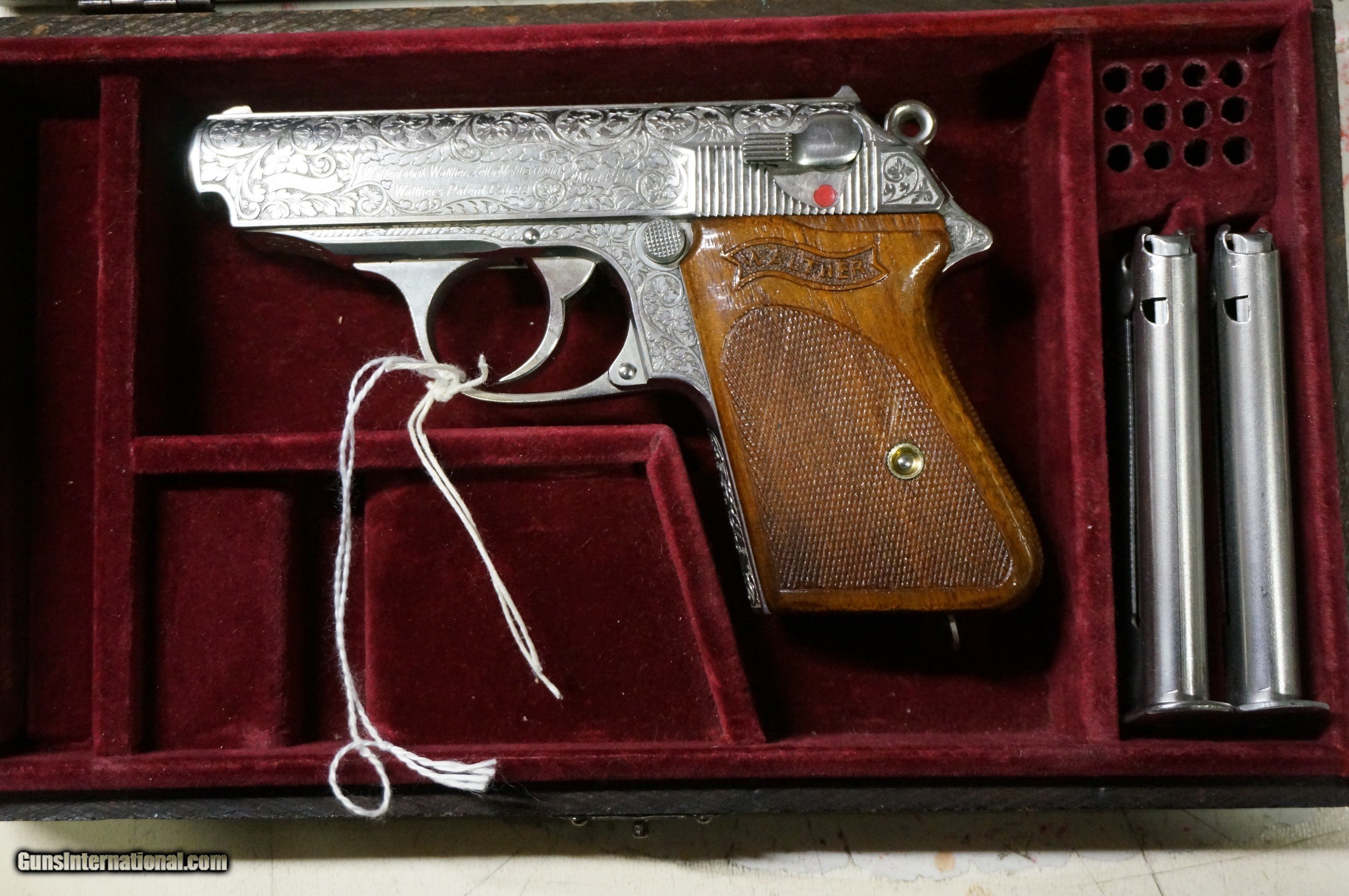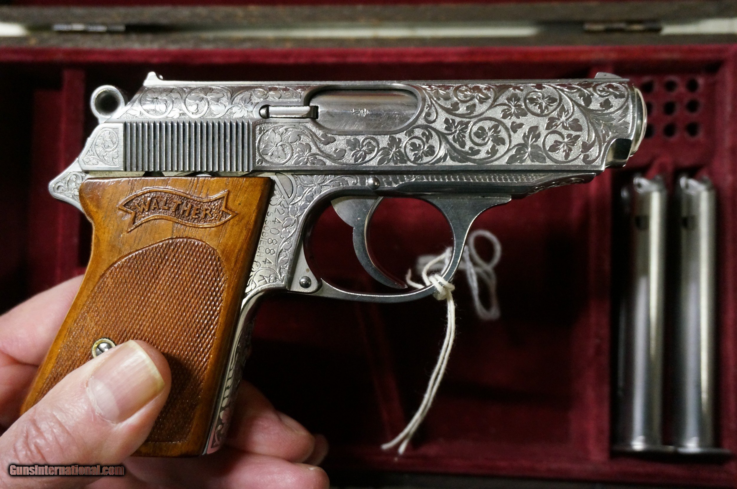 Description: RARE AND UNIQUE ENGRAVED WALTHER PPK 22 WITH ALL THE GOODIES . ONE MAGAZINE HAS SERIAL NUMBER ON BACK OF SPLINE . BOTH MAGAZINES CORRECT PREWAR . BELGIUM STYLE ENGRAVING. I BELIEVE THE FLORAL DESIGN DONE BY BROWNINGS FINEST ENGRAVER. BEAUTIFUL ONE PIECE WOODEN GRIPS ! SOLD |