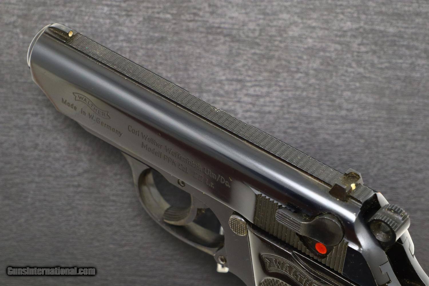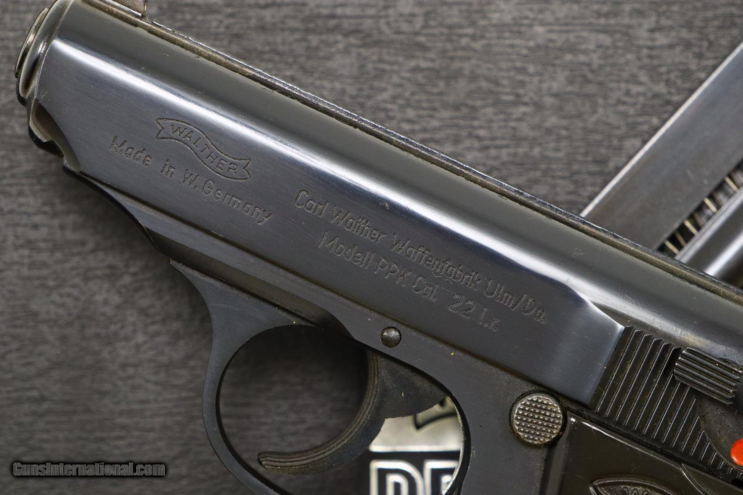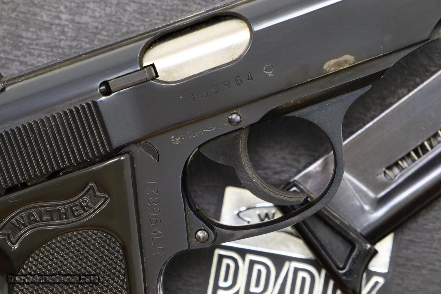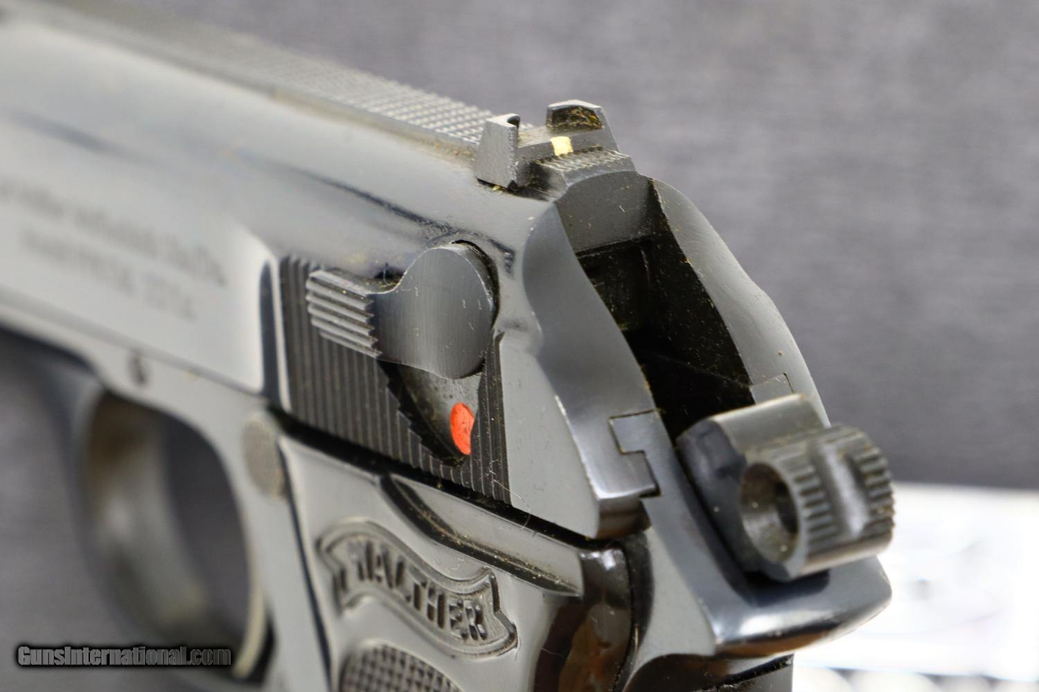 Description: Walther PPK dated “ID” in 1983, caliber .22LR, with white highlighted sights, no loaded indicator, and usual slide address on left side reflecting manufacturer, model, caliber, and manufacuter/location W. Germany. Red dotted safety indicator. Full serial number on right side off slide and frame that is also marked with the year code. Fitted with two piece black plastic grips and black finger extention magazine. Complete with original box, factory label matching pistol. No spare magazine, target, or literature. Synopsis: Walther, Postwar PPK, 22LR, 138964LR, A-1894 Condition: Near EXC with the faintest muzzle wear. Right side of slide with noticeable spot of blue loss as carefully pictured. Mirror bore. Perfect manual mechanics. VG original box with expected scuffing, still retaining both latching tabs. ~~Insured shipping fee of $55; most packages shipped using FedEx 2nd Day.~~ SOLD Manufacturer: Walther Serial Number: 138964LR Caliber Info: .22LR |