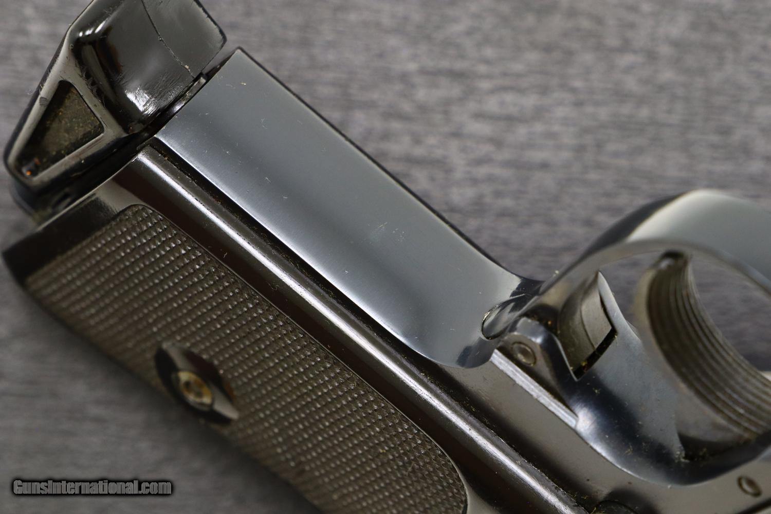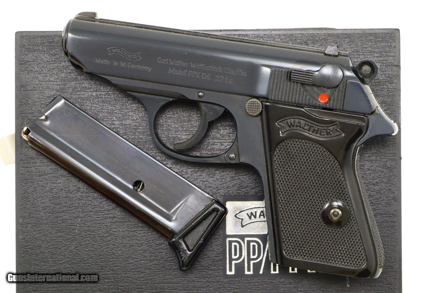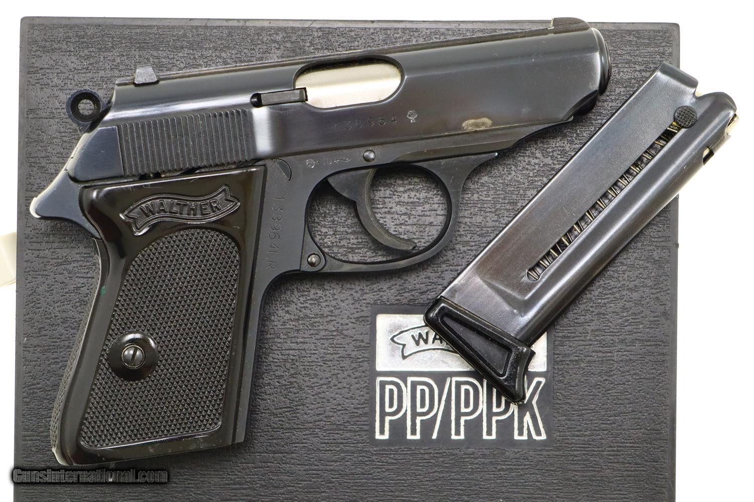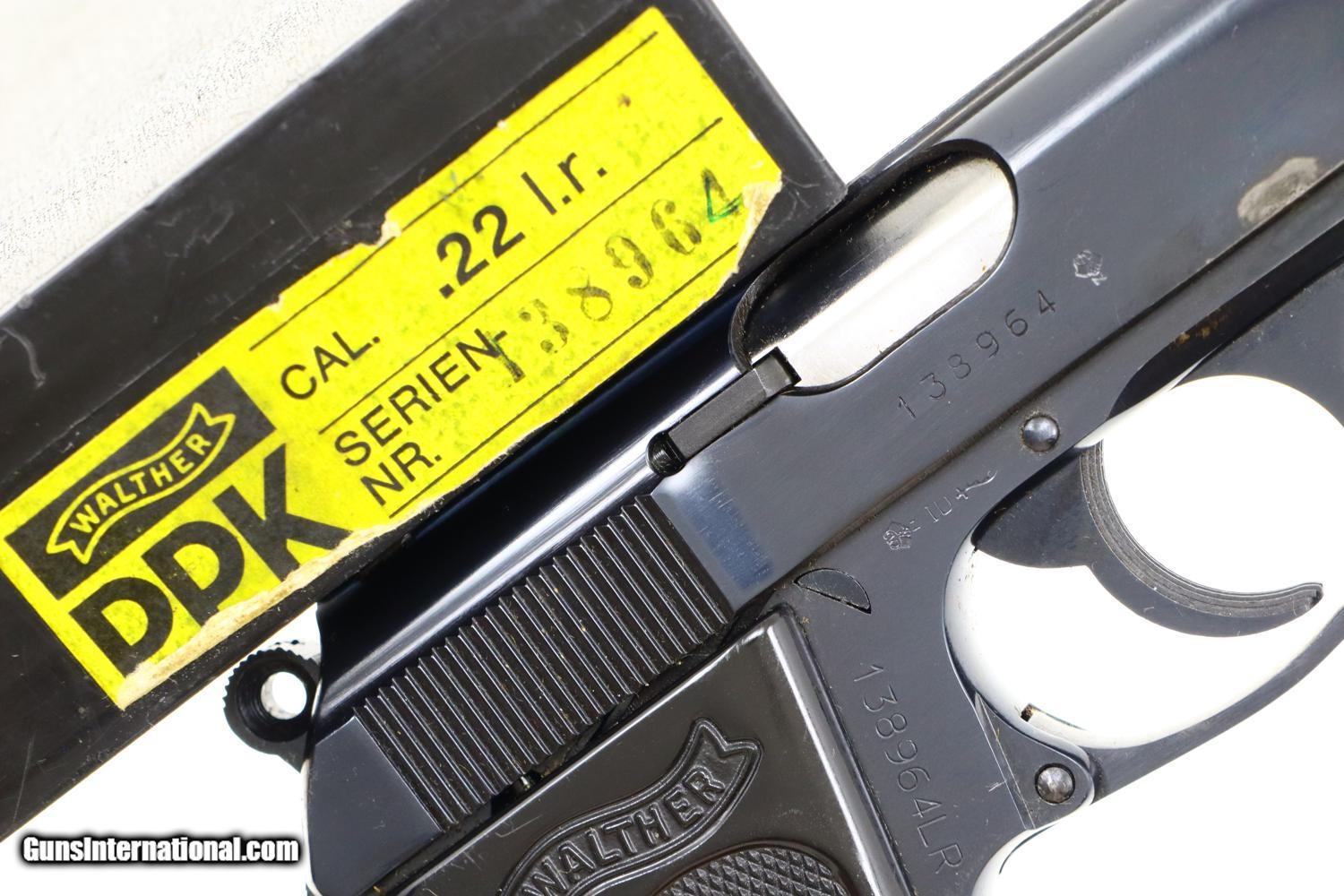 Description: Walther PPK dated “ID” in 1983, caliber .22LR, with white highlighted sights, no loaded indicator, and usual slide address on left side reflecting manufacturer, model, caliber, and manufacuter/location W. Germany. Red dotted safety indicator. Full serial number on right side off slide and frame that is also marked with the year code. Fitted with two piece black plastic grips and black finger extention magazine. Complete with original box, factory label matching pistol. No spare magazine, target, or literature. Synopsis: Walther, Postwar PPK, 22LR, 138964LR, A-1894 Condition: Near EXC with the faintest muzzle wear. Right side of slide with noticeable spot of blue loss as carefully pictured. Mirror bore. Perfect manual mechanics. VG original box with expected scuffing, still retaining both latching tabs. ~~Insured shipping fee of $55; most packages shipped using FedEx 2nd Day.~~ SOLD Manufacturer: Walther Serial Number: 138964LR Caliber Info: .22LR |