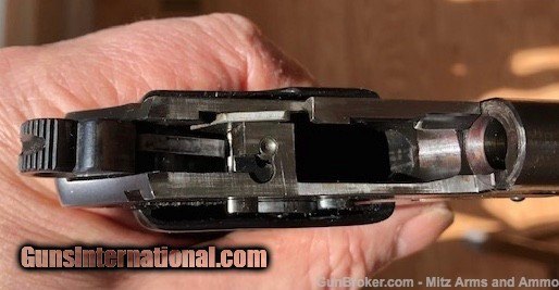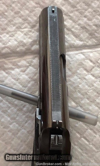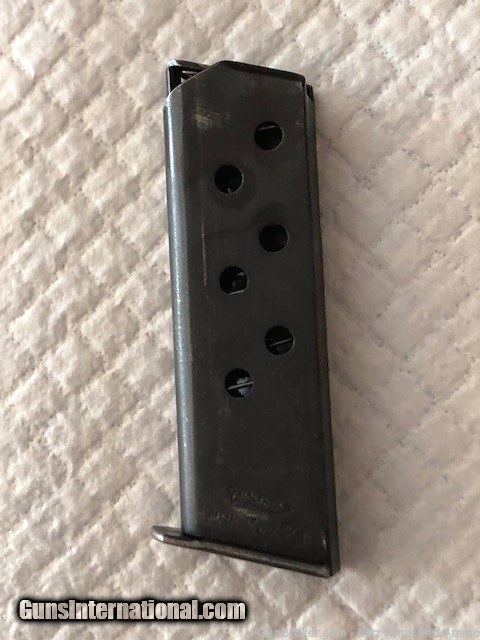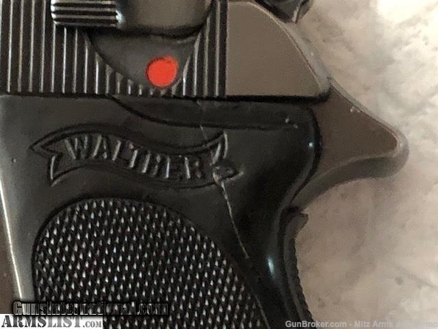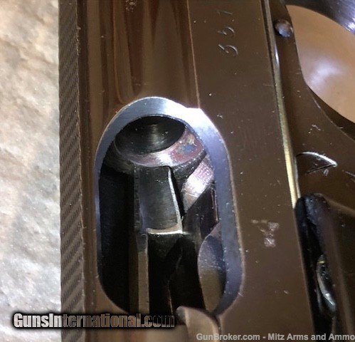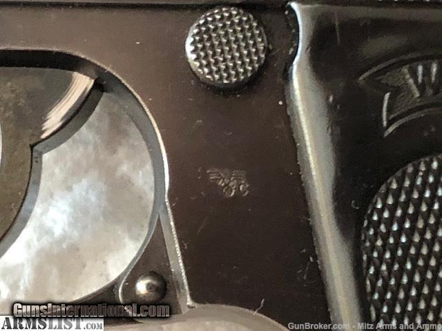 Description: WWll GI Trophy, 1941 Walther PPK in 32acp issued to the German Police as indicated by the " C " proof mark on the frame. S/N 351183 K shows 1941 production. One of the last high polished blue finish war time manufactured. Overall condition is very good showing slight holster wear and a tight crack on each grip panel. There is a small patch of frecking on the slide. One correct magazine. No holster. S/H $35.00 in CON US 3% C/C Fee SOLD Curio/Relic: Yes Handgun Caliber: .32 ACP (7.65x17mm Browning SR) Manufacturer: Walther Model: PPK Serial Number: 351183 K Manufacture Date: 1941 |