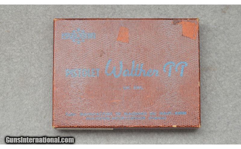 Description: Walther PPK pistol in .380 Auto in excellent condition. This Walther has various German proof marks and checkered factory plastic grip panels. Includes factory pasteboard box with literature and extra magazine. Very few handling marks or signs of use. SN: 129045A .380 ACP SOLD Metal Condition: Excellent Wood Condition: Excellent Bore Condition: "Clean, Good Rifling Barrels: 3 1/4 Butt Pad: Walther Grips Weight: 1 lb 5 oz Item Location: Fort Worth, TX |