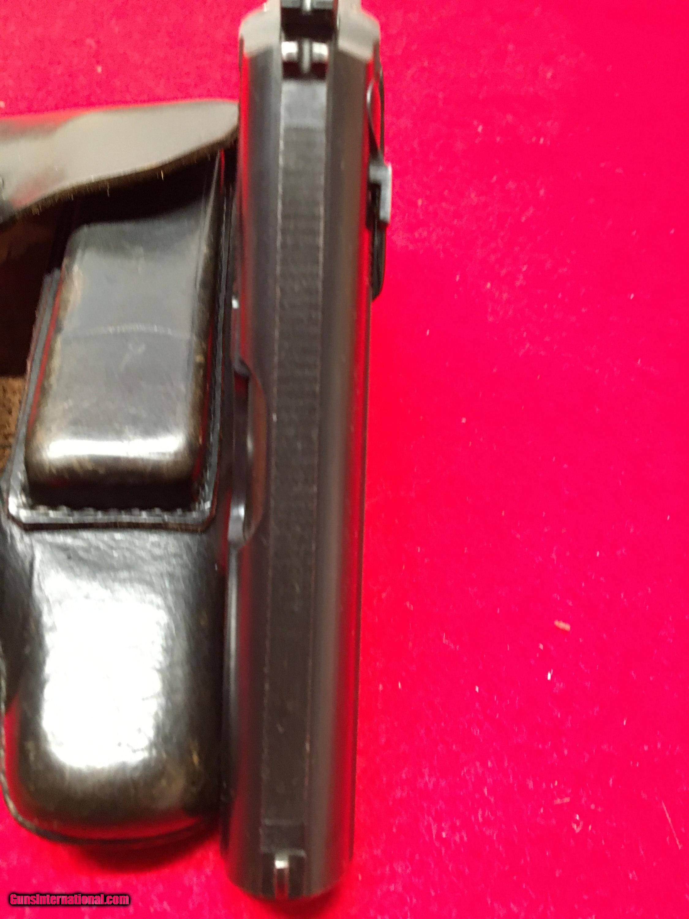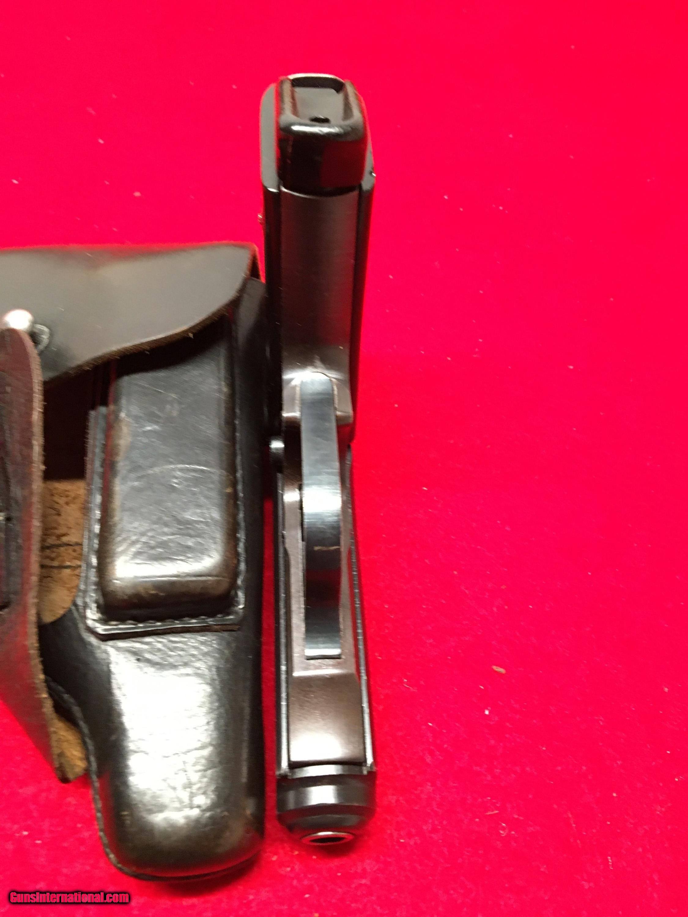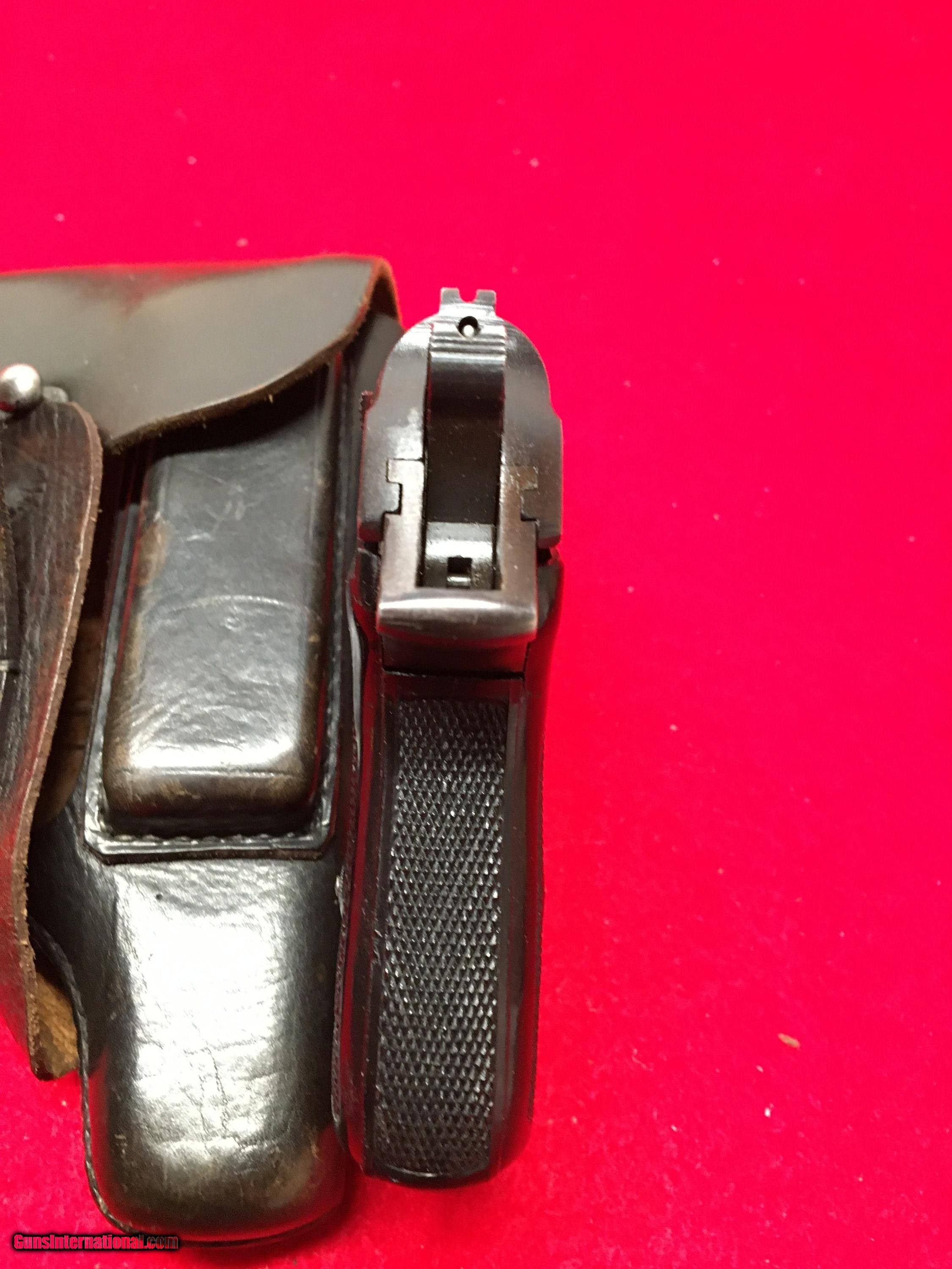 Description: Walther PPK 7.65mm Eagle/C Police with Nazi Eagle over N acceptance proof. SN 360933K, 3rd variation. Mfg 1942. Excellent condition 98/99 excellent bore. Comes with one extend mag and one flat mag in holster. Holster is a correct drop flap, Police mfg for DRGM Albrecht. Kind of Berlin-Nurnberg. These pistols are one of the world's most desired automatic pistols. This is a great rig. SOLD: AS IS. Payment: USPS Money Order, Certified Check, Personal Check. Buyer pays shipping, handling and insurance costs; flat rate $35 SOLD Manufacturer: Walther Model: Nazi Police Serial Number: 360933K Barrel Length: 7.65mm |