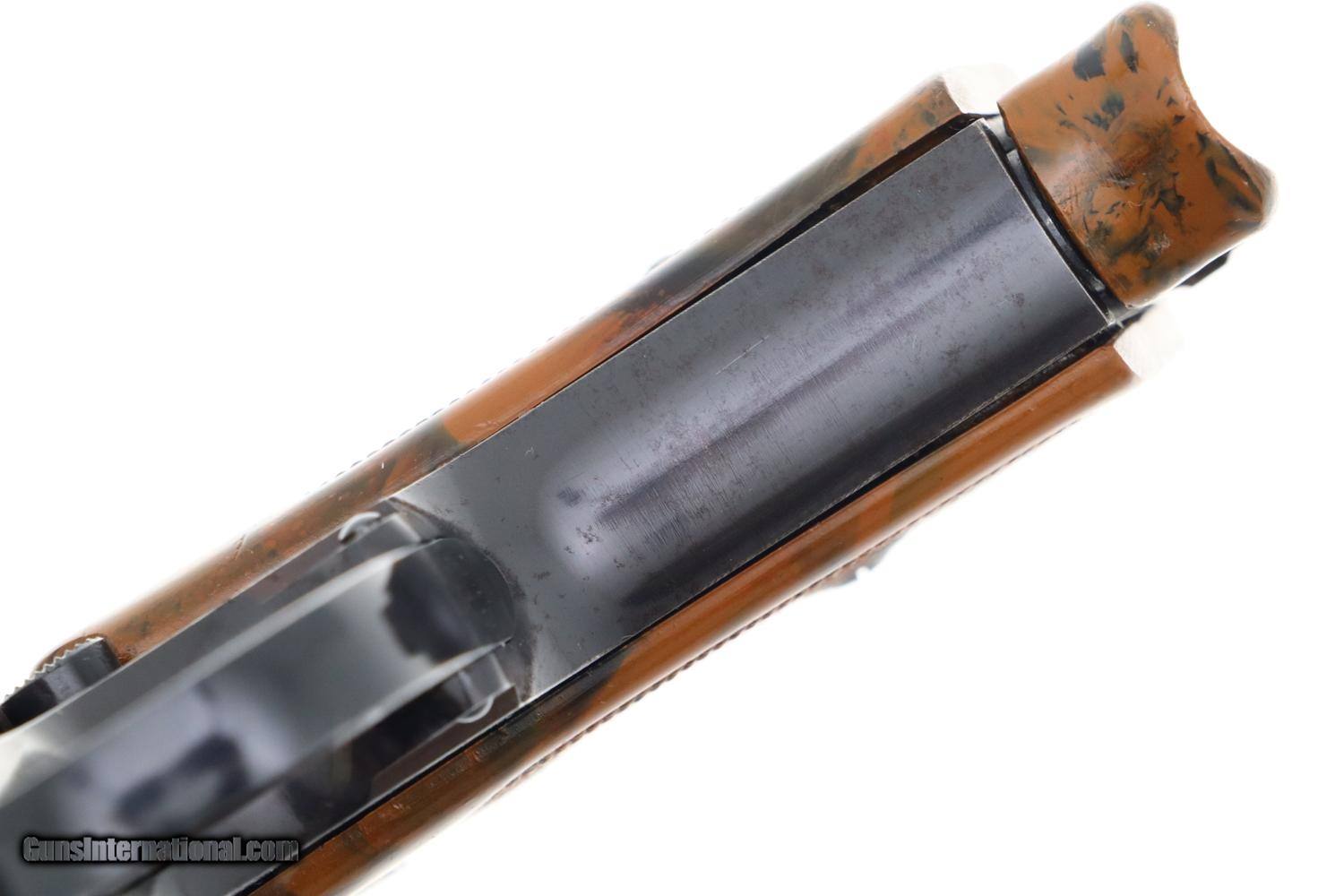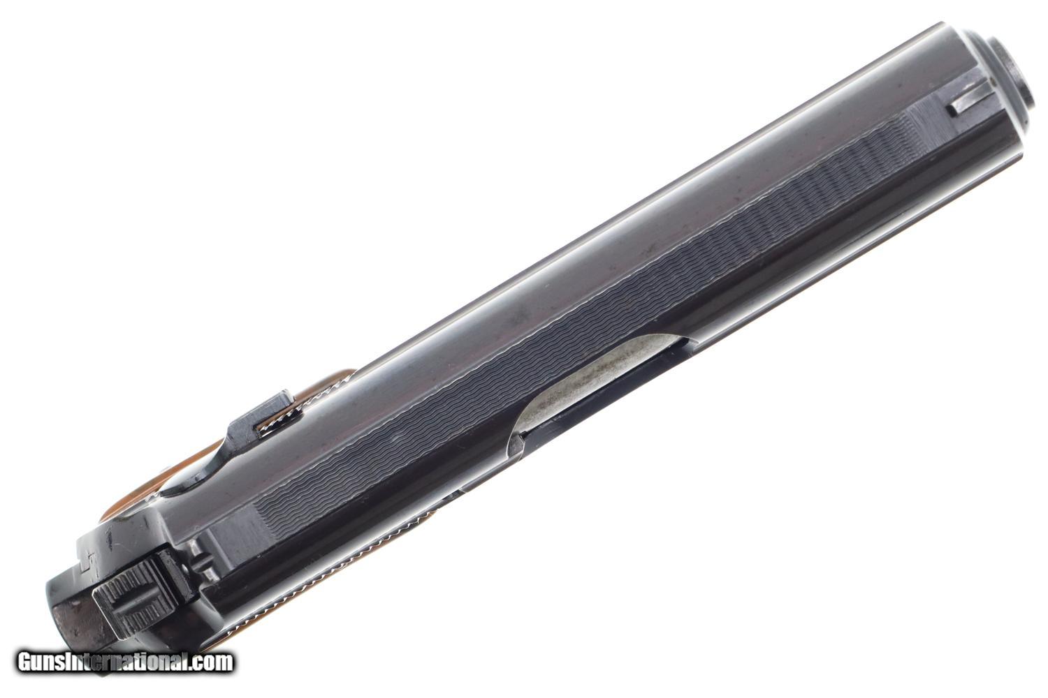 Near excellent original finish with slight muzzle wear and minor spotting as one might expect from a police pistol that has been carried in holster. No significant thinning of front strap. Comparable condition grips with minimal bowing. Tiny crack extending through reinforcement above left escutcheon and superficial marring of left panel near tang. Comparable condition magazine. Mirror bore. Perfect manual mechanics. VG/EXC capture papers. A very nice, all original, no excuse, Na*i police pistol from WWII with capture papers.