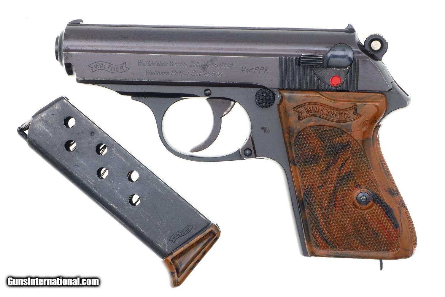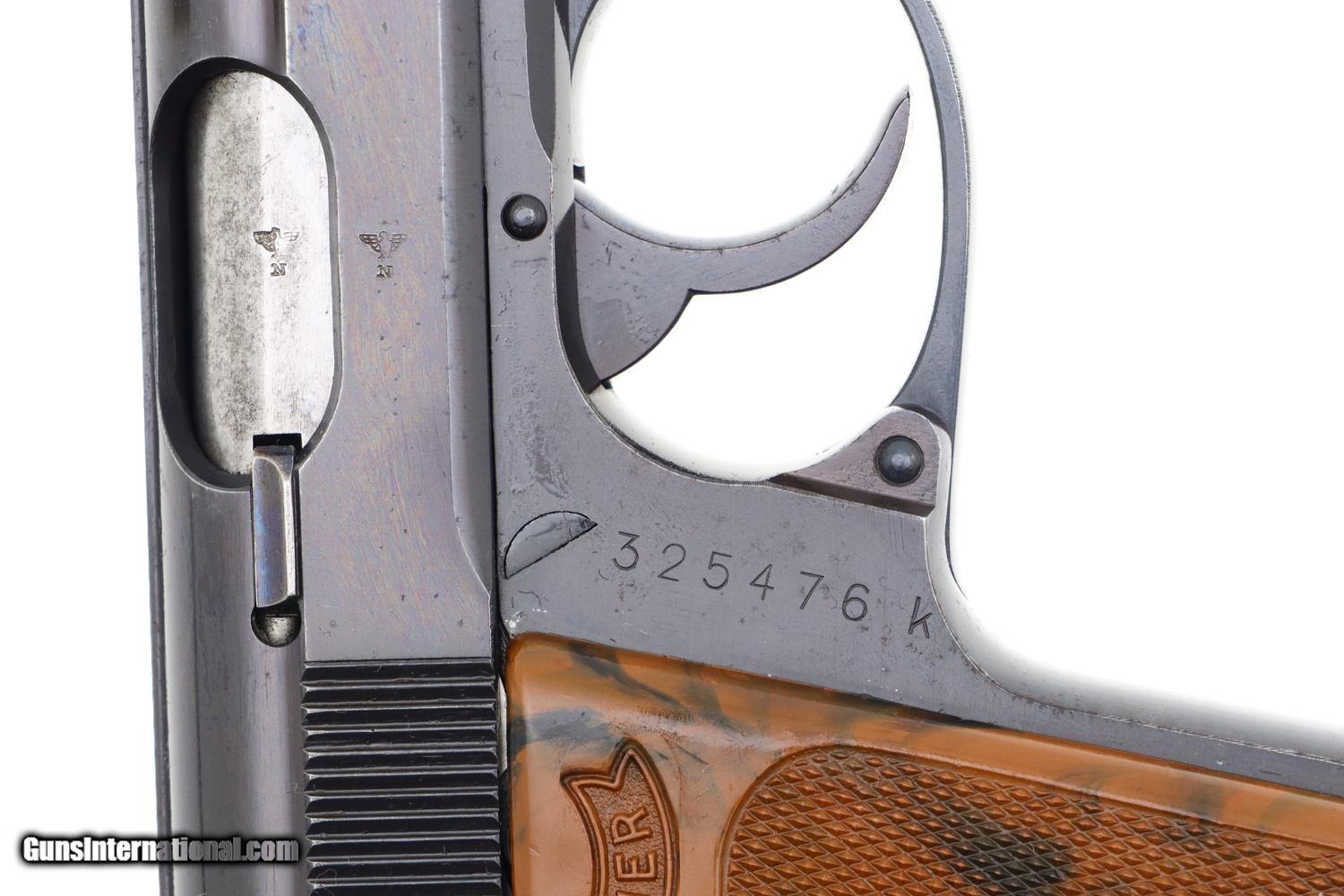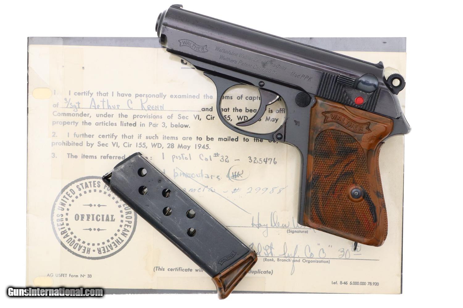 Scarce and desirable Walther PPK, Police Eagle/C pistol, early WWII with high polish finish, Eagle/N acceptance, matching slide, finger extension magazine, and original capture paper calling this pistol out by serial number. Standard configuration pistol with fixed front and rear sights. Loaded indicator present. Usual Walther banner followed by manufacturer, model, and caliber on left side of slide. Eagle/N proofs on exposed barrel boss and right side of slide. The left side of frame stamped Eagle/C. The full serial number appears on the right side of the frame with the last three digits coarsely scribed inside the slide. The matte finished magazine with 6 indicator holes, has the Walther banner on the left side, and fitted with the brown mottled finger extension. Original capture paper dated October 10, 1945.