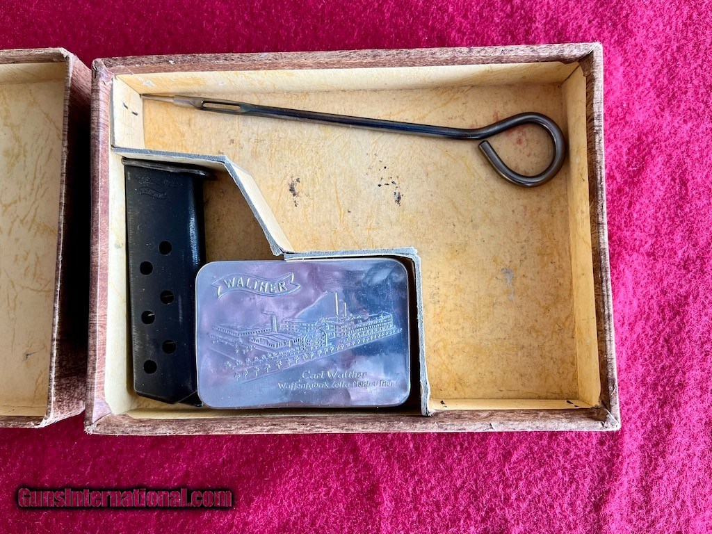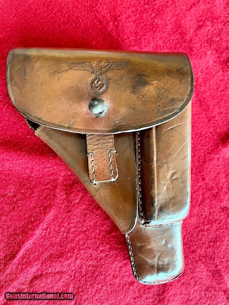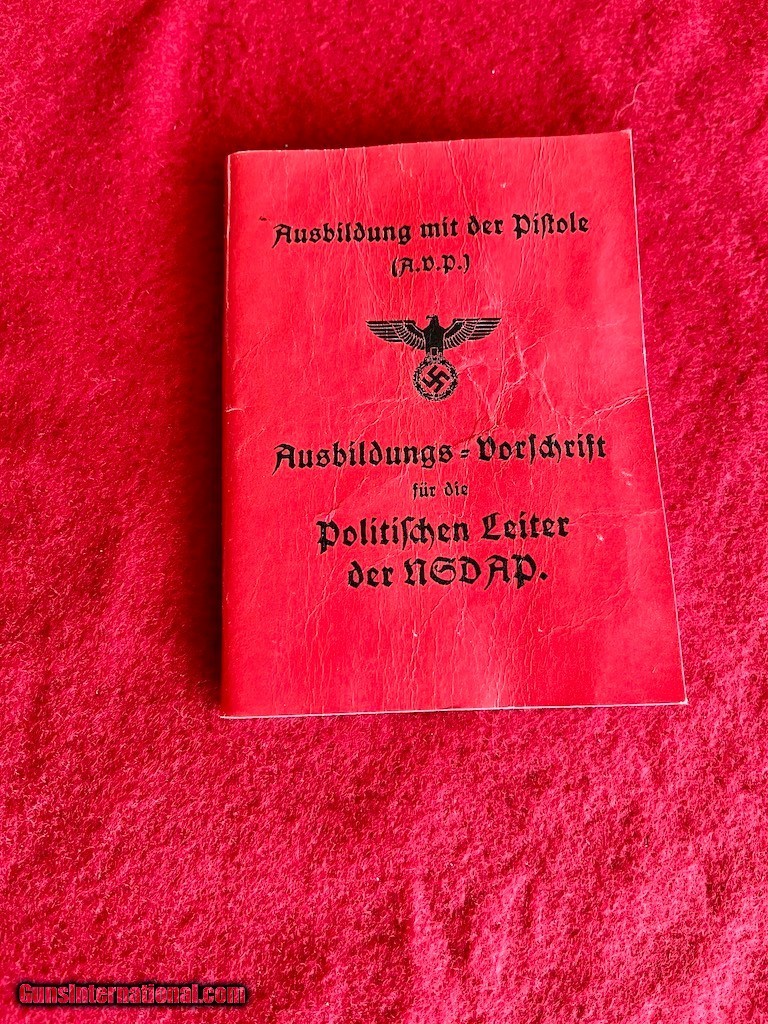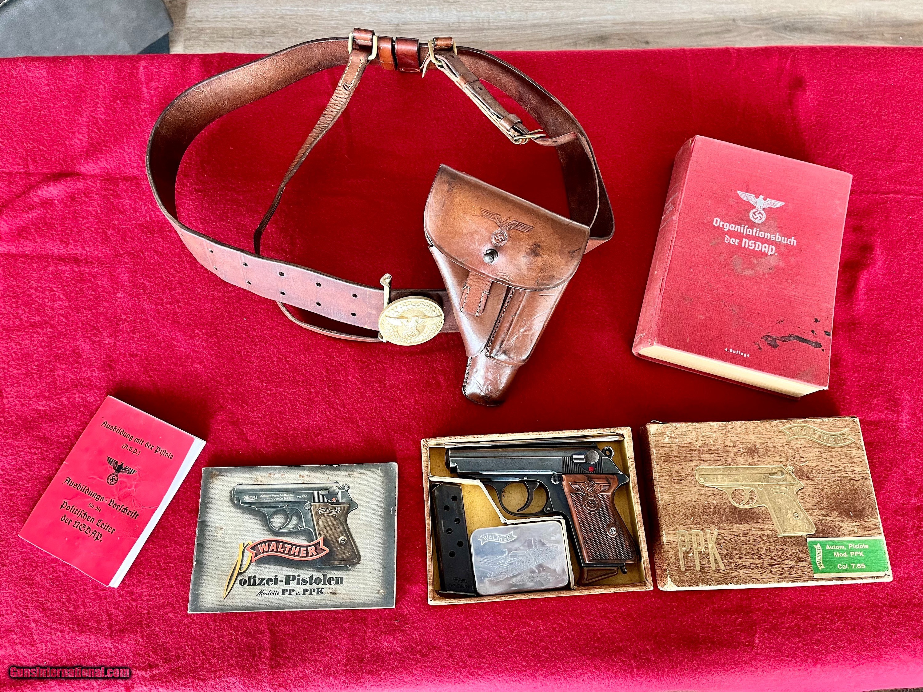 Description: This was part of my stepfather's collection. A wonderful and rare Party Leader Walther PPK in the original, matching box (numbered to the pistol) with the original Party Leader holster, belt, and buckle. The gun is all original finish. The bore is MINT, and all numbered parts are matching. The serial (230xxxk range) dates to 1939, which is in the correct range for the issuance of the Party Leader "Honor" Grip. The grip is in excellent condition with no visible cracks. I have included an image showing the correct weight of the original PL grips. The gun has one finger extension magazine and one spare flat bottom magazine. The box also has the early cleaning tin with the original oil bottle and horse hair inside. The original cleaning rod is present. Finally, it has an original manual dated 4/1939. The Party Leader belt, buckle, and holster are all correct, and the belt and buckle are RZM-marked and maker-marked. The Party Leader holster is marked with a strong, original Party Leader eagle on the top of the flap. He also found an original Organization Book of the NSDAP and a reprint of the Party/Political Leader Manual. This entire collection is a MUST-HAVE for any WW2 enthusiast or collector and is quite possibly a once-in-a-lifetime opportunity. SOLD Handgun Caliber: 7.65x22mm Parabellum (7.65x22mm Luger, .30 Luger) |