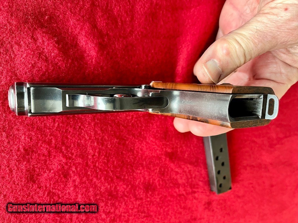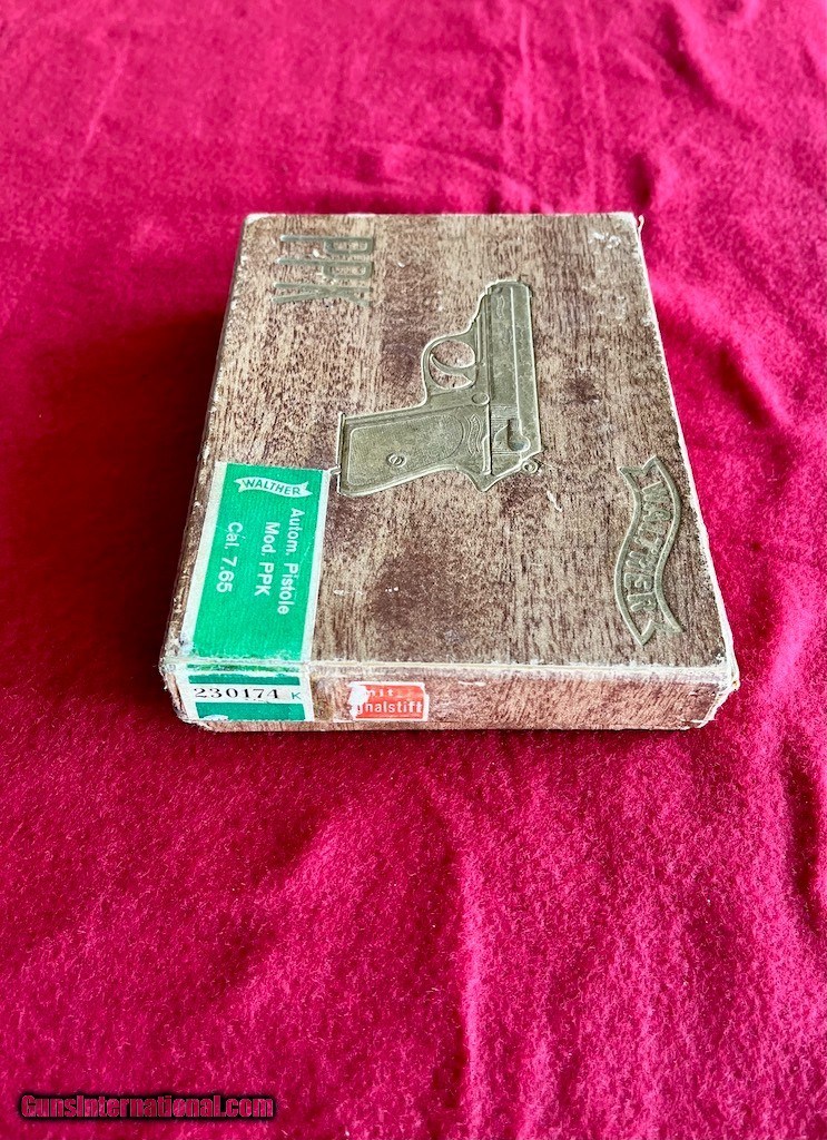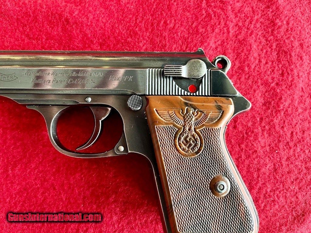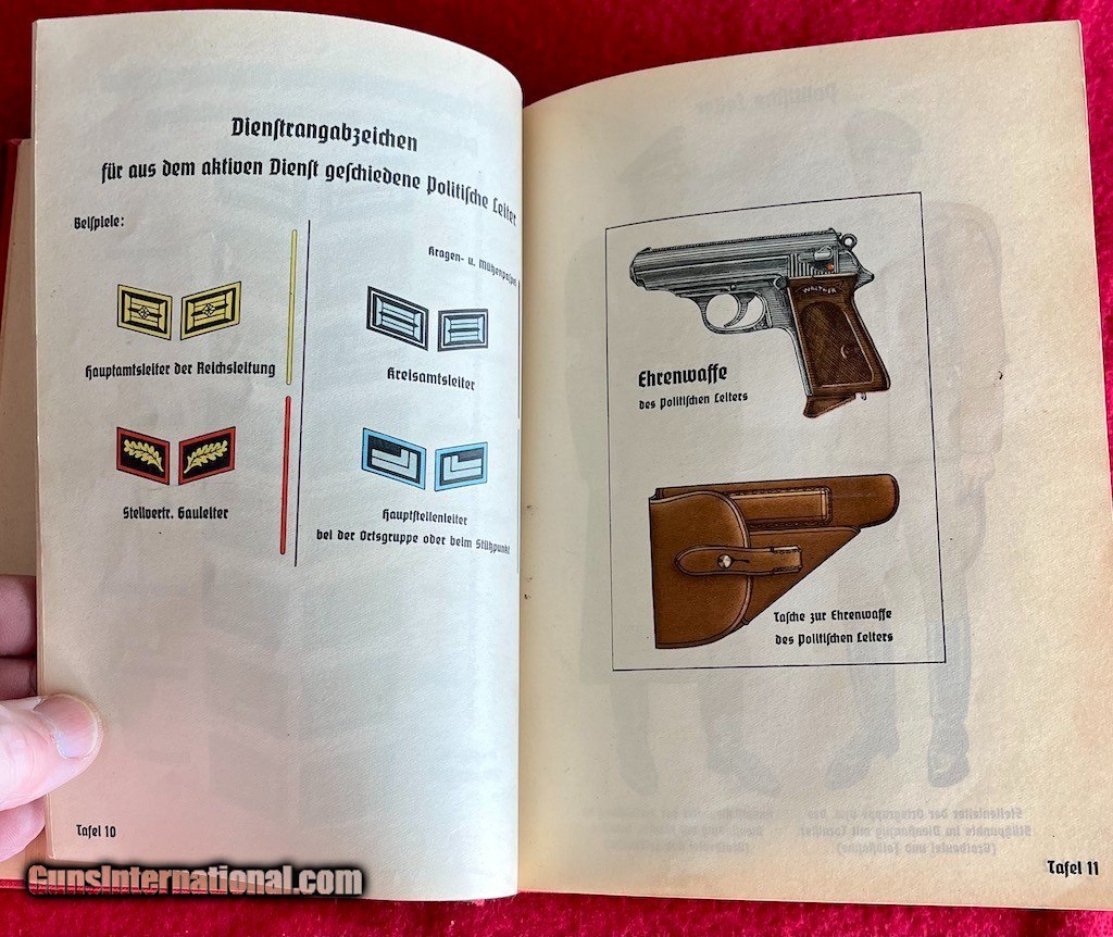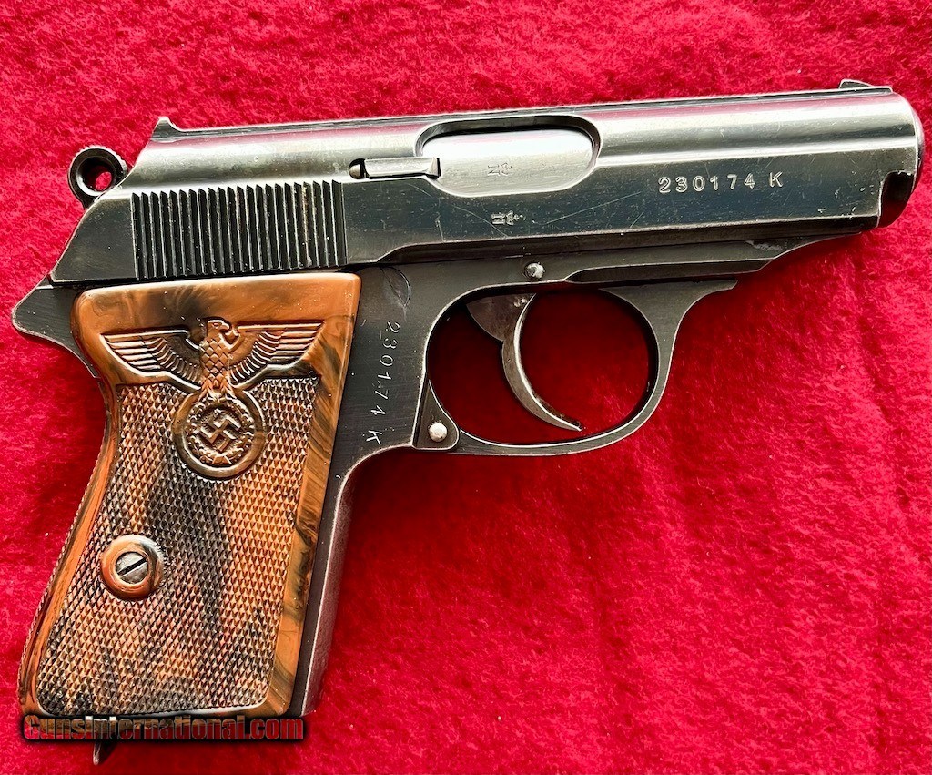 Description: This was part of my stepfather's collection. A wonderful and rare Party Leader Walther PPK in the original, matching box (numbered to the pistol) with the original Party Leader holster, belt, and buckle. The gun is all original finish. The bore is MINT, and all numbered parts are matching. The serial (230xxxk range) dates to 1939, which is in the correct range for the issuance of the Party Leader "Honor" Grip. The grip is in excellent condition with no visible cracks. I have included an image showing the correct weight of the original PL grips. The gun has one finger extension magazine and one spare flat bottom magazine. The box also has the early cleaning tin with the original oil bottle and horse hair inside. The original cleaning rod is present. Finally, it has an original manual dated 4/1939. The Party Leader belt, buckle, and holster are all correct, and the belt and buckle are RZM-marked and maker-marked. The Party Leader holster is marked with a strong, original Party Leader eagle on the top of the flap. He also found an original Organization Book of the NSDAP and a reprint of the Party/Political Leader Manual. This entire collection is a MUST-HAVE for any WW2 enthusiast or collector and is quite possibly a once-in-a-lifetime opportunity. SOLD Handgun Caliber: 7.65x22mm Parabellum (7.65x22mm Luger, .30 Luger) |
