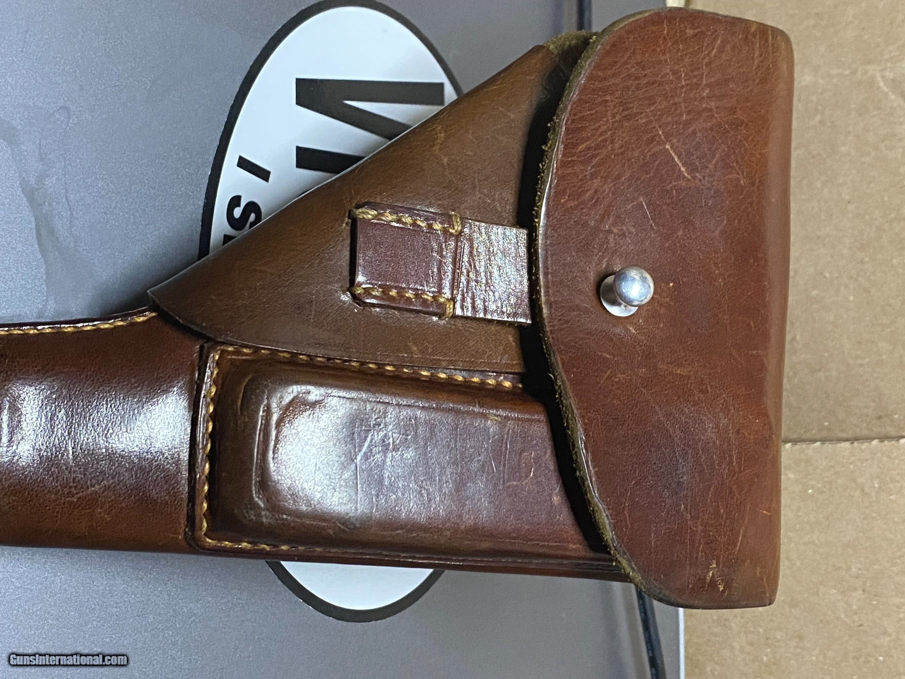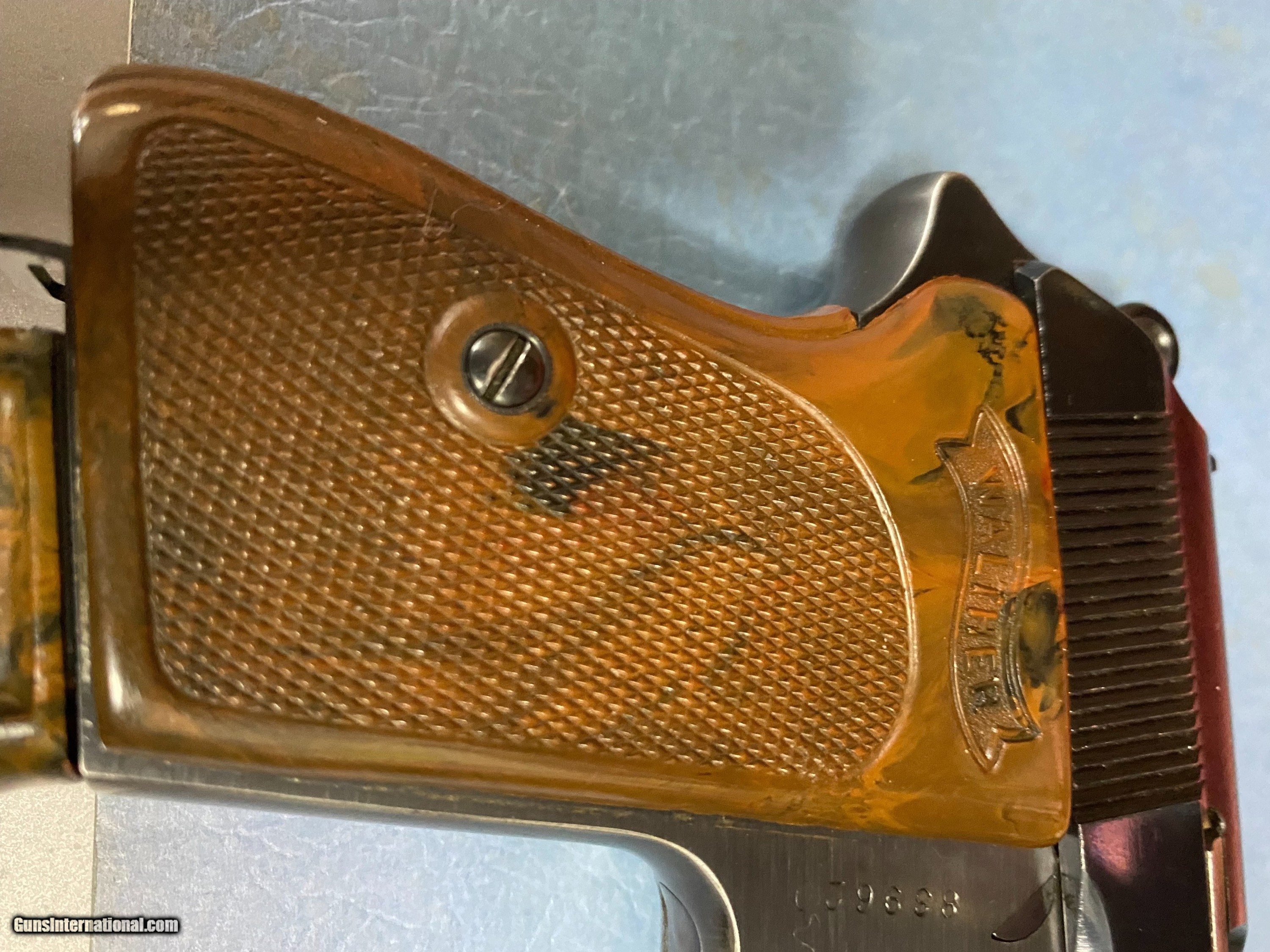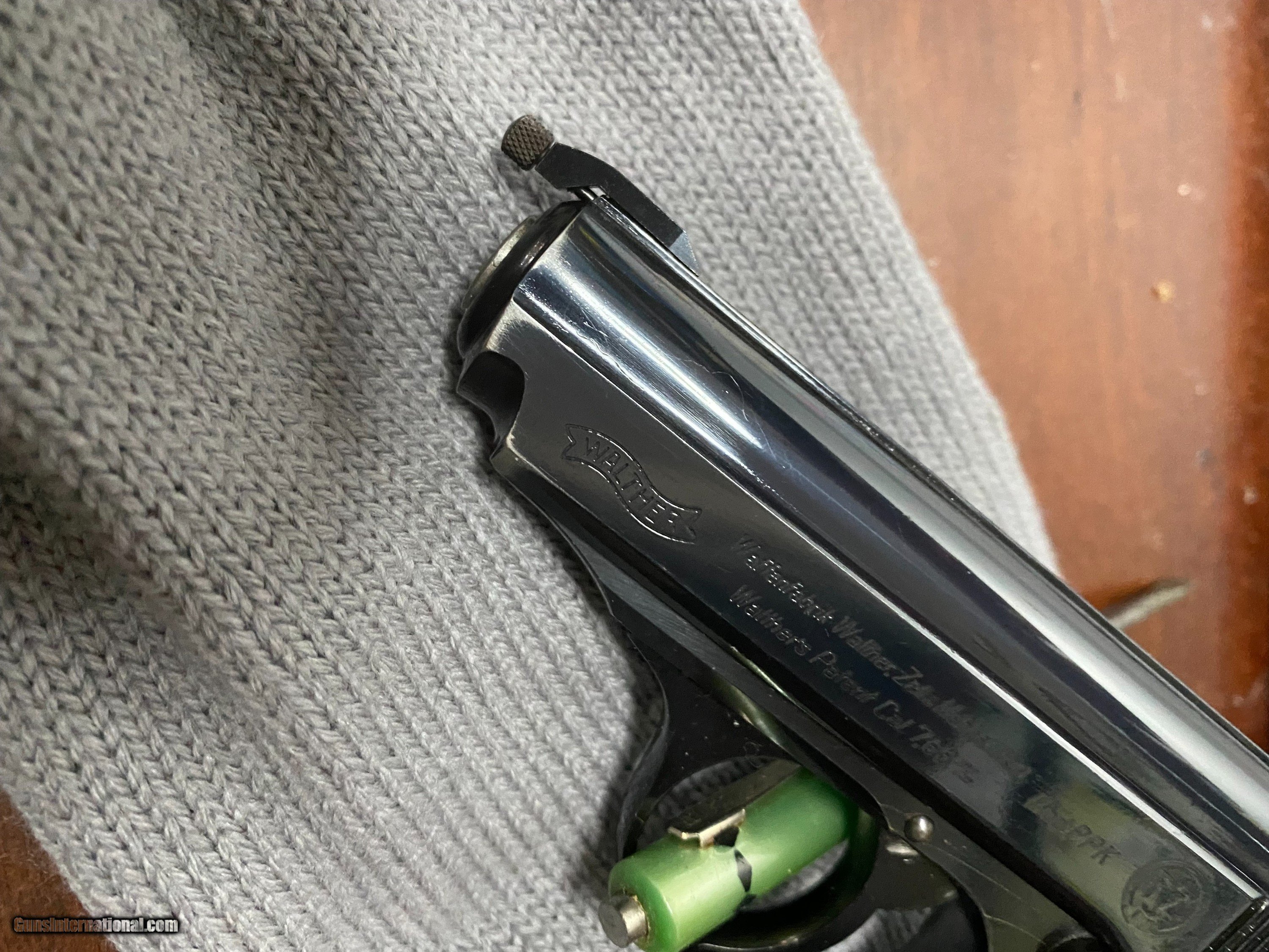 Description: WALTHER 893620 PPK RZM "RZM" Marked Pre-World War II Walther PPK Semi-Automatic Pistol with Scarce Radium Night Sight and Holster Walther PPK Semi-Automatic Pistol and Holster Manufacturer: Walther Model: PPK Gauge: 7.65 mm auto Barrel: 3 1/4 inch round Finish: blue Grip:: Excellent, retains 97% plus of the original blue finish with some very light holster type wear on the leading edges and some very slight thinning on the front strap. The grip is very fine with slight warping on the bottom, minimal handling marks and crisp checkering. Mechanically excellent. The holster is excellent with minimal wear. Description: The Reichszeugmeisterei (RZM) served as the quartermasters office of the National Socialists and later became the chief authority on textiles in the Third Reich. Radium night and notch sights, and standard markings, with "crown/N" proofs on the barrel, chamber hood and slide, and the addition of the etched circular "RZM" logo on the left side of the slide between the model marking and the serrations. Serrated ring hammer, 90 degree safety and checkered brown plastic "WALTHER" banner grips with matching colored grip extension on the magazine. Will ship to FFL Only. Shipping $ 50.00 THIS WILL BE THE LOWEST I WILL GO. NEED TO MOVE THIS ONE AND THE OTHER 2 ON THIS SITE TO MAKE ROOM. SOLD Curio/Relic: Yes Handgun Caliber: .32 ACP (7.65x17mm Browning SR) Manufacturer: Walther Model: PPK Serial Number: 807248 |