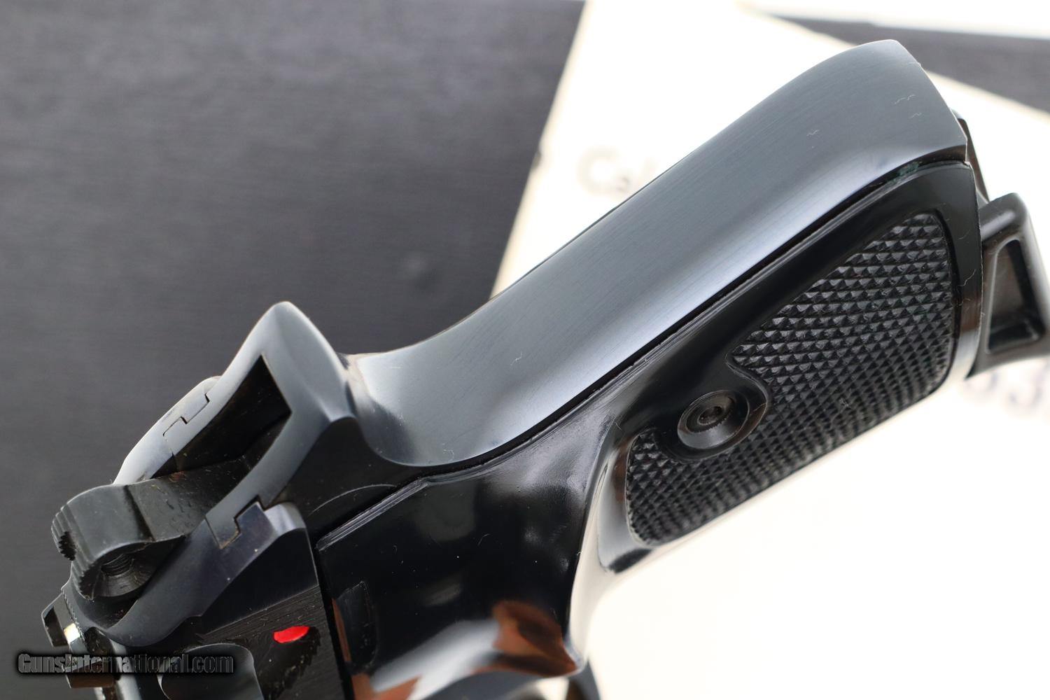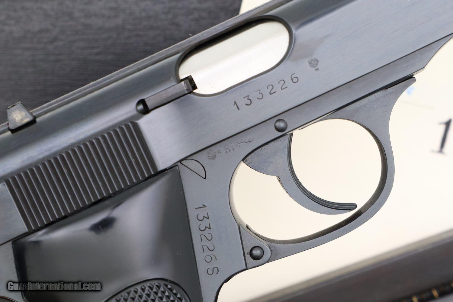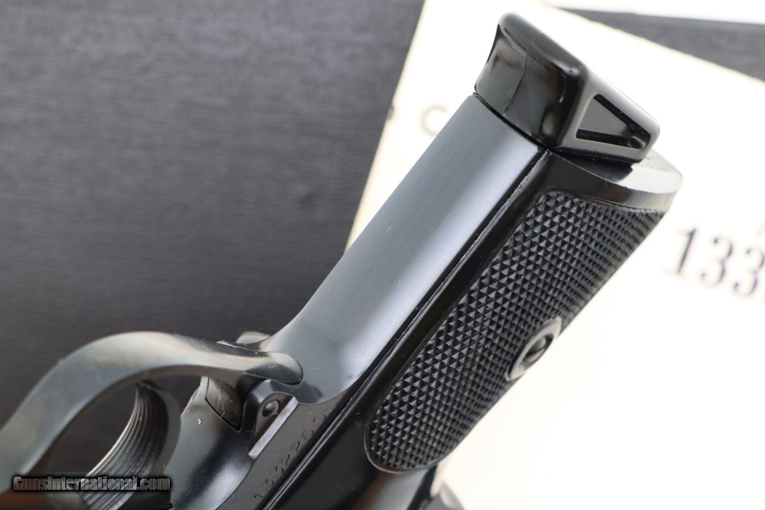 Description: Synopsis: Walther PPK/S .22 LR, Near New In Box, Literature Description: Near New Walther PPK/S, made in West Germany, in the scarce .22 caliber with finger extension magazine, matching test target, instruction booklet, and warranty note in matching shipping box. Standard pistol that coupled a PPK slide to a PP frame for import eligibility. Left side of slide with Walther banner, address, model, caliber, and manufacture in W Germany. Front and rear sight with white highlights. Red dotted safety. Right side of slide and frame with full serial number. Frame marked with “HI” proofing reflecting production in 1978. Fitted with black plastic grips, the left panel having a thumb rest. Correct unmarked .22 caliber magazine having finger extension. Complete with original black plastic shipping box with matching end label that contains matching test target, instruction booklet, and warranty notation. Condition: The pistol presents as new; even the magazine does not have insertional wear. Excellent test target and literature. Box with mild scuffing, lower right corner chipped, missing tiny securing tabs. A beautiful Walther PPK/S in the desirable .22 LR caliber. ~~Insured shipping fee of $55; most packages shipped using FedEx 2nd Day.~~ SOLD Manufacturer: Walther Serial Number: 1332265 Caliber Info: .22 LR |