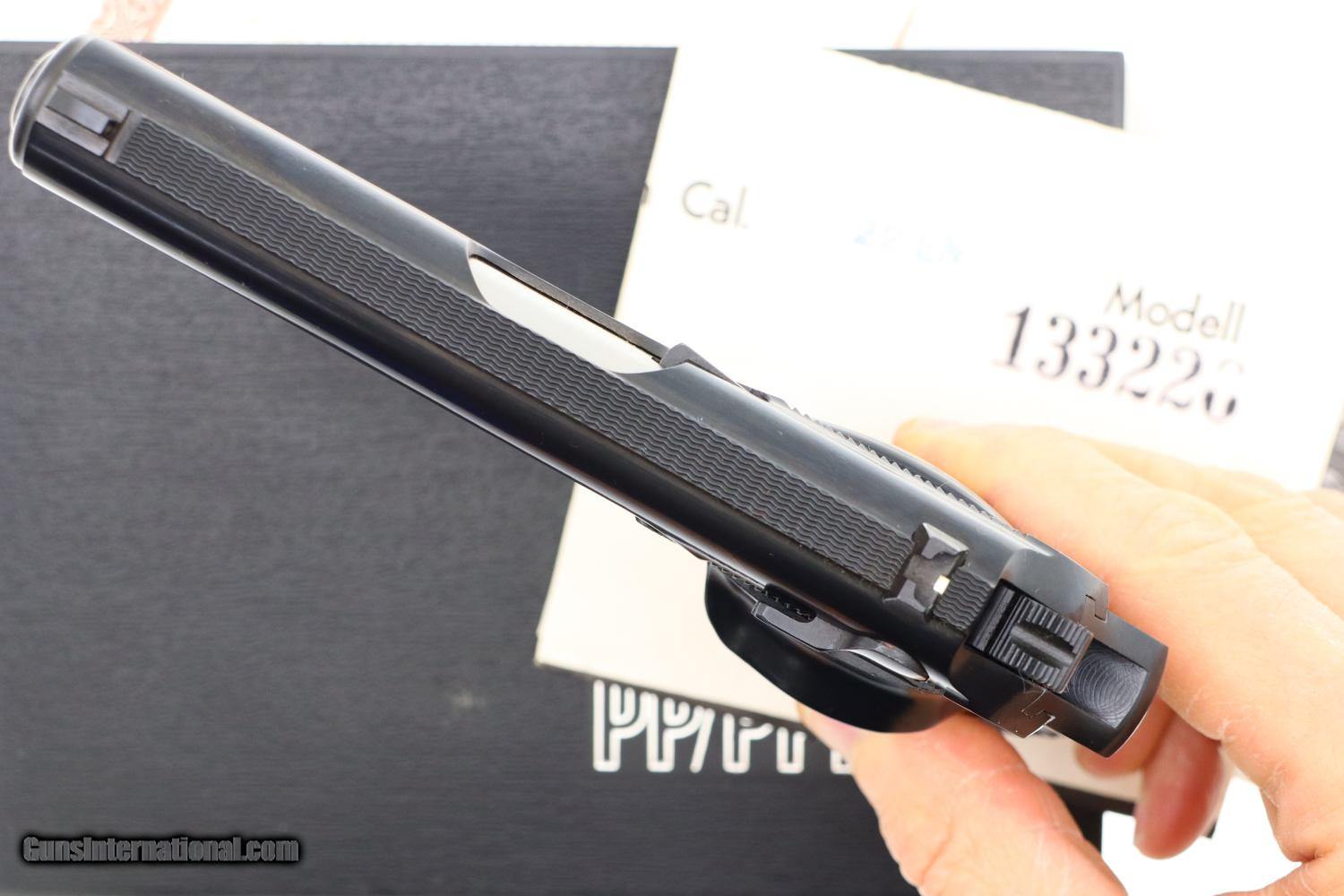 Description: Synopsis: Walther PPK/S .22 LR, Near New In Box, Literature Description: Near New Walther PPK/S, made in West Germany, in the scarce .22 caliber with finger extension magazine, matching test target, instruction booklet, and warranty note in matching shipping box. Standard pistol that coupled a PPK slide to a PP frame for import eligibility. Left side of slide with Walther banner, address, model, caliber, and manufacture in W Germany. Front and rear sight with white highlights. Red dotted safety. Right side of slide and frame with full serial number. Frame marked with “HI” proofing reflecting production in 1978. Fitted with black plastic grips, the left panel having a thumb rest. Correct unmarked .22 caliber magazine having finger extension. Complete with original black plastic shipping box with matching end label that contains matching test target, instruction booklet, and warranty notation. Condition: The pistol presents as new; even the magazine does not have insertional wear. Excellent test target and literature. Box with mild scuffing, lower right corner chipped, missing tiny securing tabs. A beautiful Walther PPK/S in the desirable .22 LR caliber. ~~Insured shipping fee of $55; most packages shipped using FedEx 2nd Day.~~ SOLD Manufacturer: Walther Serial Number: 1332265 Caliber Info: .22 LR |