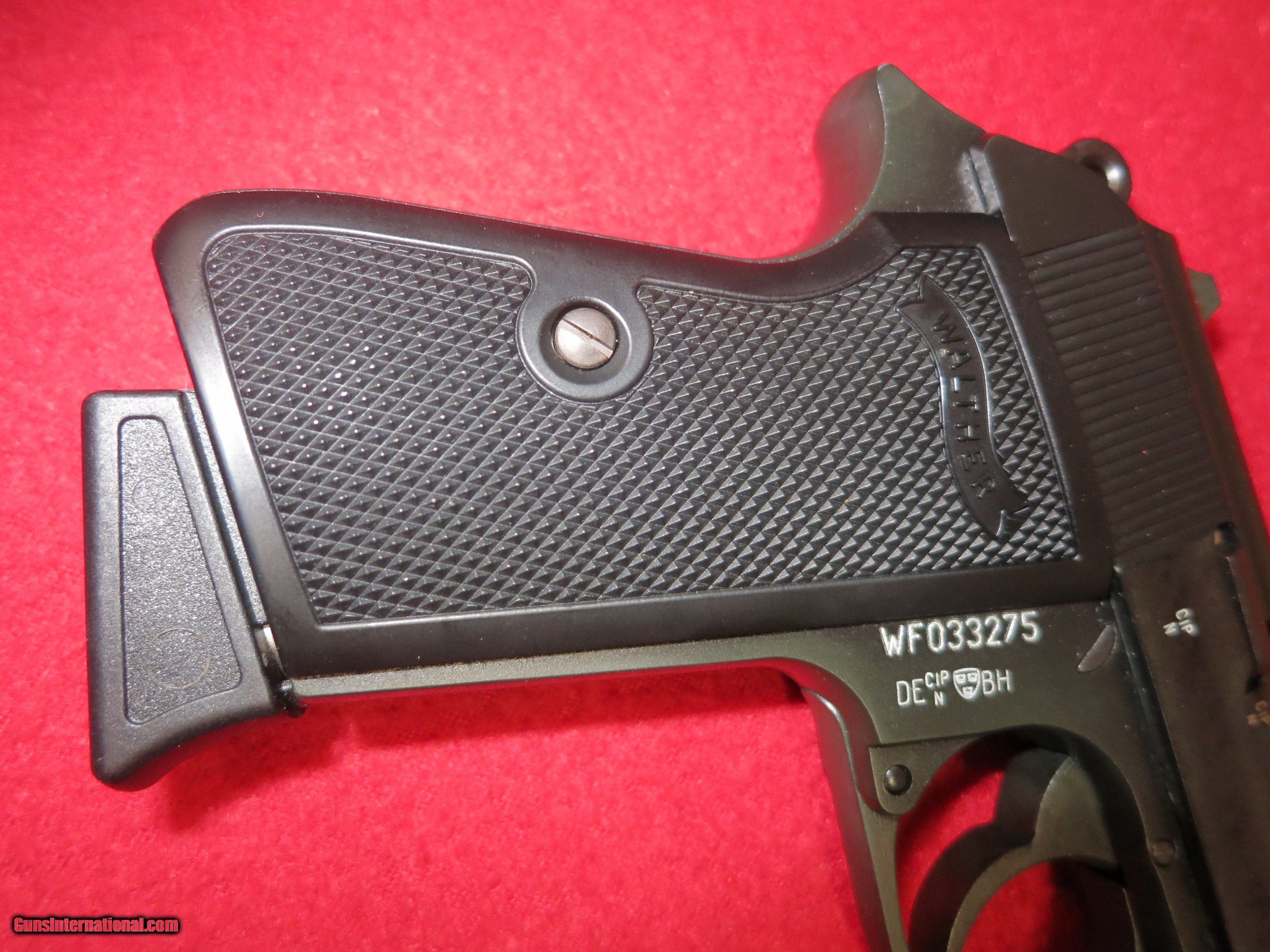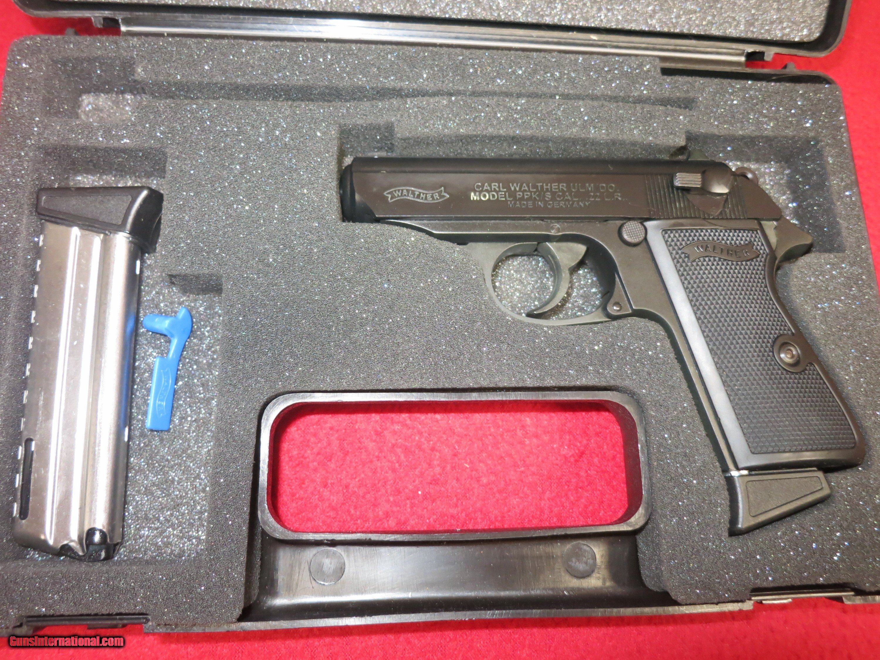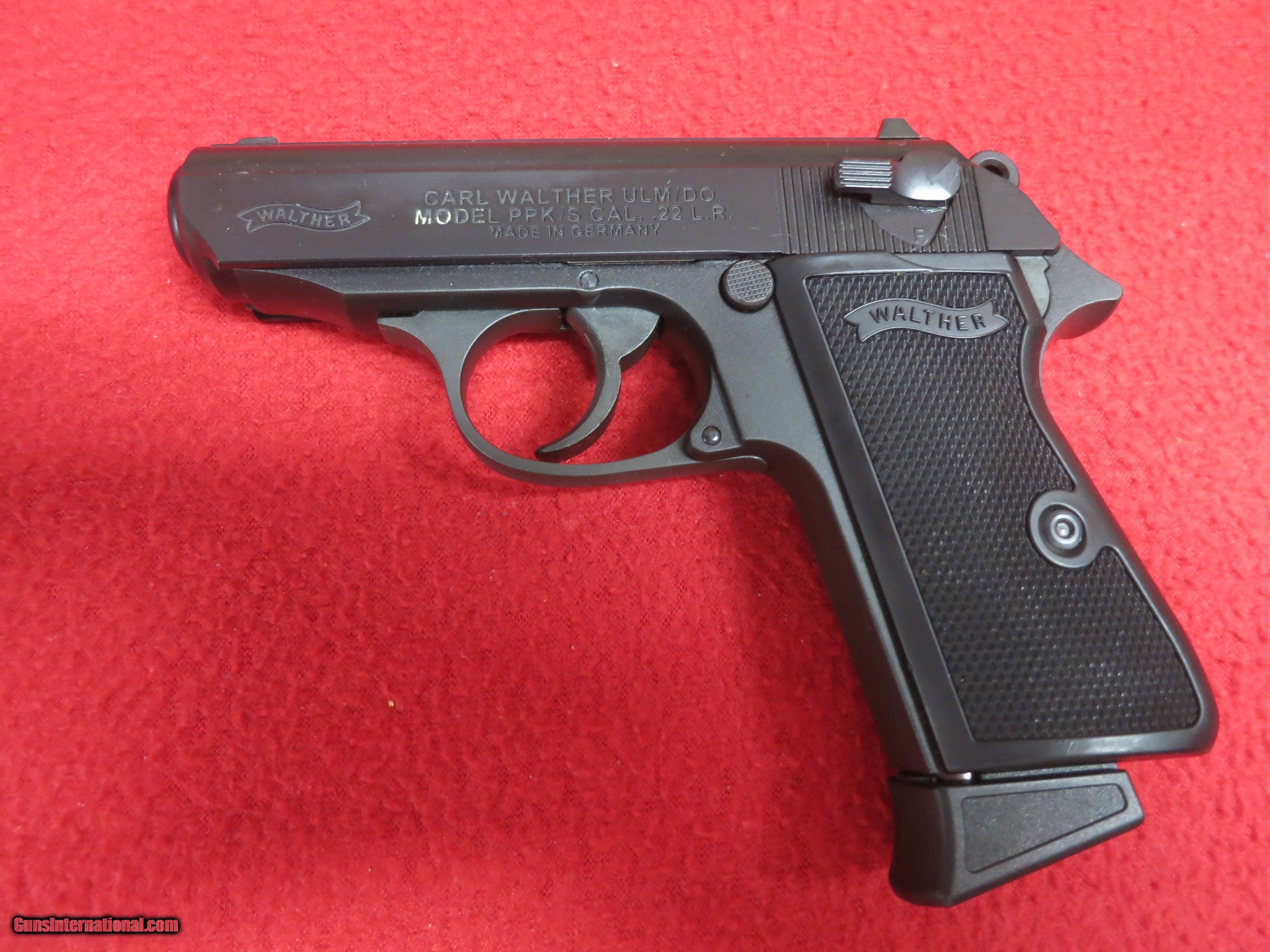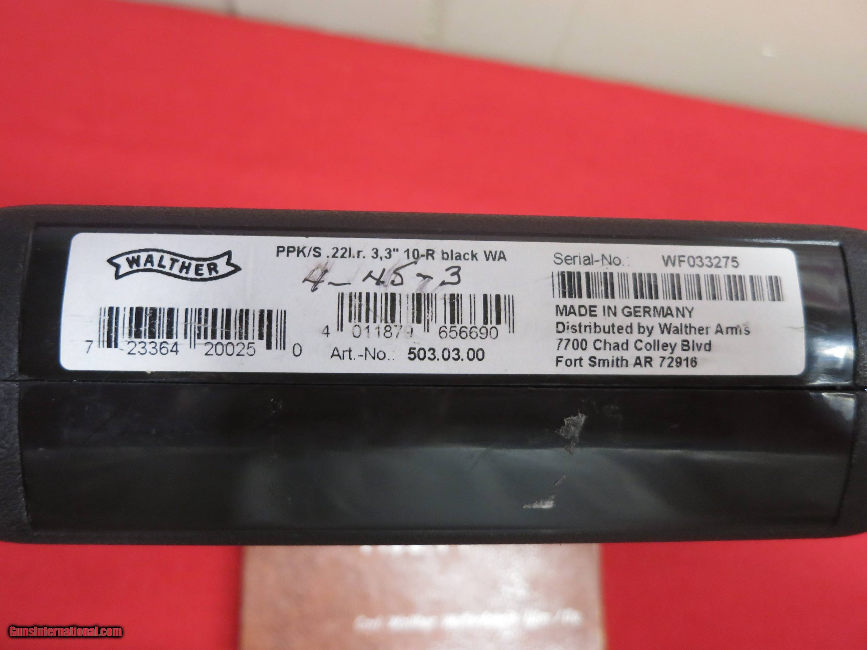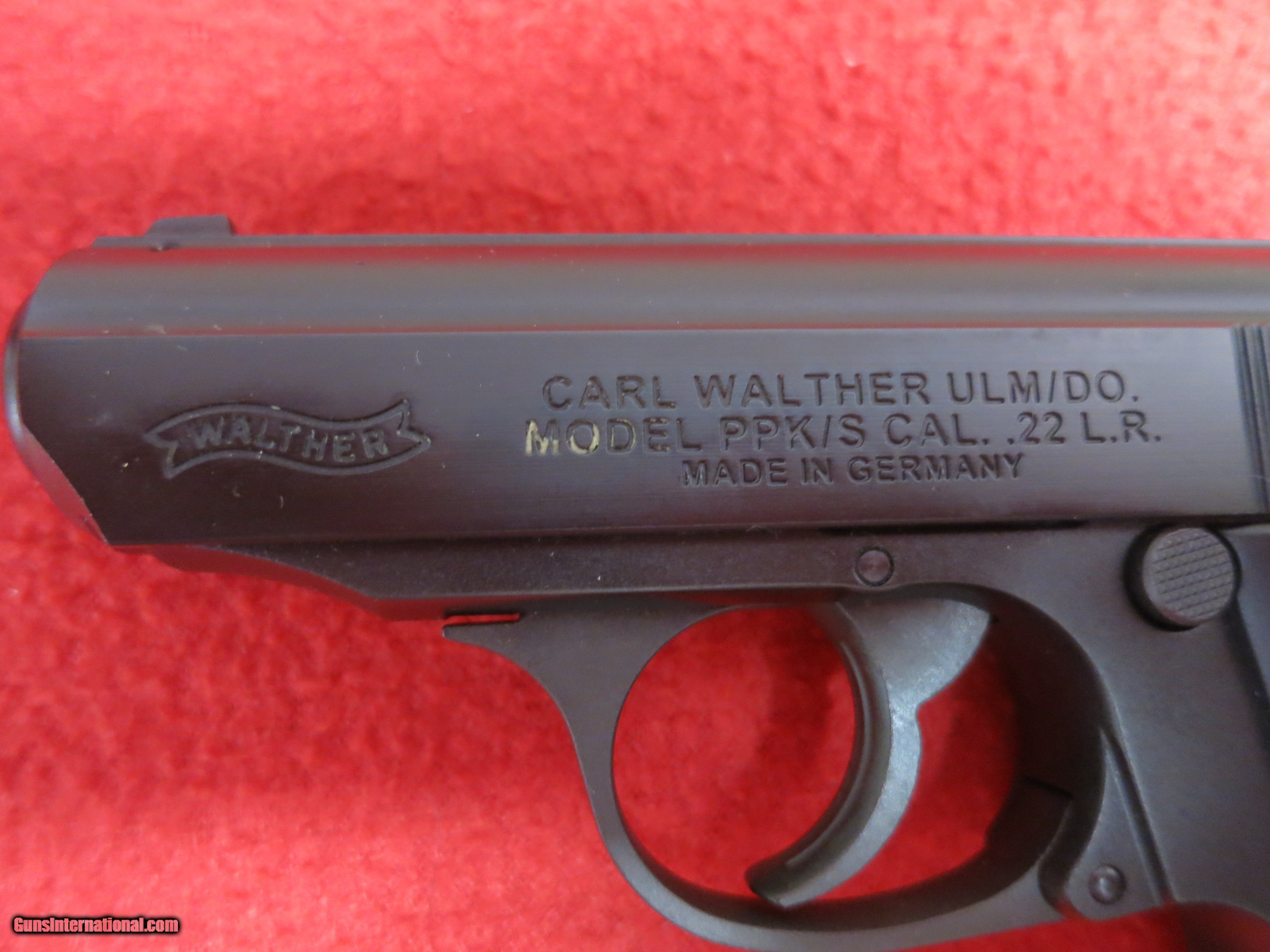 Description: WALTHER PPK/S .22 LR DOUBLE ACTION PISTOL. SN. # WF 033275, mfg U.S.A. EXCELLENT CONDITION. 3 1/4" BARREL HAS EXCELLENT BORE, FIXED TWO DOT SIGHTS. 100% BLUE FINISH. WALTHER MARKED BLACK PLASTIC GRIPS ARE EXCELLENT ALSO. COMES WITH 2 FACTORY MAGS. COMES IN MAKERS CASE WITH PAPER WORK. TEST FIRED ONLY. NIB. $500.00 SHIPPED. CALL OR E-MAIL WITH QUESTIONS; SOLD |