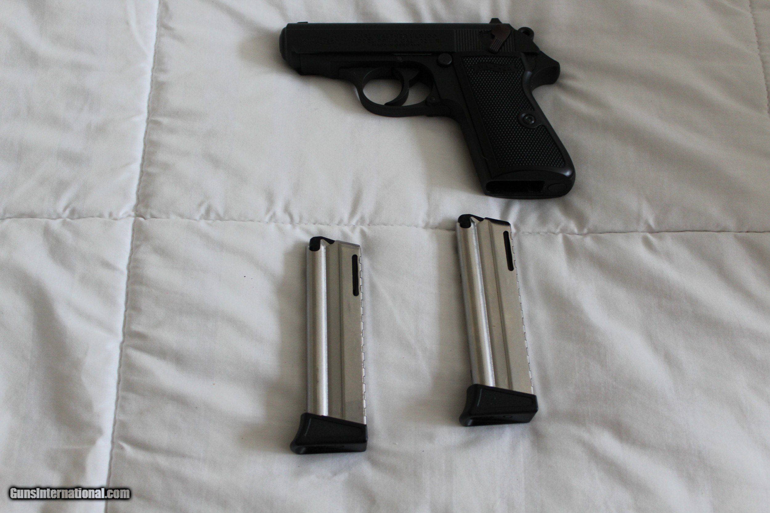 Description: SALE PENDING NEW PRICE!!! An "AS NEW" Walther PPKS in 22 LR. It is mint fired just a few rounds. Complete with all paperwork and lock, in its' original case with 2 magazines, both with finger rests. The right side of the slide is engraved with Walther Arms, Fort Smith AR.. I see no marks or wear on this pistol, anywhere. This is a nice concealable little handgun. This gun, as with all used guns, should be inspected by a trusted gunsmith before firing. No California sales, SORRY. We offer a 3 day, NON FIRING, inspection period with return shipping paid by the buyer if not satisfied. Shipping, Insurance and packaging will be at actual cost. SOLD |