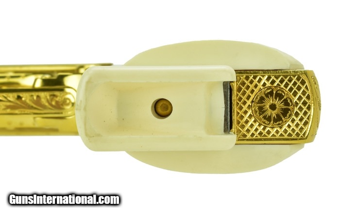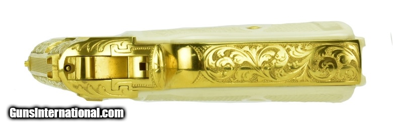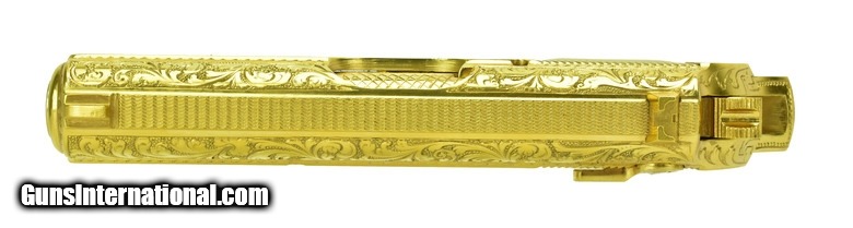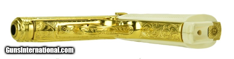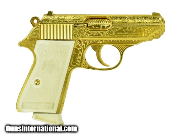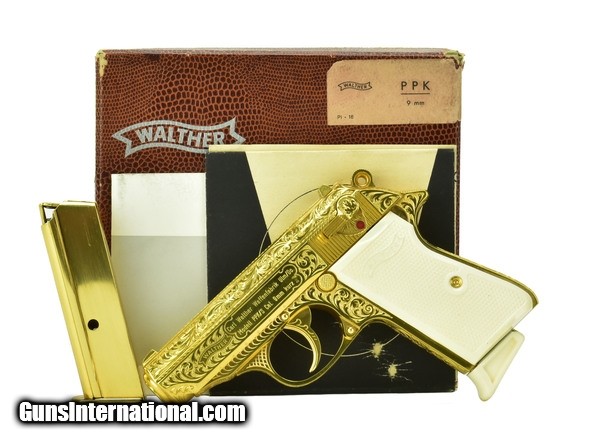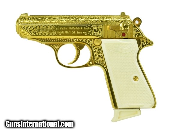 Description: Walther PPK/S .380 ACP caliber pistol. Rare West German factory engraved and gold plated model. A beautiful piece, in mint condition with box, extra magazine and papers.