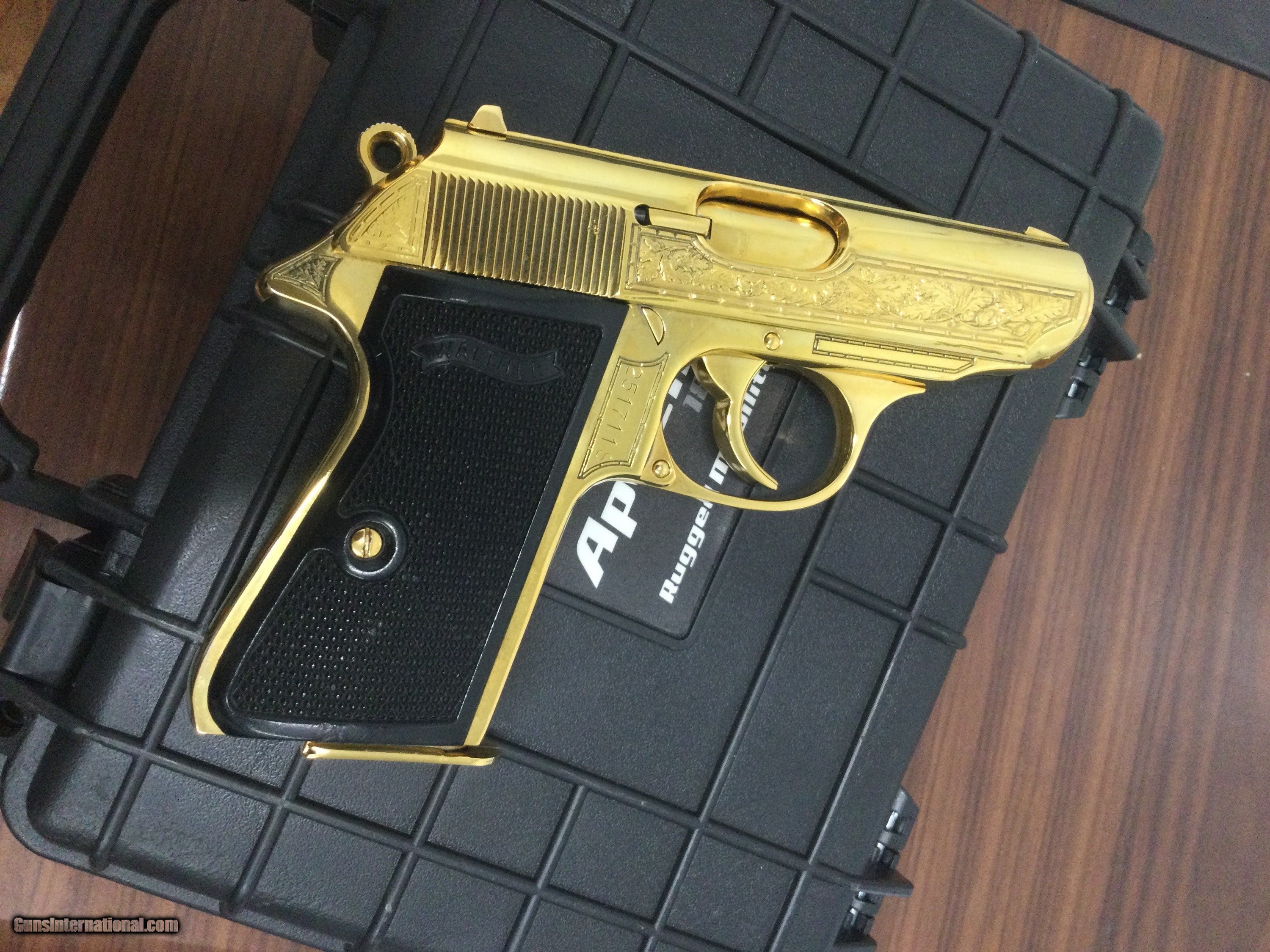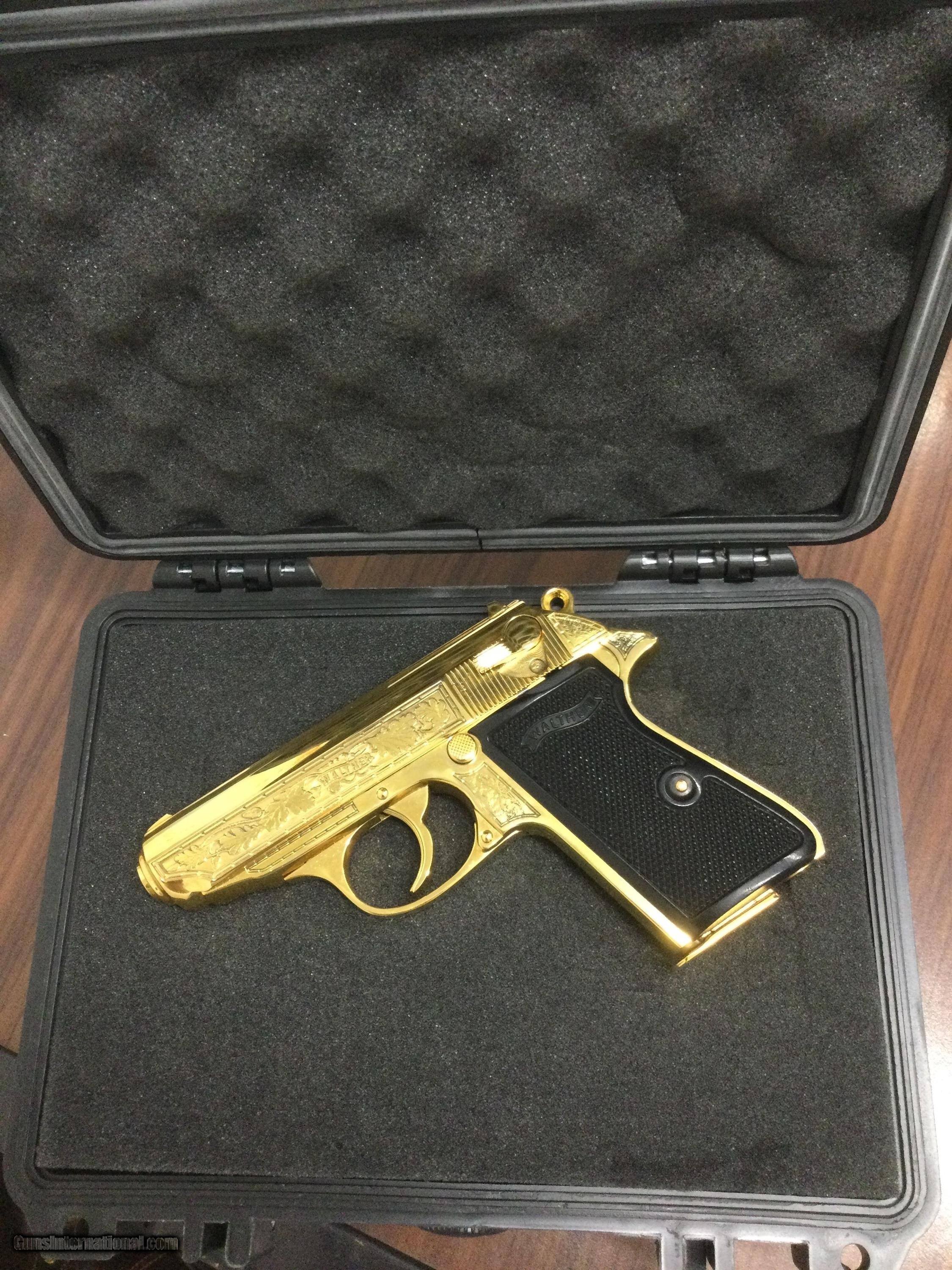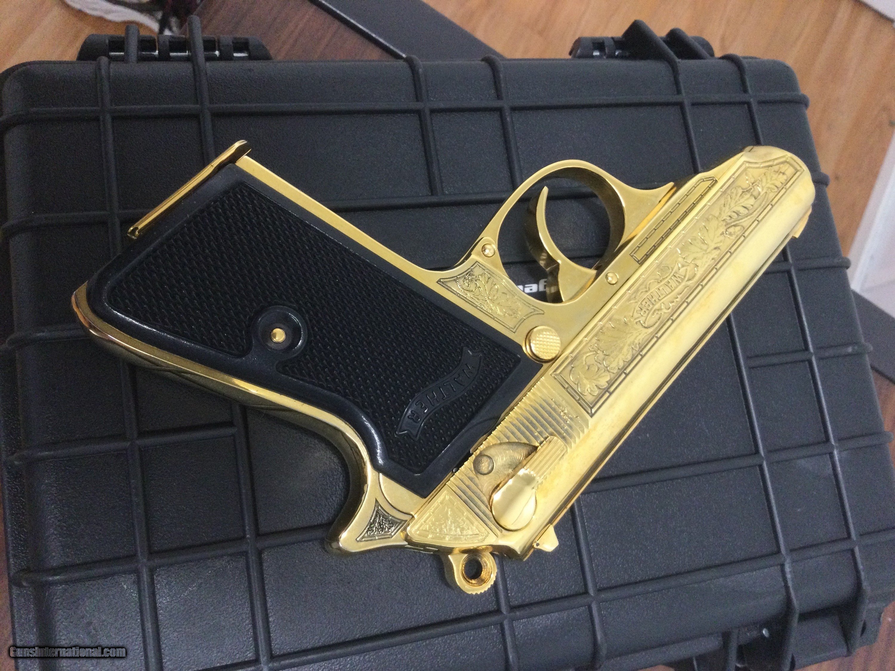 Description: Walther PPK S 380 acp. 24 carats gold plated. Custom engraved. Plastic grips with Walther logo. 7 rounds magazine with gold plated bottom. Not original waterproof box . CA is ok. Credit card fee 3%. SOLD Handgun Caliber: .380 ACP (9x17mm Browning Short) Manufacturer: Walther Model: PPK S |