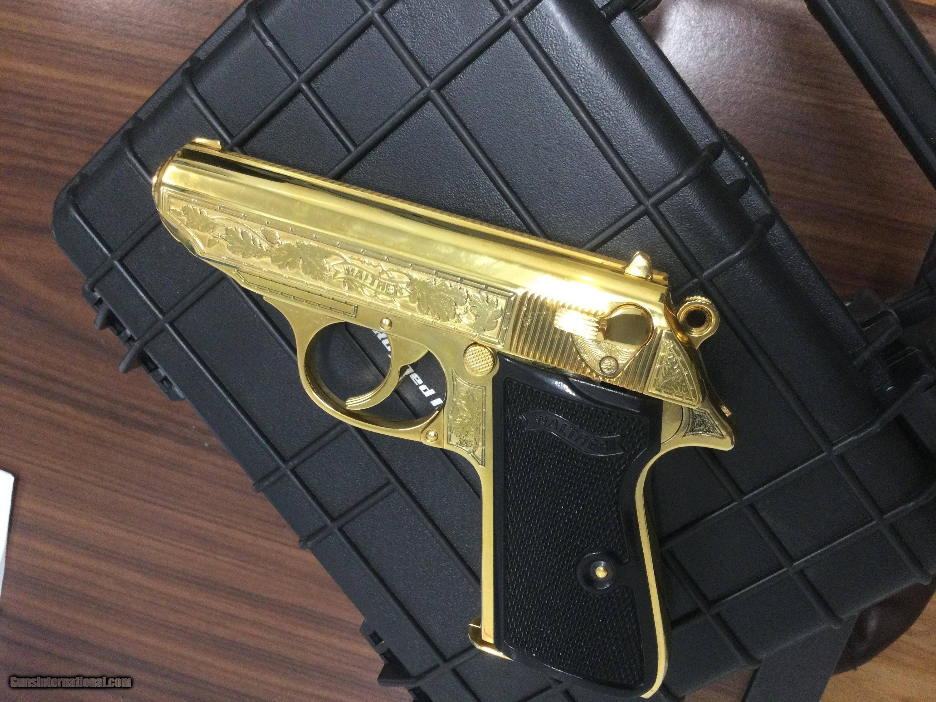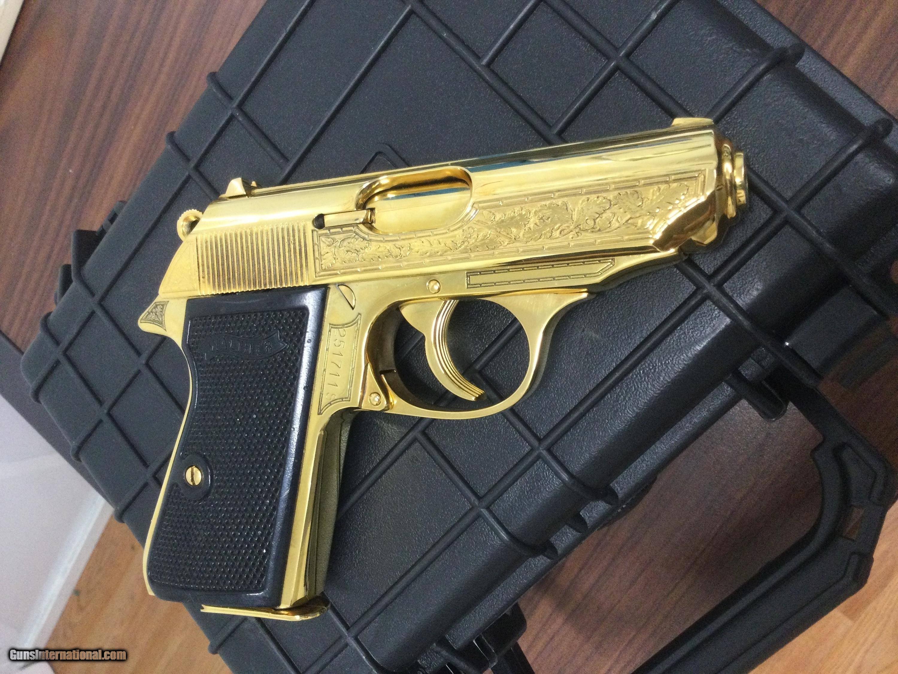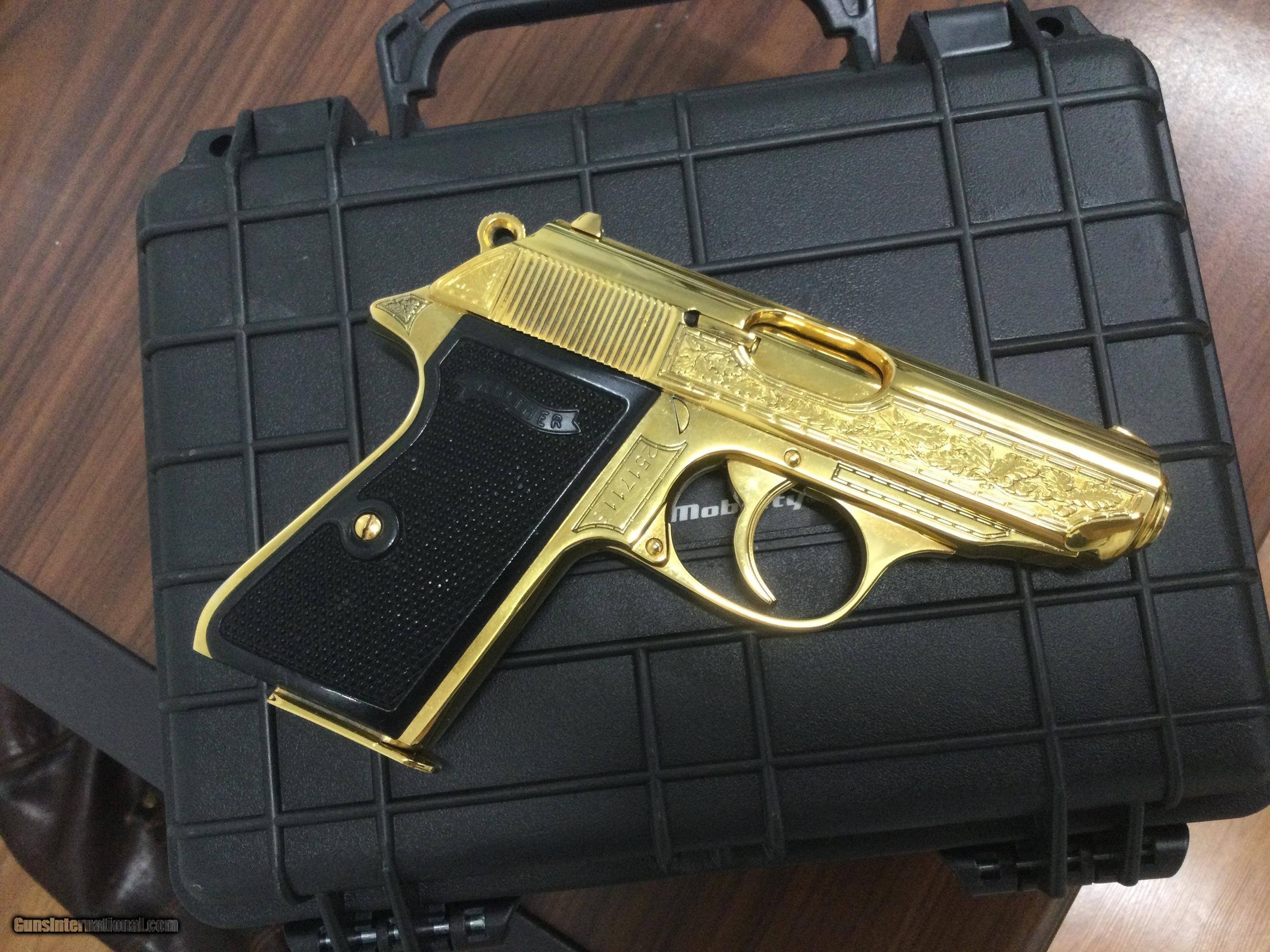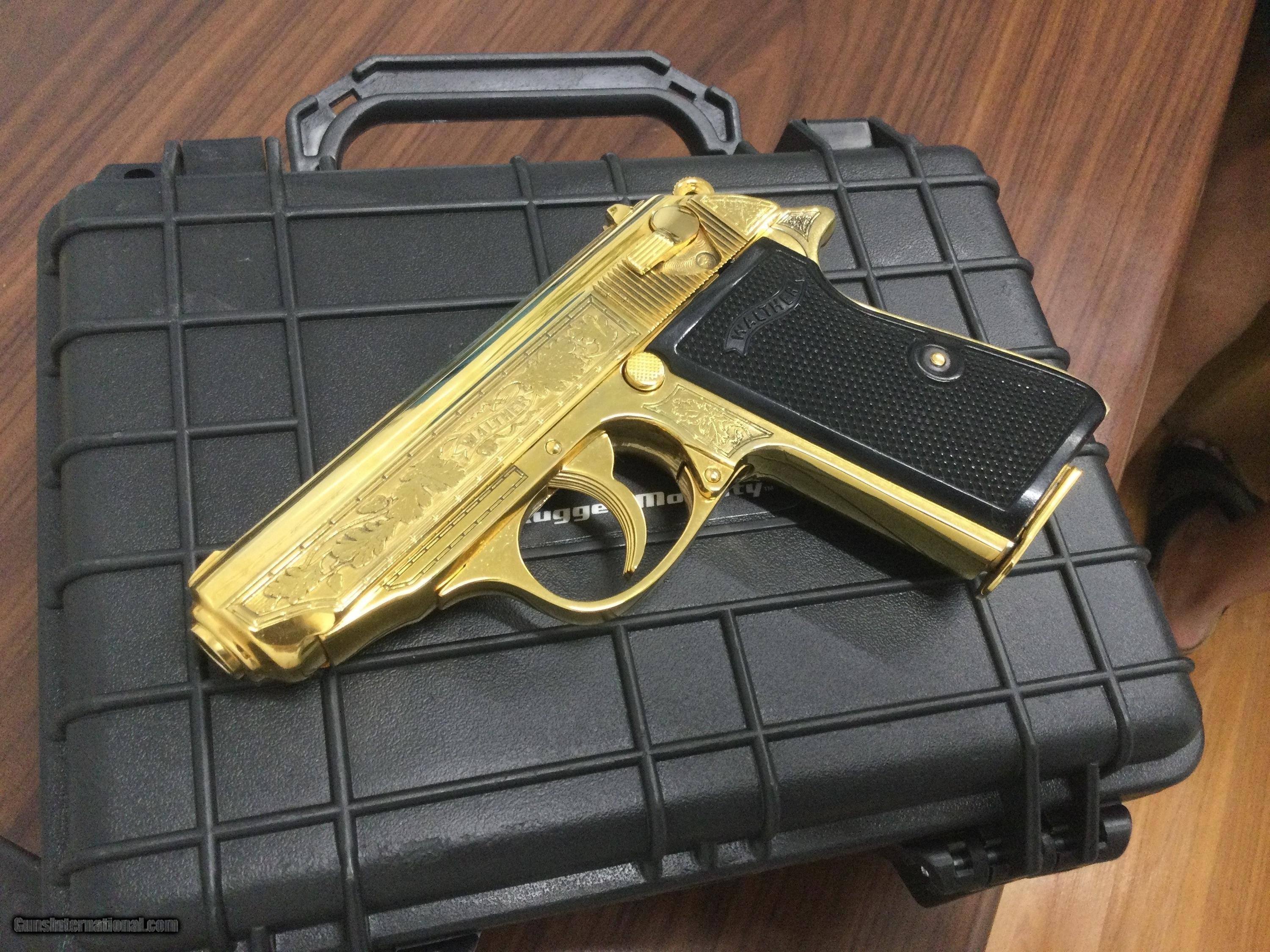 Description: Walther PPK S 380 acp. 24 carats gold plated. Custom engraved. Plastic grips with Walther logo. 7 rounds magazine with gold plated bottom. Not original waterproof box . CA is ok. Credit card fee 3%. SOLD Handgun Caliber: .380 ACP (9x17mm Browning Short) Manufacturer: Walther Model: PPK S |