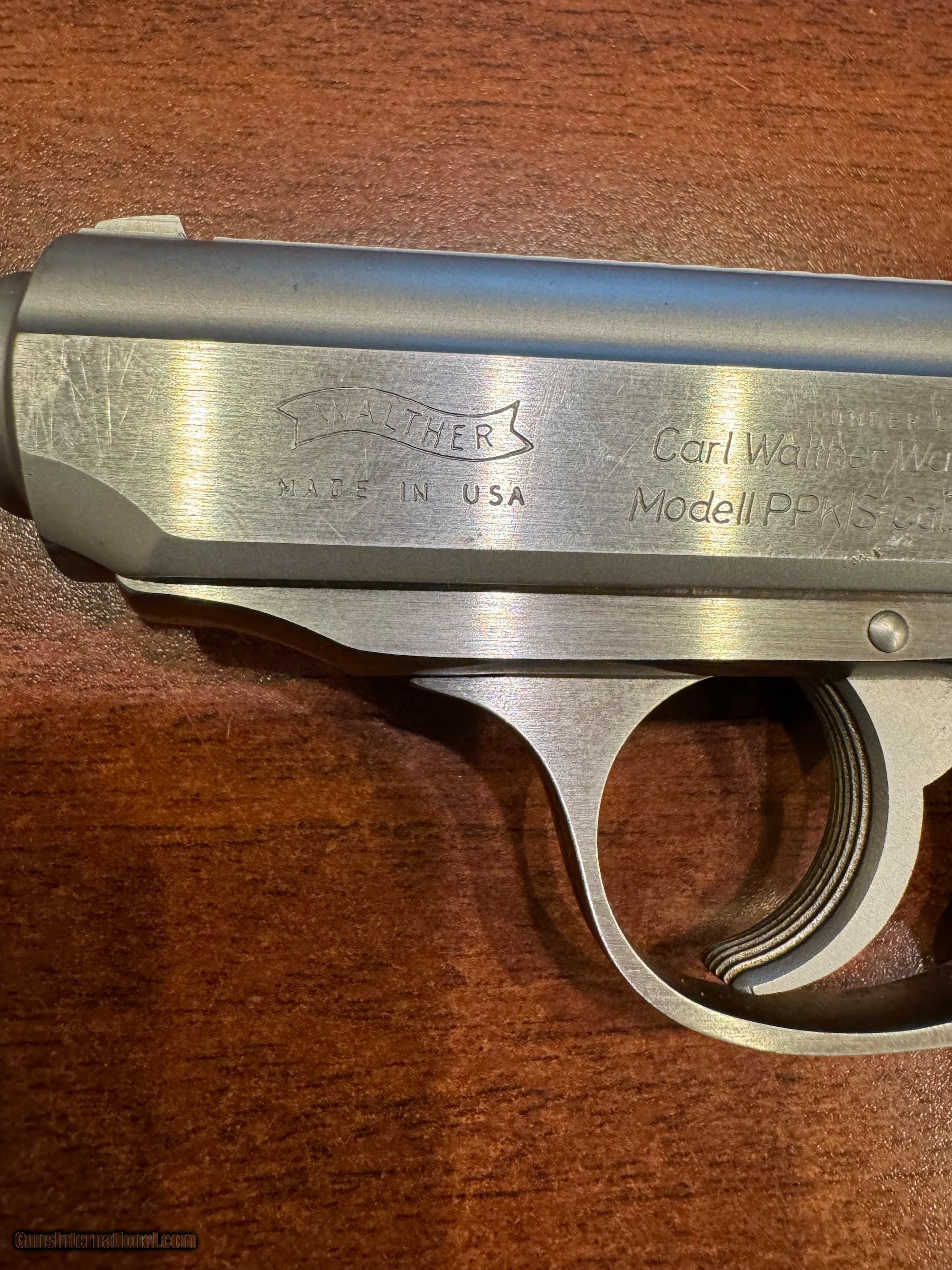 Description: Guns Listing ID: 1235055 Walther PPK/S stainless with wood grips. This model was made in USA. Chambered in .380acp. Has some light surface scratches but nothing major. No box included, comes with one magazine SOLD Manufacturer: WALTHER Model: PPK/S Caliber Info: .380 ACP Condition: Used - Non-Certified Barrels: 3.25 BARREL Finish: STAINLESS |