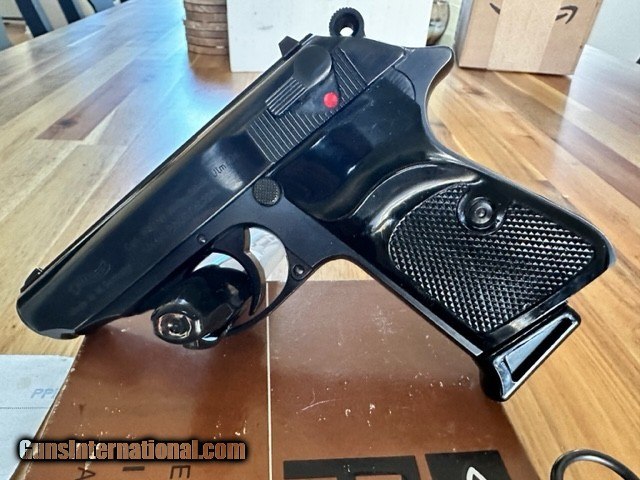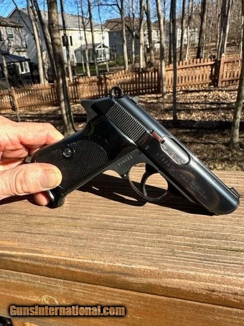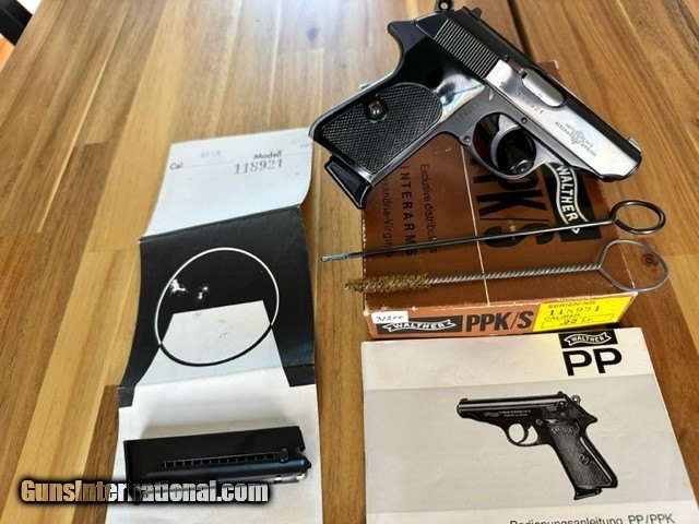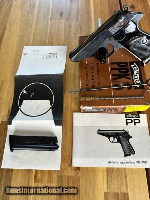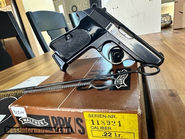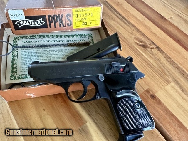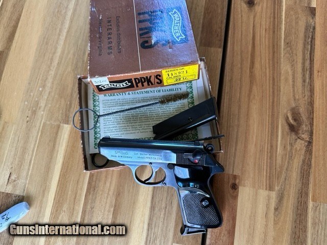 Description: Up for your consideration is a very nice , high condition + , mint , Walther PPK- S Made in West Germany , .22 cal LR. Serial # 118921 , 1971 . The Bluing rates excellant + , no scratches , no crown wear . The grips are excellant + and have the correct thumb rest on left grip panel with no chips or cracks .It comes with 1 flat bottom mag , and 1 Finger rest magazine , both in excellant +++ condition . Has the original serialed numbered box in solid excellant condition w/ no tears and corners are solid .Includes the original factory Owners Manual , factory Test target , and warranty card . The cleaning rod and brush are both solid . Pics have some shadows etc. No Sales to California or restricted states . Payment : Post Office Money order , Bank Check ,Personal Check . I also have a current PPK-S .380 , Mint ,,Made in Germany , for sale , on Gunsinternational # 102197157 . If you are interested in 2 Mint Walthers text or call me . This .22 Walther PPK-S is $1450.00 shipped w/ ins. . Thank You , SemperFi , JJ SOLD |
