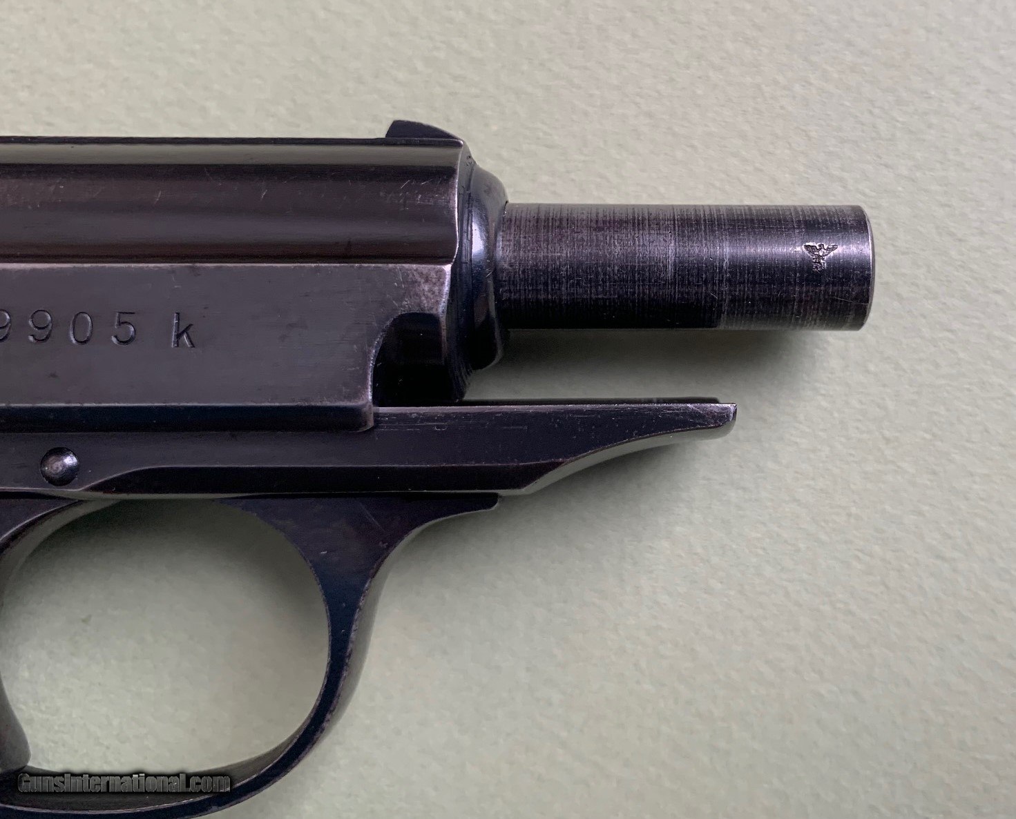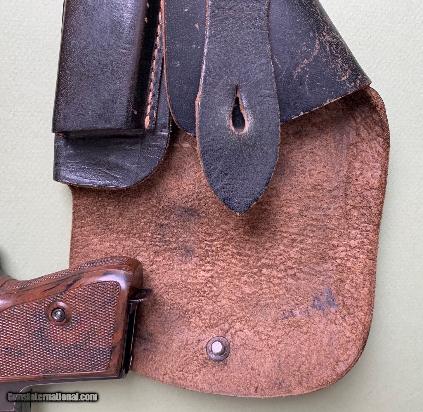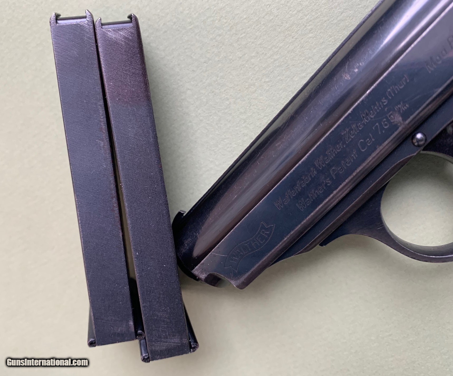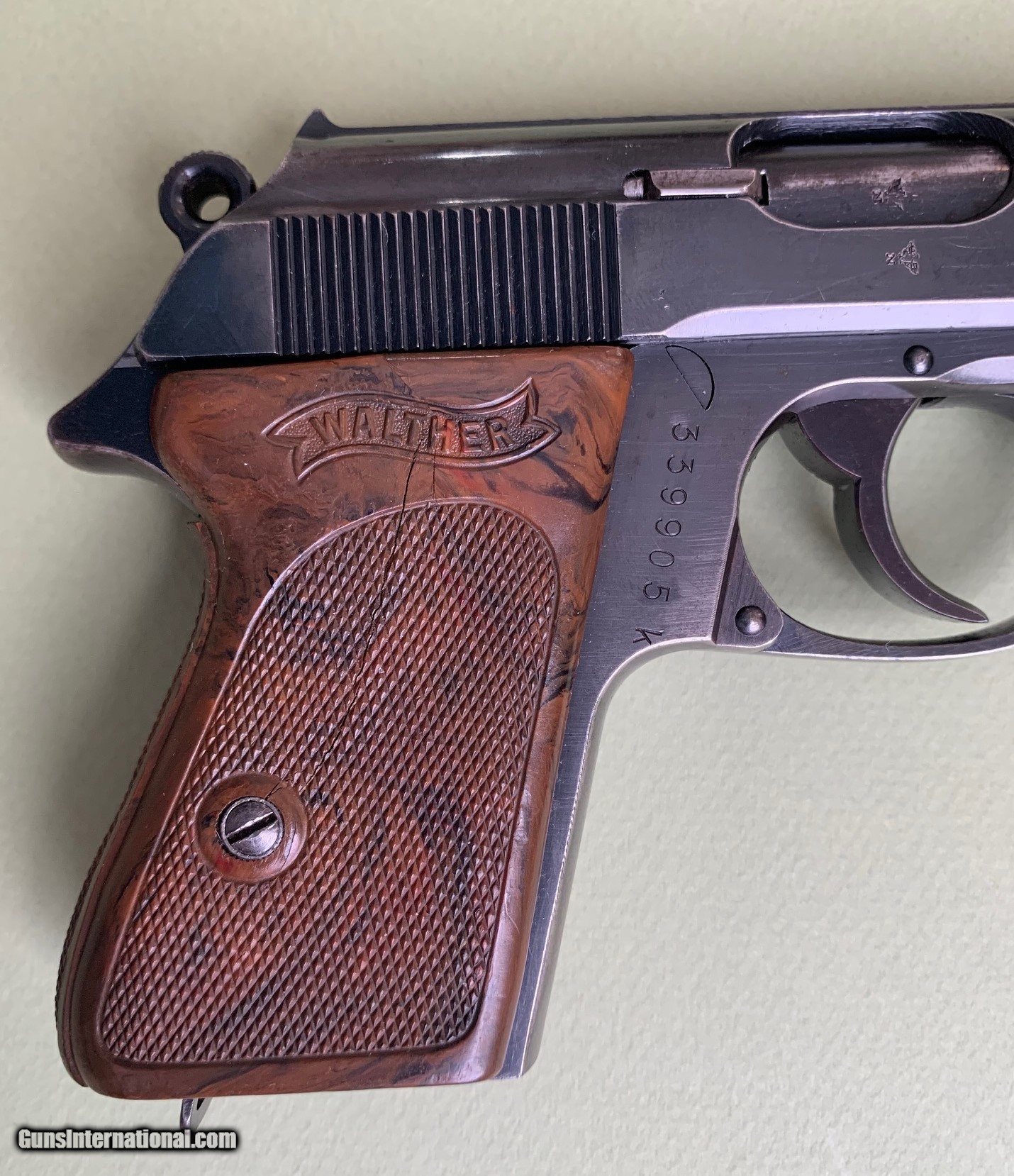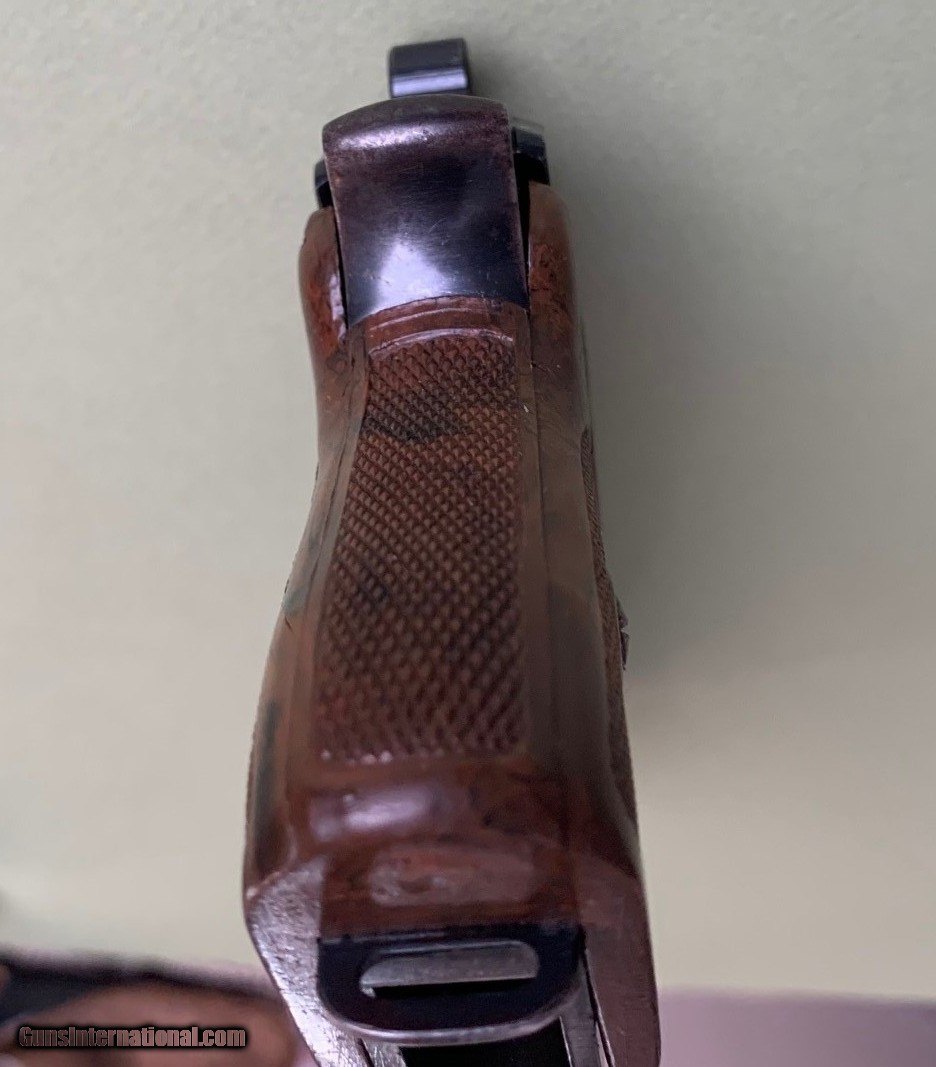 Description: PRICE REDUCED Offered is a very nice Police PPK rig with 2 Mags and a Holster. Serial # 339905k. Made ca.1941. The finish is in very good shape except for some limited muzzle wear and front strap wear. Other than the front strap, I believe the finish is at 95+%. The Police acceptance stamp is clear and shows the die wear (a break in the letter C) expected for this serial number. The magazines are in great shape. The bore is bright and clean with no issues. The holster is in very nice condition but shows some wear and handling marks. The holster stitching is all good except for on a small corner of the belt loop. Probably the result of the muzzle rubbing the inside stitches when the pistol was pushed into the holster. The ink stamp is not readable. The grips are in nice shape other than a couple of hairline cracks in the right grip panel. This is a nice example of a transitional PPK with chocolate-brown grips, early appearance of long tang, and still relatively high polish. We ship (signature required) to FFL or C&R. Payment methods are most credit cards (no extra credit card fees), money order, certified check, and regular check. Buyer pays $40 shipping and insurance. Call within 3-days of receipt, if you want to return the pistol for a full refund, exclusive of shipping and insurance. Buyer pays return shipping and insurance. SOLD Curio/Relic: Yes Manufacturer: WALTHER Model: PPK Serial Number: 339905K Condition: USED Manufacture Date: 1941 |