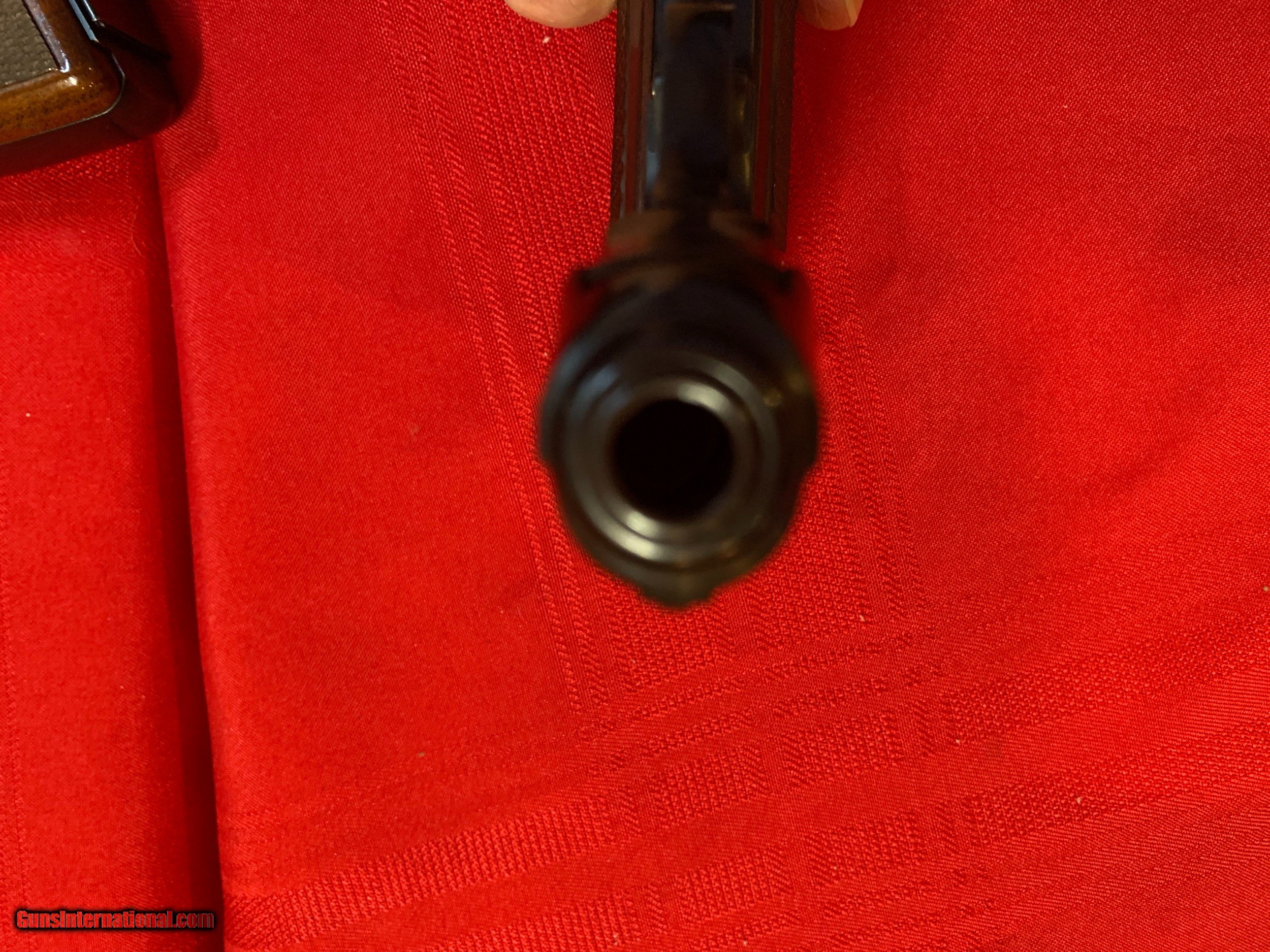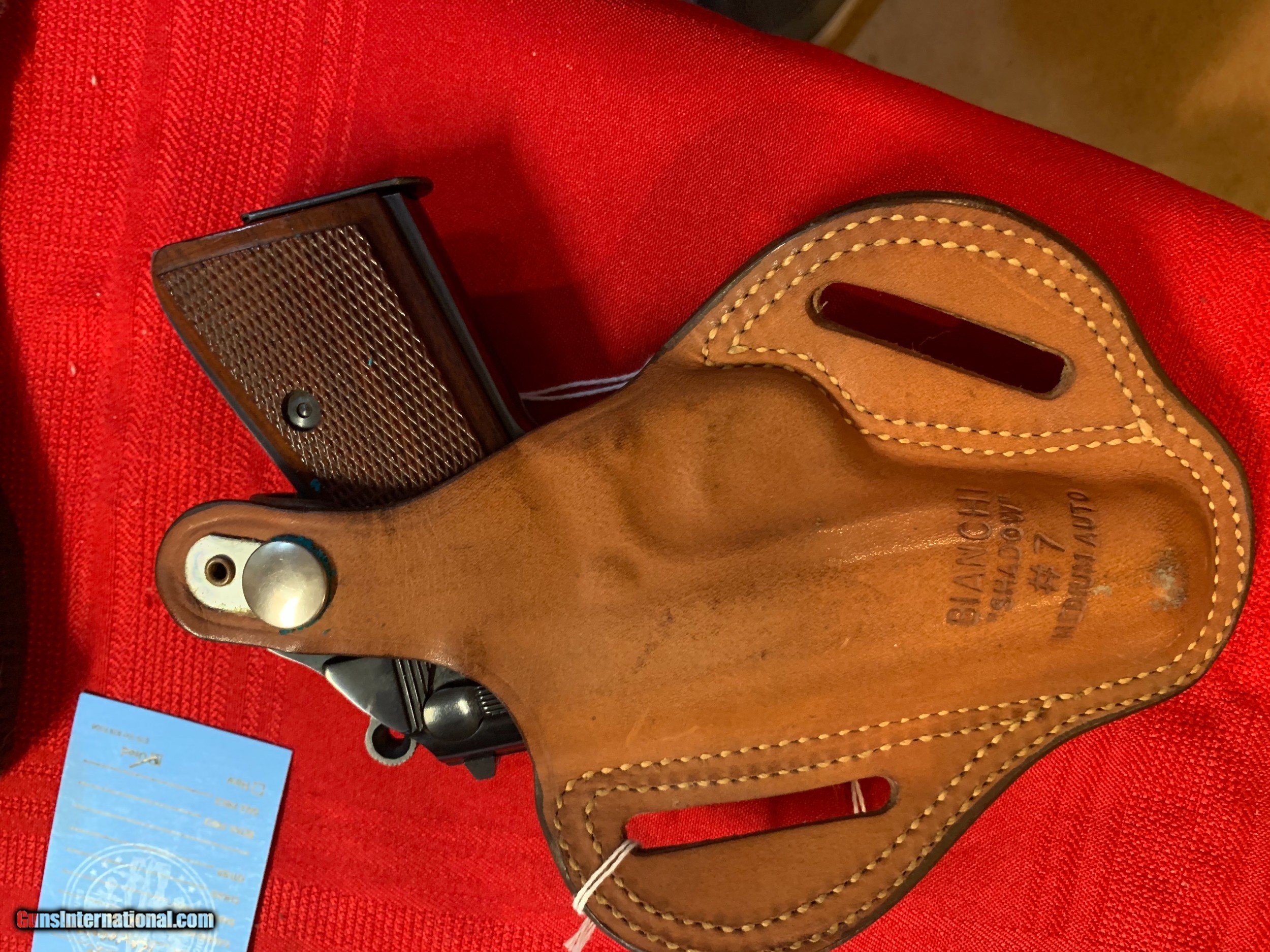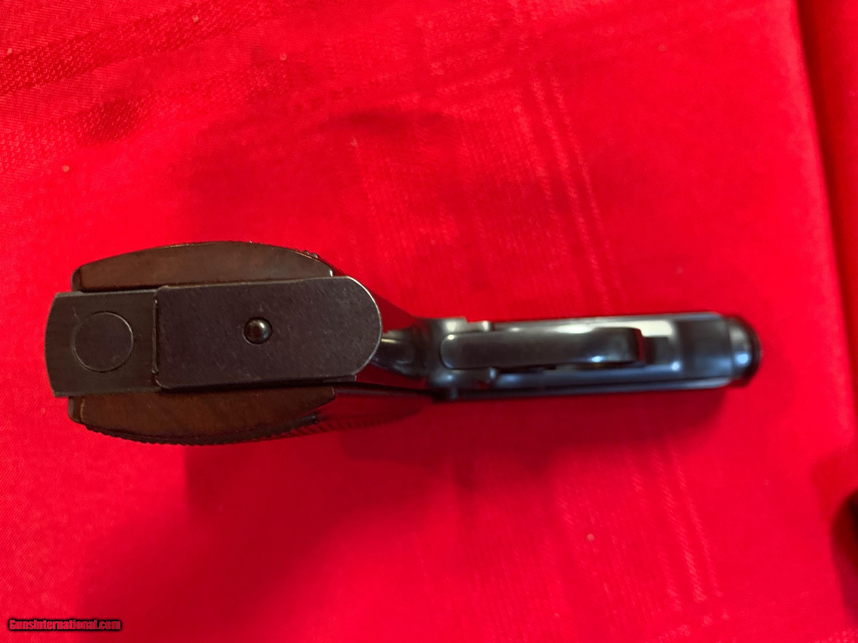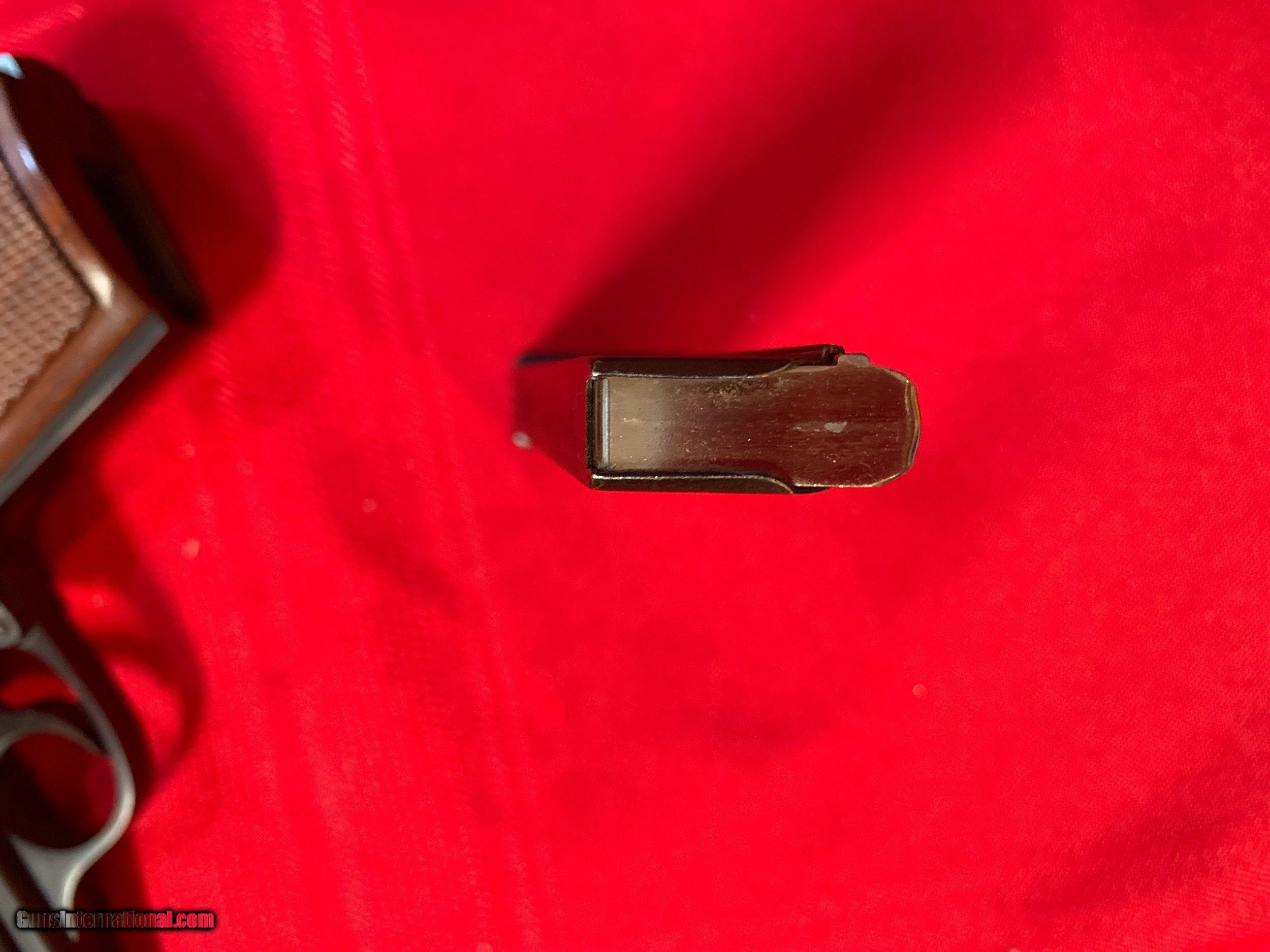 Description: W. German PPKS. Good bore and mechanics. Nicely checkered grips. Deep blue. 1 mag. Holster included. 1971 SOLD Handgun Caliber: .380 ACP (9x17mm Browning Short) |