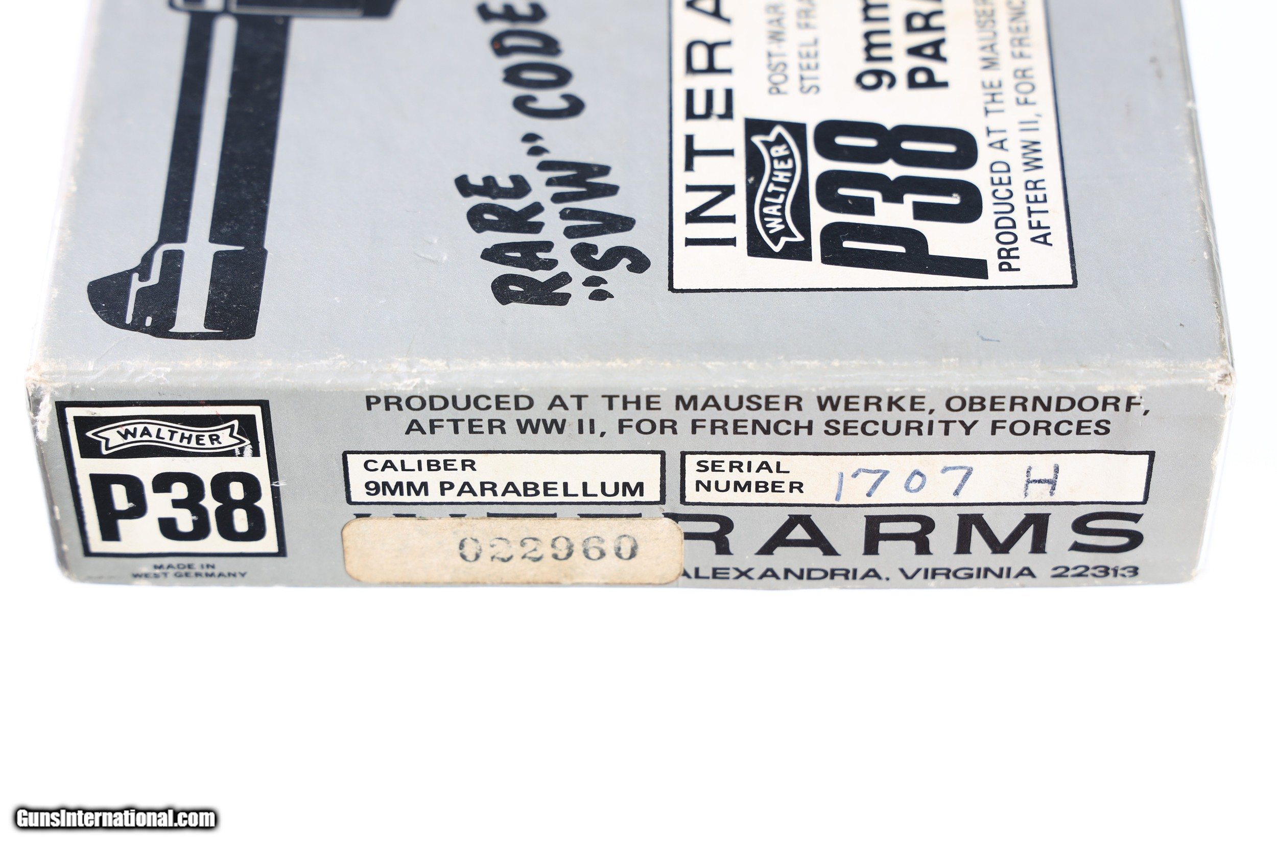 Description: SVW codes. Slide marked SVW45. Importers markings tastefully placed on underside of slide. Free Shipping, No Credit Card Fees! SOLD Manufacturer: Walther Model: P38 Serial Number: 1707h Barrel Length: 5 Caliber Info: 9mm |