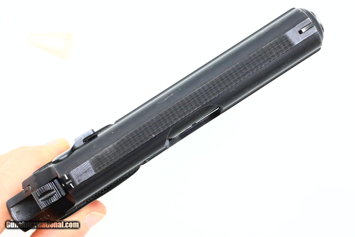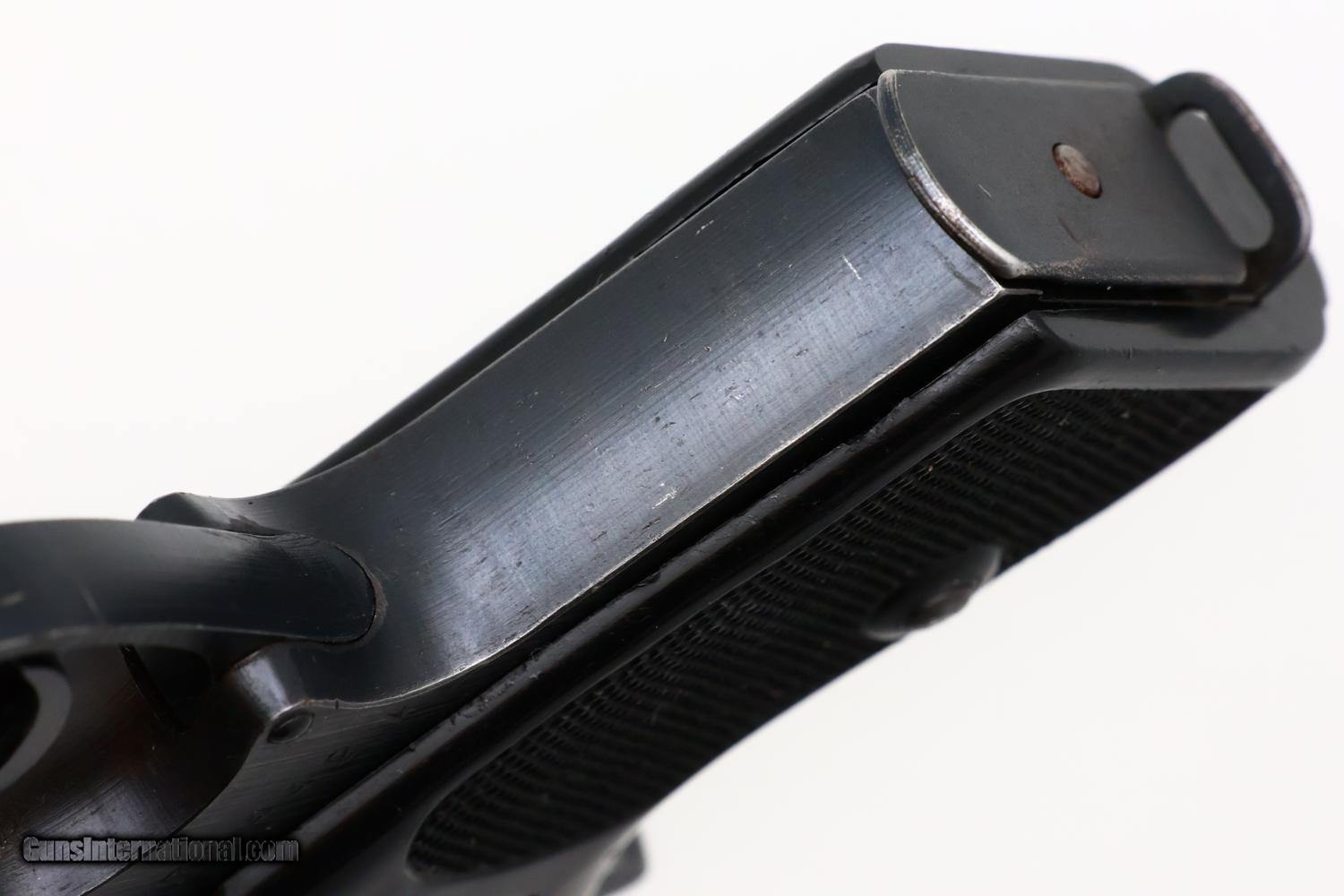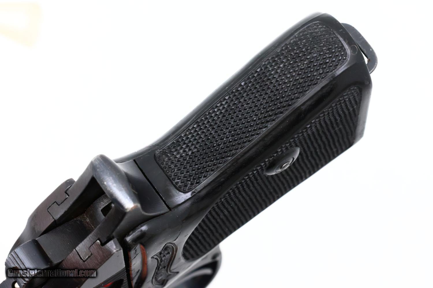 VG/EXC original condition with muzzle and light sharp edge wear as consistent for a lightly carried military pistol. Comparable condition black plastic grips, with a scattering of handling marks most noticeable on the upper portion of the left side under the safety. Bright bore with sharp rifling. Perfect manual mechanics. One of the more desirable WWII military issue Walther PPK pistols!