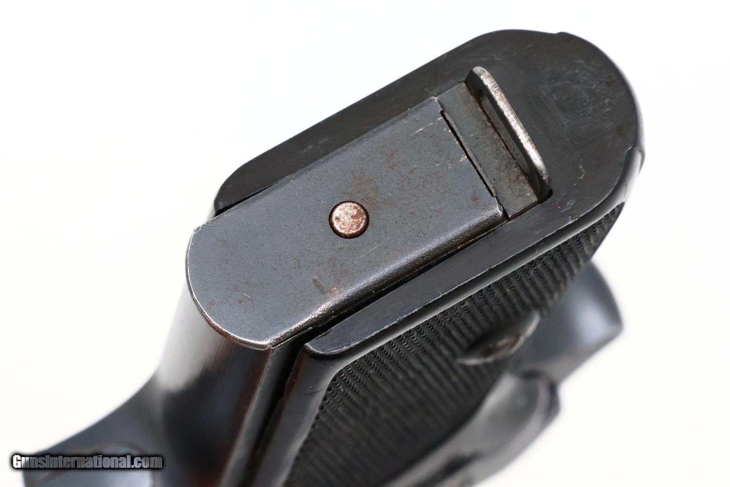 Description: Synopsis: Scarce and attractive Walther PPK pistol with late war characteristics and Waffenamt acceptances as issued to the German military. Description: Wartime Walther PPK in 7.65mm (.32 ACP) from 1942 production with late rough milled finish and wartime Eagle/N acceptance proofs. Standard configuration pistol with fixed front and rear sights. Loaded indicator present. Walther banner followed by manufacturer, model, and caliber on left side of slide. Waffenamt WaA359 proofs, applied on the left side of the slide and frame, as correct for a military issue Walther PPK. Eagle/N proofs on exposed barrel boss and right side of slide. The full serial number 372442k appears on the right side of the slide and frame. Black Walther one-piece wraparound grip as standard for late wartime production. Original magazine with proper wartime finish and markings, the left side of the magazine marked with the Walther banner, model, and caliber. Condition: VG/EXC original condition with muzzle and light sharp edge wear as consistent for a lightly carried military pistol. Comparable condition black plastic grips, with a scattering of handling marks most noticeable on the upper portion of the left side under the safety. Bright bore with sharp rifling. Perfect manual mechanics. One of the more desirable WWII military issue Walther PPK pistols! SOLD Curio/Relic: Yes Manufacturer: Walther Model: PPK Serial Number: 372442K Caliber Info: 7.65mm Condition: VG |