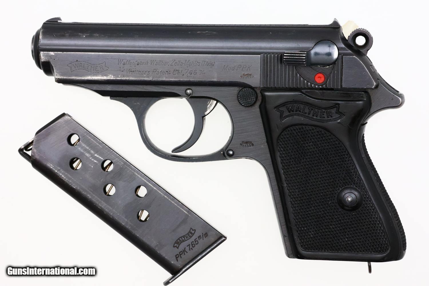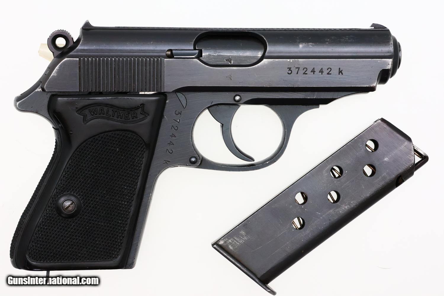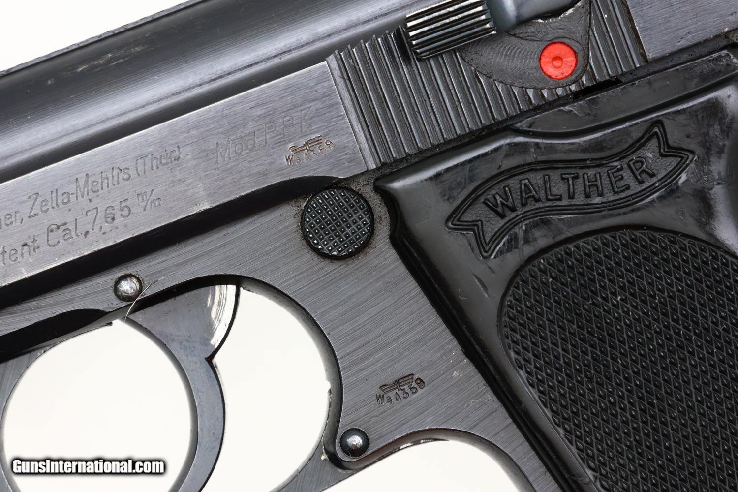 Wartime Walther PPK in 7.65mm (.32 ACP) from 1942 production with late rough milled finish and wartime Eagle/N acceptance proofs. Standard configuration pistol with fixed front and rear sights. Loaded indicator present. Walther banner followed by manufacturer, model, and caliber on left side of slide. Waffenamt WaA359 proofs, applied on the left side of the slide and frame, as correct for a military issue Walther PPK. Eagle/N proofs on exposed barrel boss and right side of slide. The full serial number 372442k appears on the right side of the slide and frame. Black Walther one-piece wraparound grip as standard for late wartime production. Original magazine with proper wartime finish and markings, the left side of the magazine marked with the Walther banner, model, and caliber.