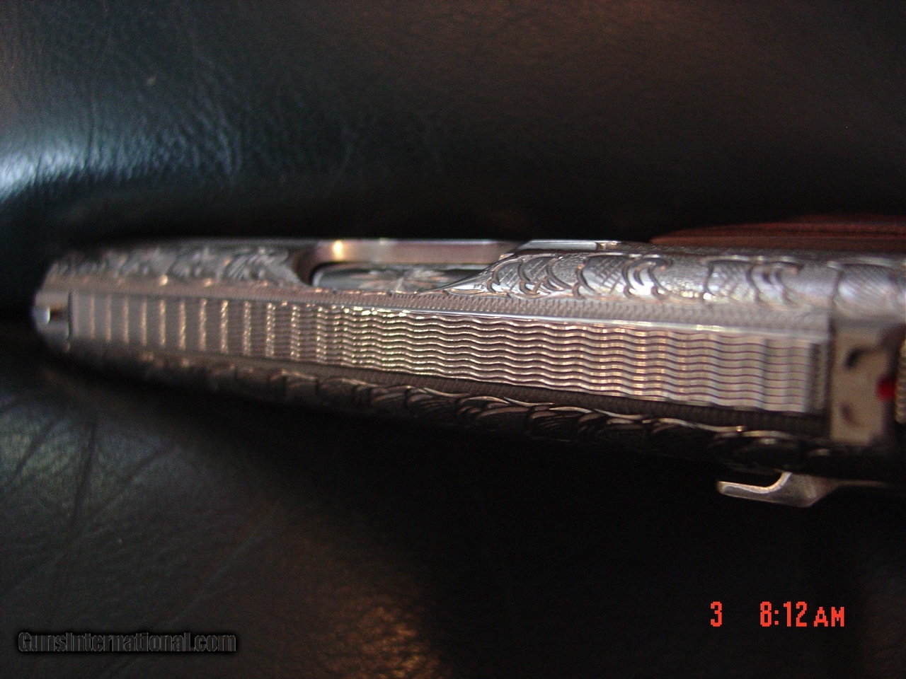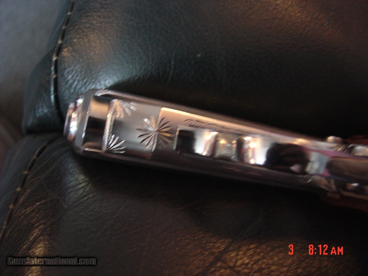 Description: SALE PENDING !Here is a really gorgeous Walther PPK/S in 380 ACP,in stainless,that has been fully engraved & polished by Flannery Engraving,Oct 1st 2018. done in American Scroll with Star accents,& it looks way nicer in person than in some of my fuzzy photos-sorry, come with a certificate,& serial numbered box, beautiful custom walnut wood grips with thumb rests & great grain, & 2- 7 round magazines, one with the finger extenson, double or single action, with a 3.35" barrel, & has the original black plastic grips & rubber Pachmeyr also. looks like new & not shot much. Serial # 1972BAR very solid gun,for conceal carry. a real work of art showpiece.a steal at only $1895. firm +$35. shipping to your FFL dealer only. I am an FFL dealer, located in the Clearwater,Florida area. I accept bank wire transfers to Wells Fargo Bank,cashiers checks,bank or postal money orders,or personal & business checks, but those take time to clear. no credit cards or PayPal-sorry. I now offer 60 day layaway with 1/3rd down & 1/3rd per month. be sure to check out all my other unique guns. SOLD |