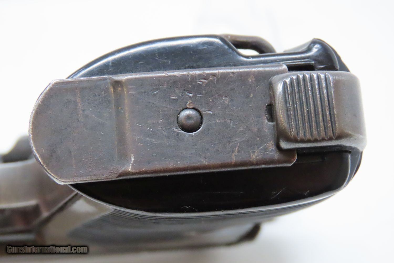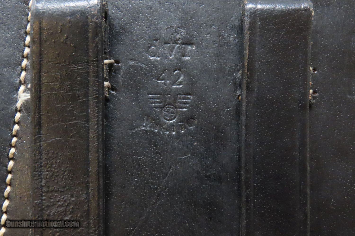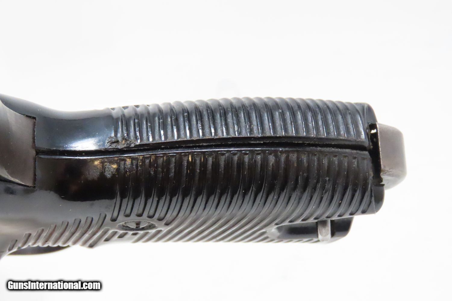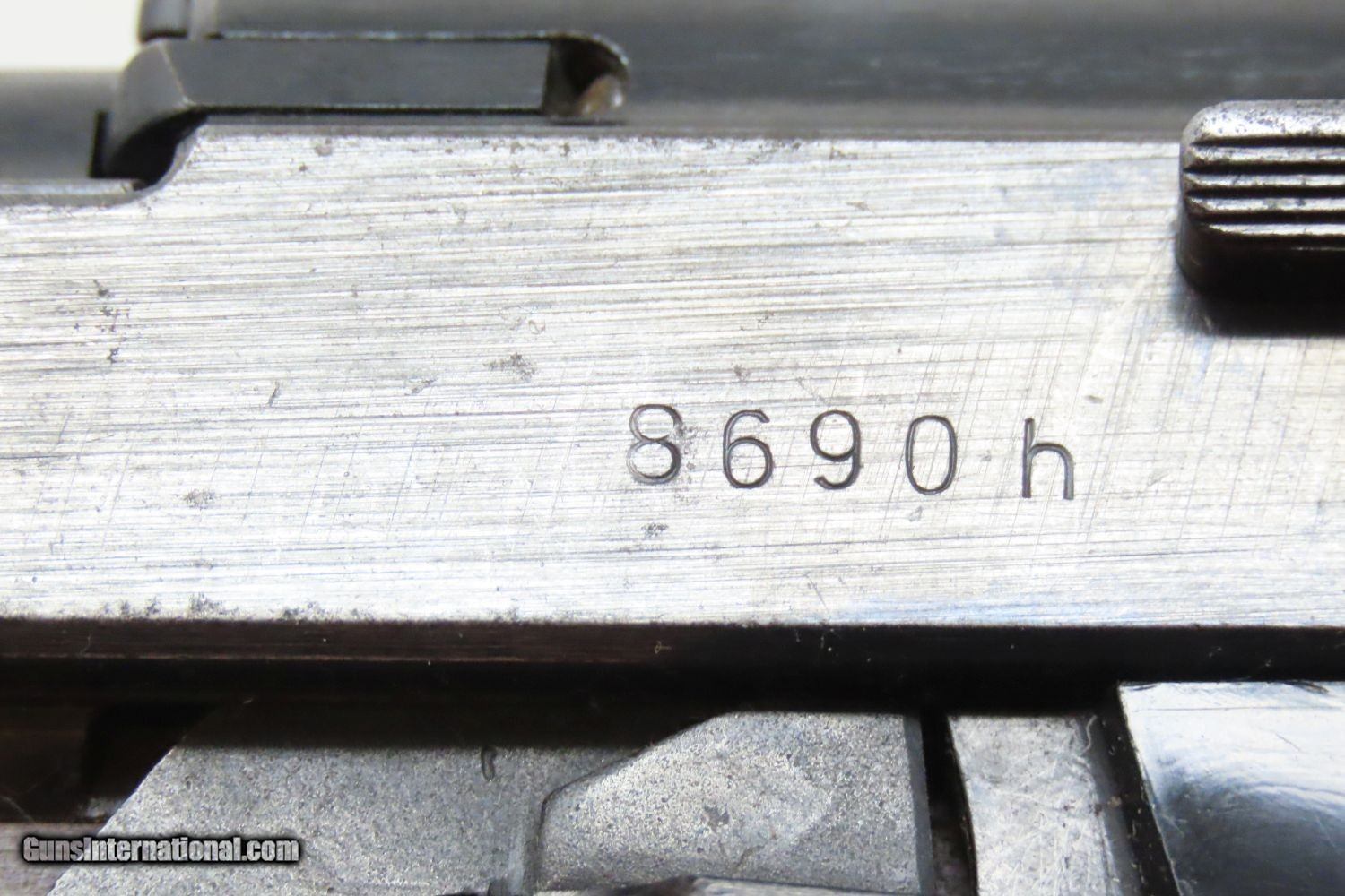 Description: WORLD WAR 2 Walther "ac/43" Code P.38 GERMAN MILITARY Semi-Auto Pistol C&R 9mm Semi-Auto Pistol from the Third Reich with HOLSTER! Here we present a Nazi German Walther “ac/43” code P38 Pistol, made in July of 1943 in Zella-Mehlis. The P38 was designed by Walther to replace the Luger P08 as the standard service weapon for the Third Reich’s Wermacht. The Luger was a ground-breaking design, but quite expensive to produce. The P38 was the first locking breech pistol to feature the double/single action firing mechanism with a decocking safety lever, a prelude to many modern pistols to come. It also features a loaded chamber indicator that is both visible and tactile, extending out of the top rear of the slide, just above the hammer. The falling block locking mechanism was also carried into future pistol designs. Many of these design features are found in the Beretta 92 or U.S. M9 pistols. The Wermacht was the primary buyer of these pistols, but the German police also used about 6,800 P38s. The left side of the slide is marked “P.38” and “ac/43”, the code for Walther and the year of manufacture. The frame, slide and magazine bear the acceptance marks “Eagle/359”. The overall condition is fine. Original and virtually complete blue finish. The action is as strong as ever. The bore is bright. Both grips are in great shape. The included holster is in very nice shape. The numbers match (8690h). Here is a fantastic piece of German WWII history for the collection! This firearm is classified as a Curio & Relic. Barrel is 4-3/4 inches. Caliber: 9mm Luger Overall condition as seen in photos. Very Fast. Very Safe. FREE SHIPPING. Will need to be sent to your local FFL or C&R licensee. This firearm is classified as a Curio & Relic. Guaranteed AUTHENTIC & Includes CERTIFICATE OF AUTHENTICITY. ancestryguns $1875 #201645 SOLD Antique: Yes |
