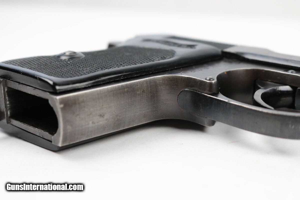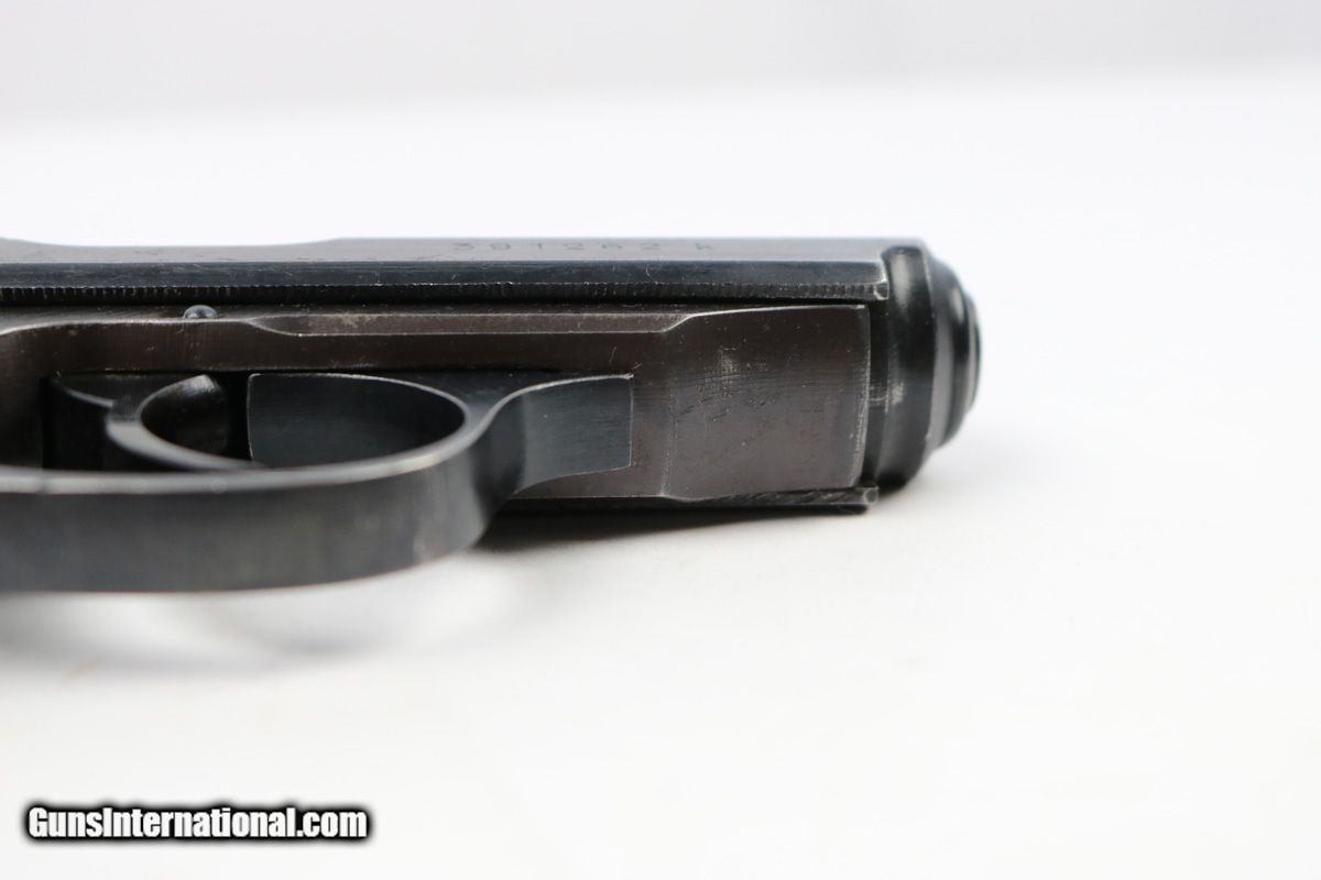 Description: This is an original 1942 production Walther PPK issued to police. The pistol has a nice wartime finish, almost plumb looking on the frame (just a light hint of plumb coloring). The pistol has a matching slide and serial number, and a police eagle/C stamp on the frame. The pistol has edge wear on the slide and frame, along with some normal thinning on the front strap and back strap/tang. There's also some light beginning signs of pitting below the ejection port and some pinpricking around the serial number on the slide. The frame also has some very light surface scratches around the trigger guard - this isn't too distracting though. The pistol is all original and fully functional. The bore is excellent - only some very light edge wear in the grooves. Comes with an original wartime magazine. Guaranteed authentic and original. Visit legacy-collectibles for more... SOLD Curio/Relic: Yes Manufacturer: Walther Model: PPK Caliber Info: 7.65mm Bore: 9/10 Condition: 93-94% Manufacture Date: 1942 |