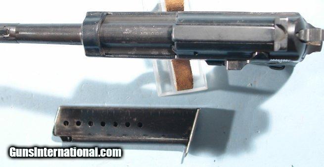 Description: WWII OR WW2 SPREEWERKE CYQ CODE WALTHER P-38 9MM PISTOL. Serial number "2700" on barrel lug, slide and frame matching. Spreewerke "cyq" to the right of "P. 38" on right side of slide. Waffenampts with swastikas over "88" on right side of slide. Pistol was probably repurposed for East German Police hence the starburst next to another shield with "22" in it. Along with british proofs on frame(crossed swords.BNP) and "Tons…" British proof on barrel explains its refurbishment(reblued) over some pitting from WW2. Original grip panels and mint bore as well perfect working order. "jvd" stamped wartime magazine. Saw action in the War, battlefield pickup, issued to East German Police, sold to Britain in surplus deal(Interams bought thousands and had them proofed in Manchester at their own facility, then imported by Interarms for sale here prior to mandatory import stamping requirement which this one has none of(NO import marks). Real WW2 Spreewerke P-38 for not much money. Would make a good shooter too. SOLD Curio/Relic: Yes |