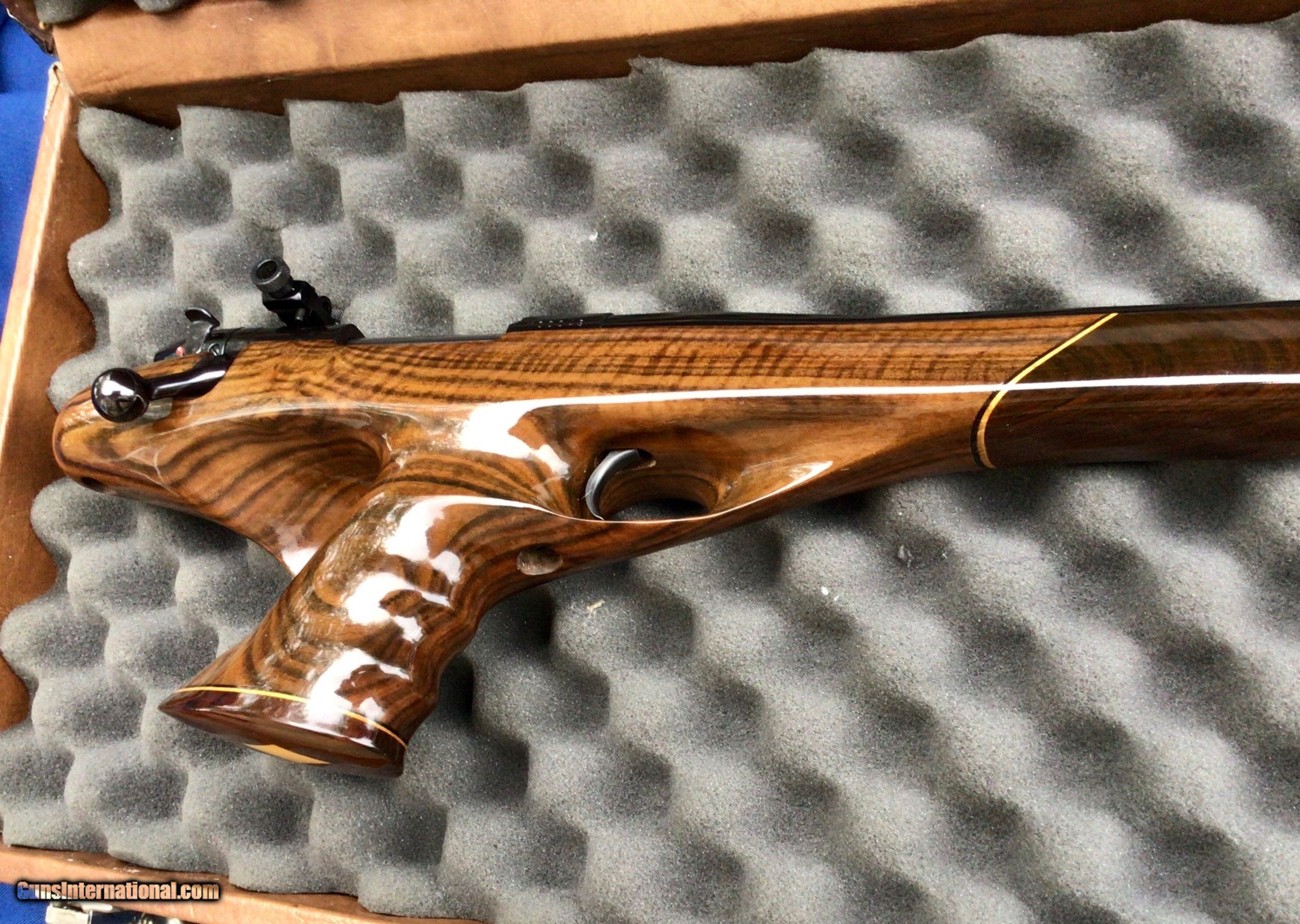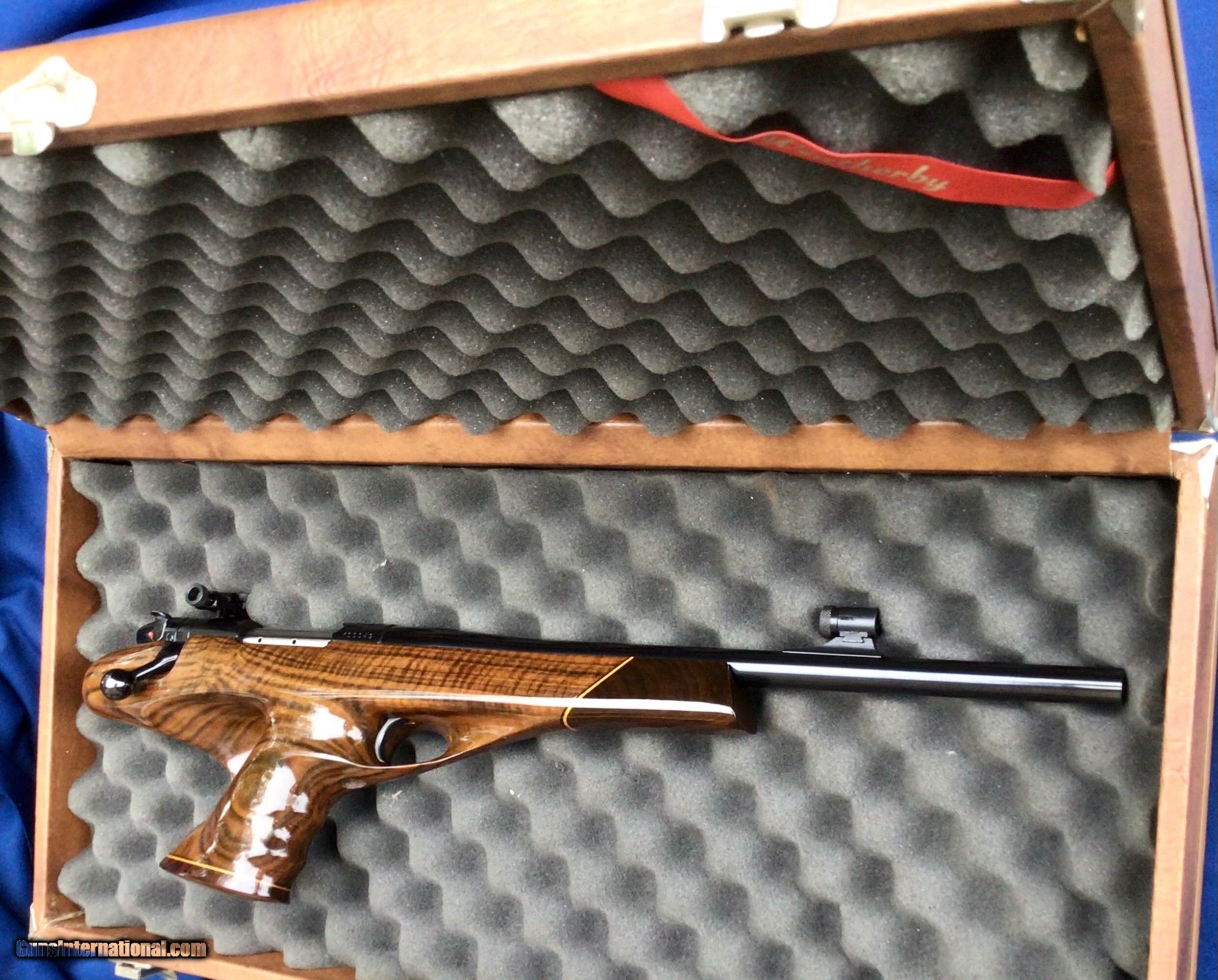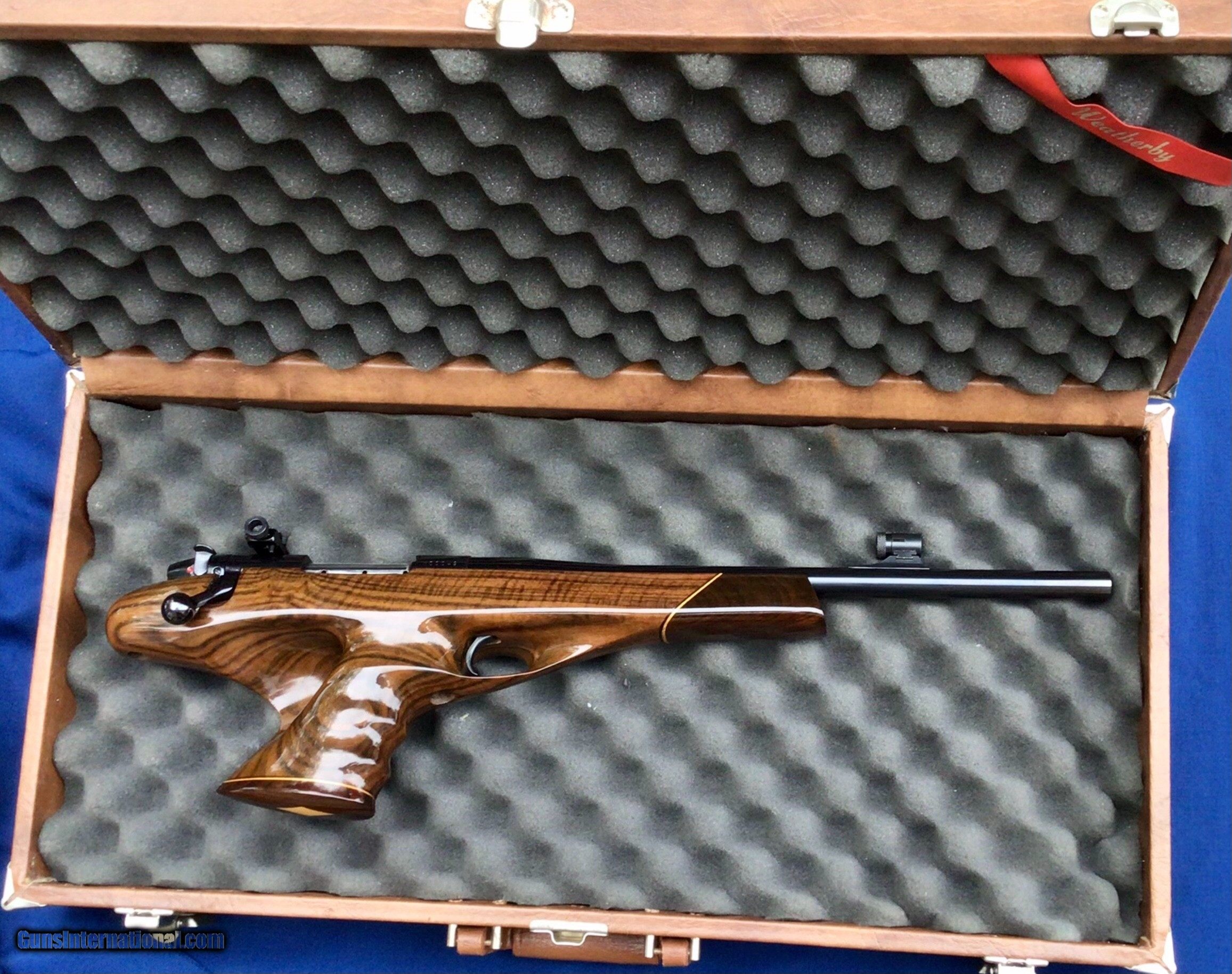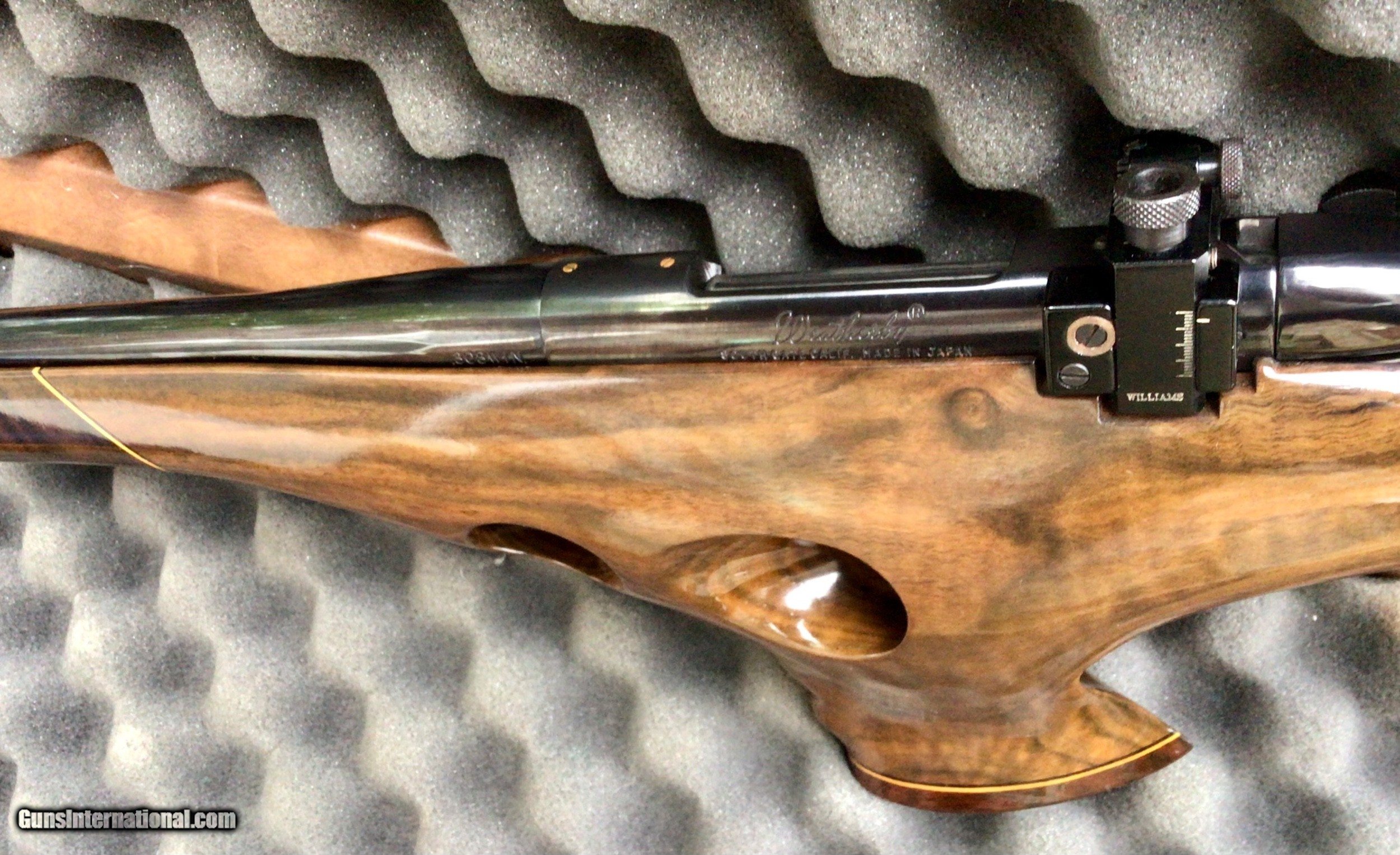 Description: Weatherby Mark V Silhouette Model in .308 Win. made approximately 1980 in Japan. It remains in 99% condition and appears to be unfired in the original factory case. The bronze filler screws on the receiver are present. It is estimated that only 150 were produced in this caliber. Please study the detailed photos for a better idea of the condition. It features a highly figured claro walnut stock with excellent fiddleback figure. This is an investment grade Weatherby. Please contact me via email, and I will respond promptly. References provided upon request. SOLD |