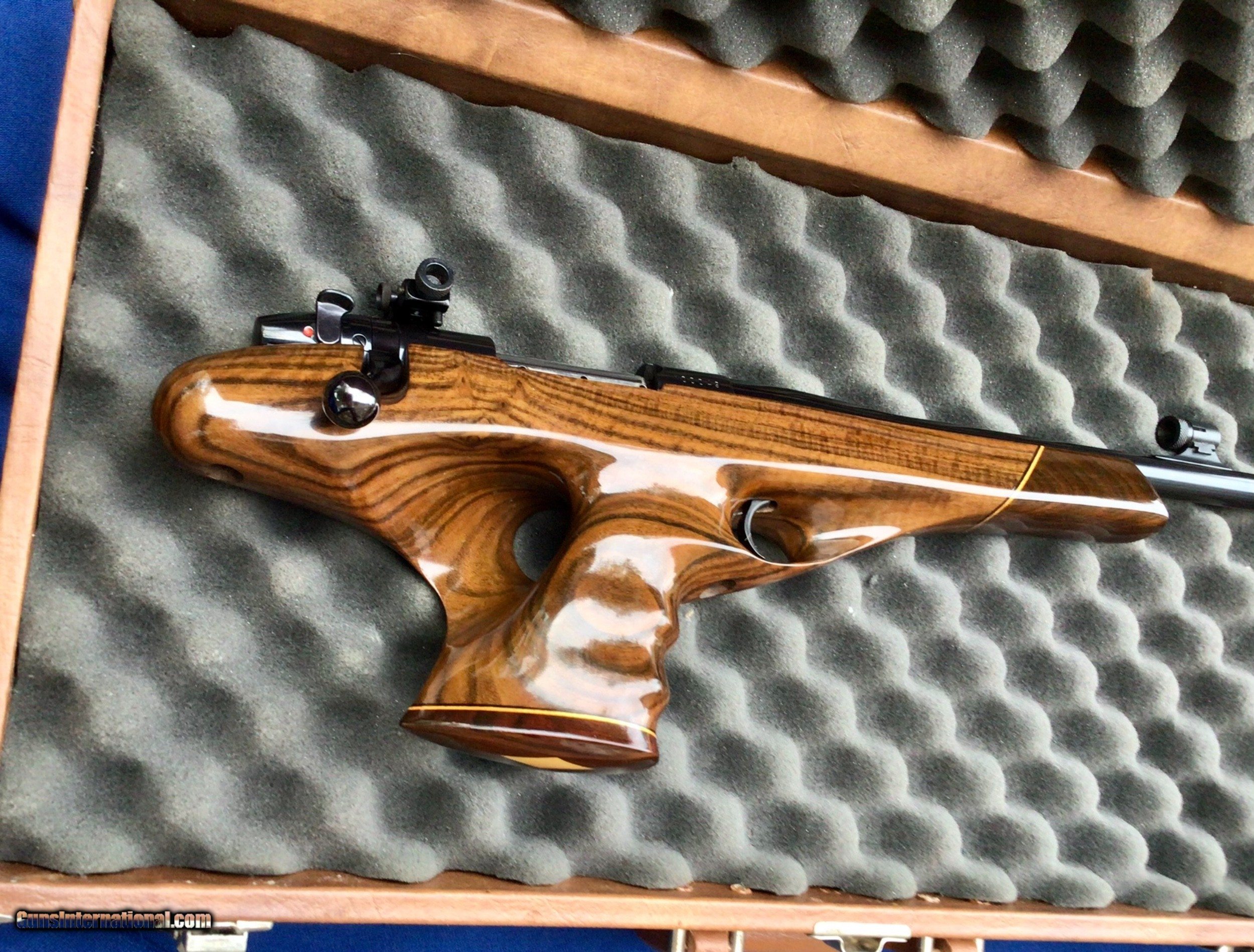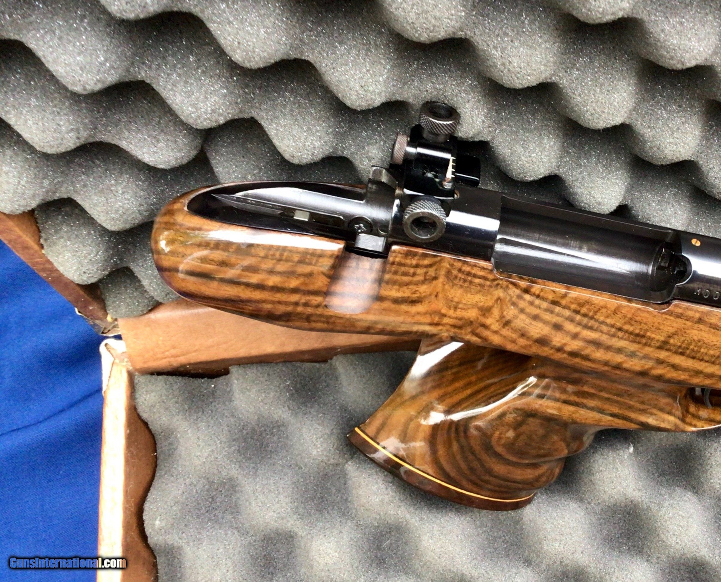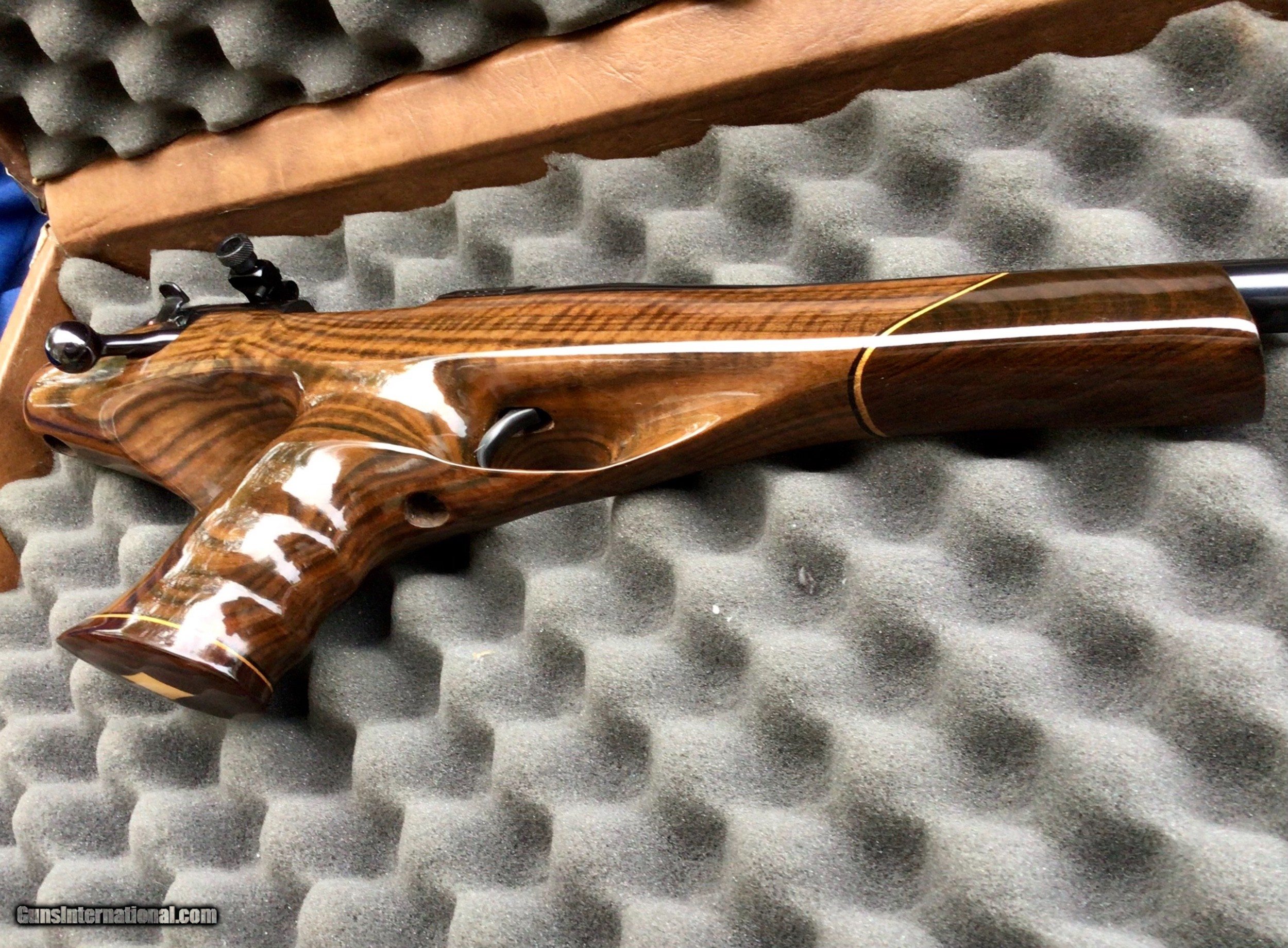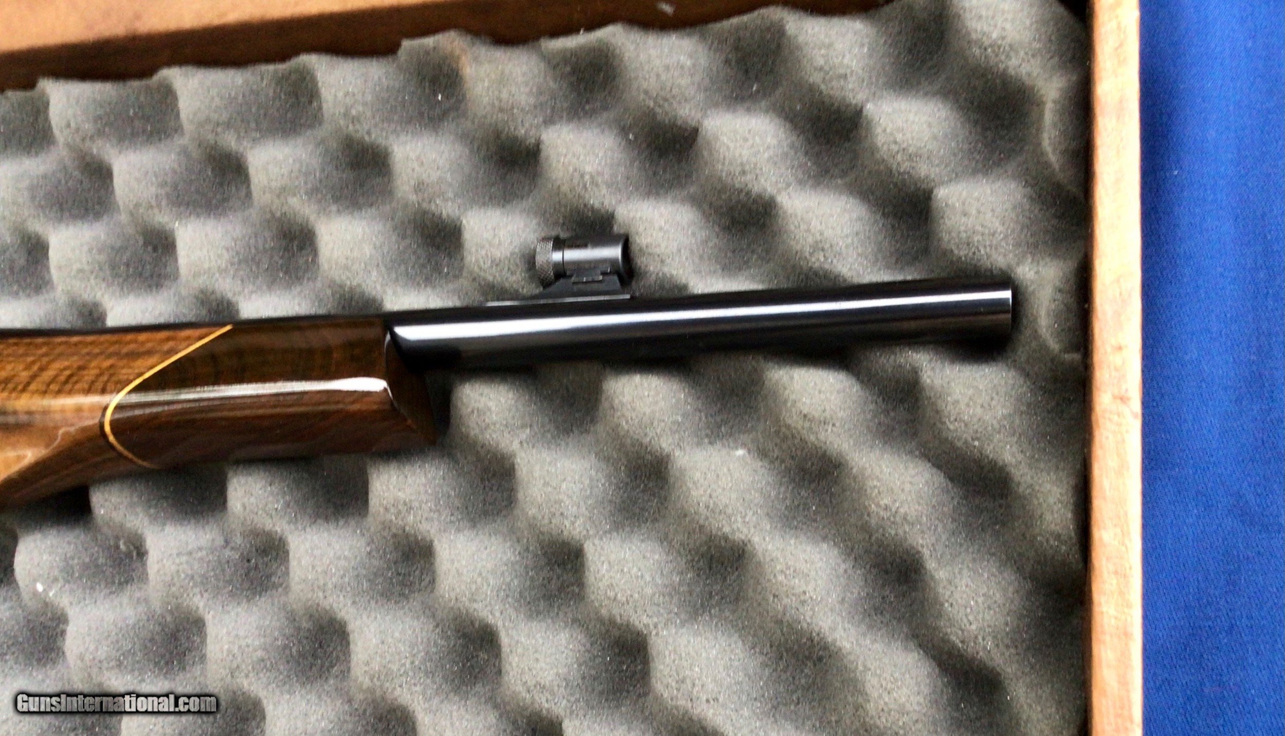 Description: Weatherby Mark V Silhouette Model in .308 Win. made approximately 1980 in Japan. It remains in 99% condition and appears to be unfired in the original factory case. The bronze filler screws on the receiver are present. It is estimated that only 150 were produced in this caliber. Please study the detailed photos for a better idea of the condition. It features a highly figured claro walnut stock with excellent fiddleback figure. This is an investment grade Weatherby. Please contact me via email, and I will respond promptly. References provided upon request. SOLD |