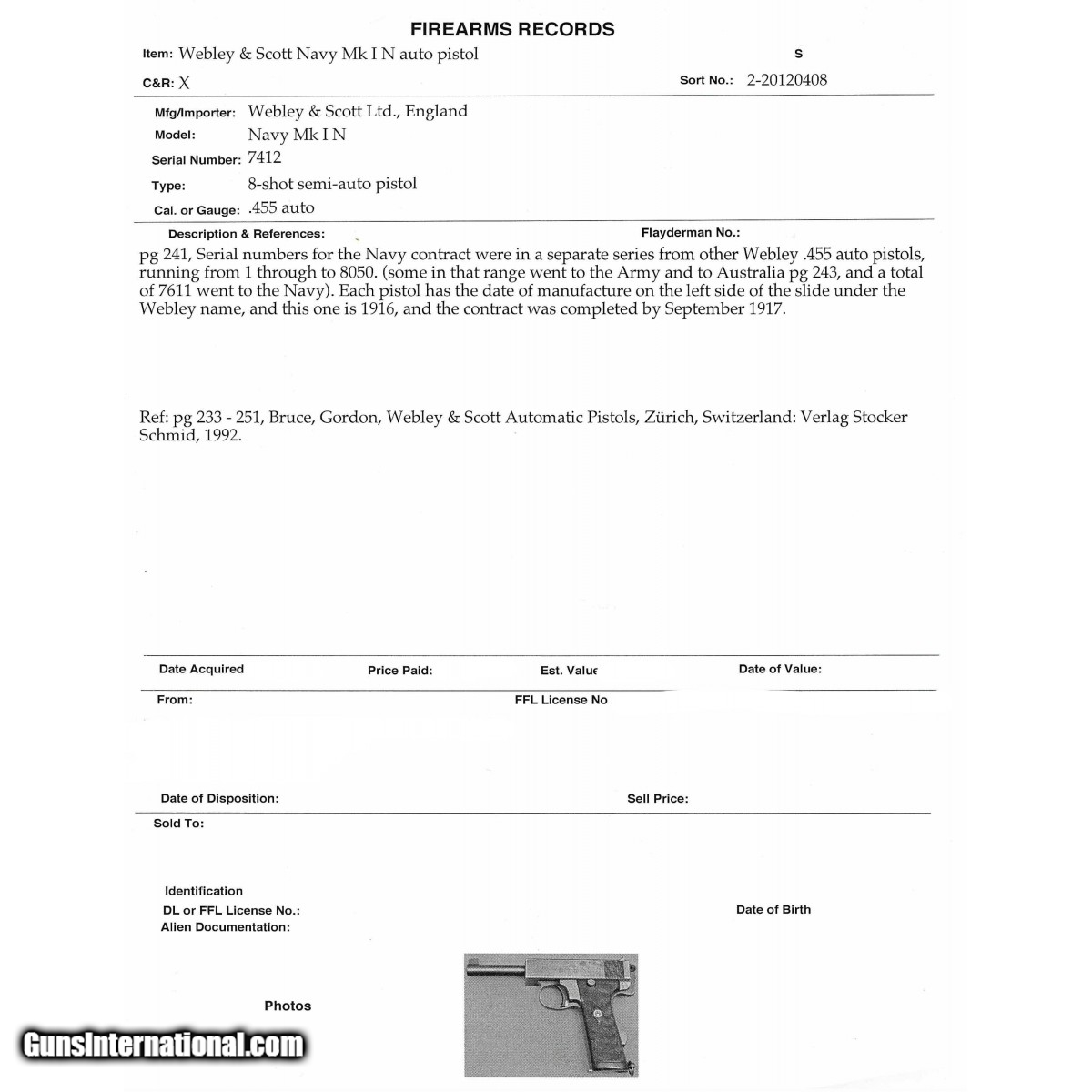 Description: " Serial No. 7412, made in 1916, .455, 5"" round barrel. Pistol is Navy marked with ""N"" stamped on the left side of the slide after ""MKI"". 70% original blue remains with other areas starting to thin. Bore is fair with oxidation visible in the grooves. Grips are in very good plus condition with light scratches visible. Broad Arrow marks are present on trigger, frame and hammer. Action functions correctly. SOLD Curio/Relic: Yes |