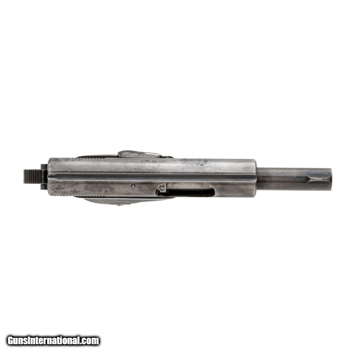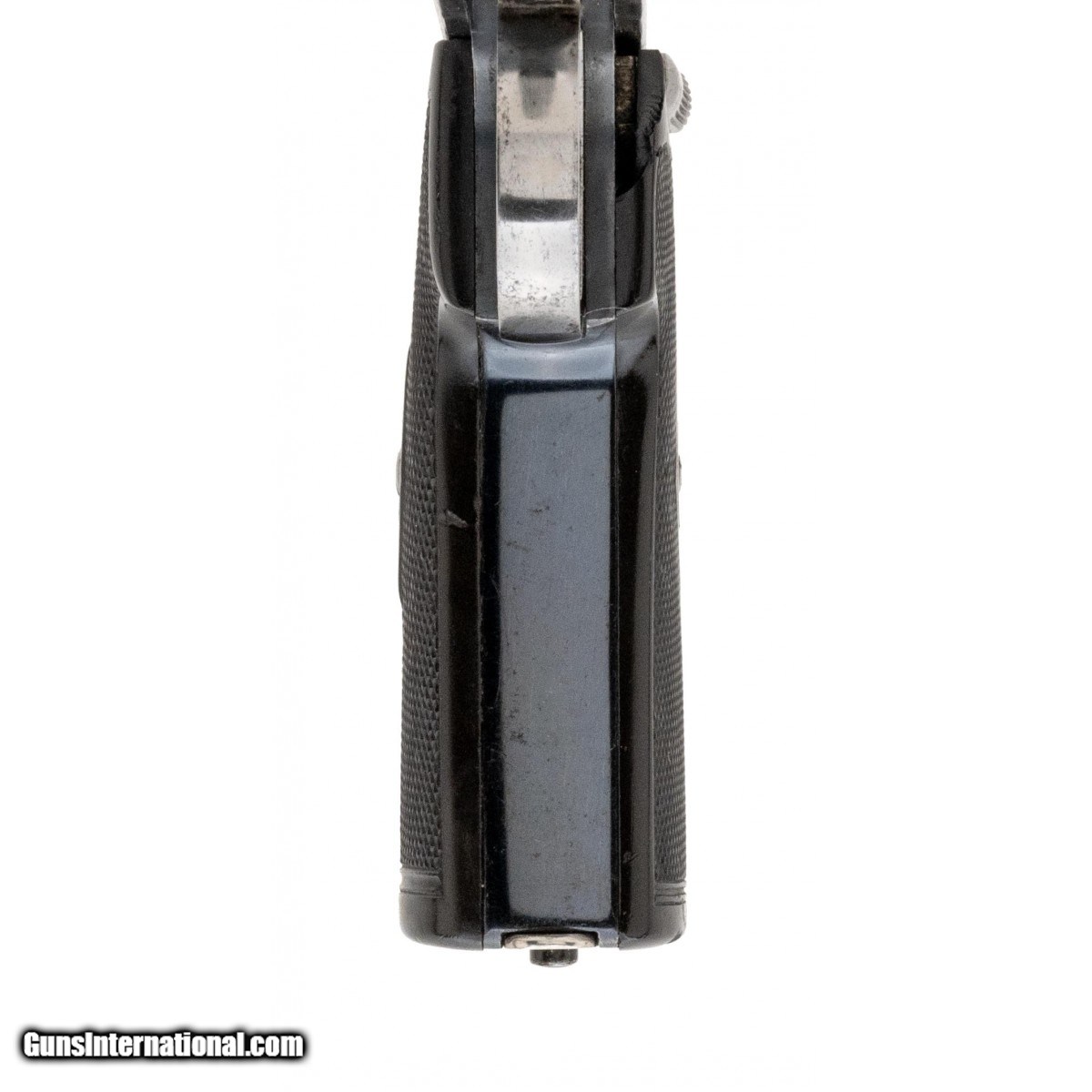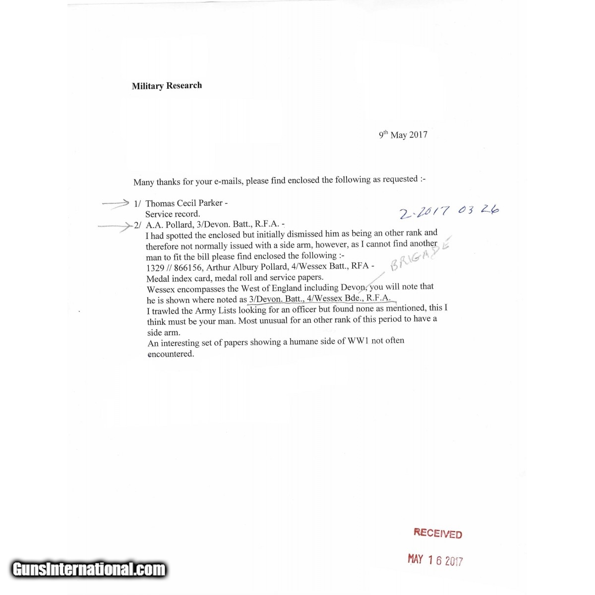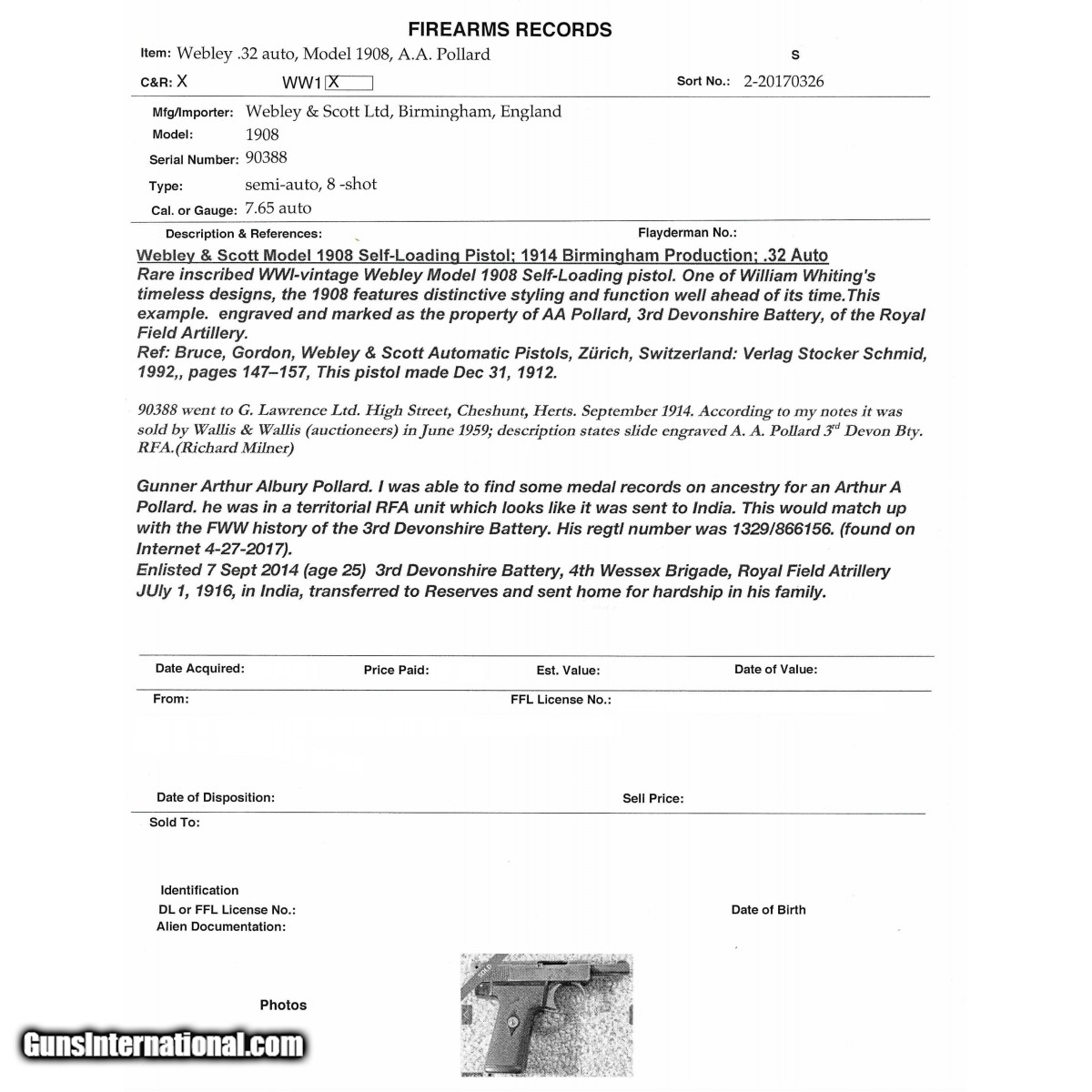 Description: " Serial No. 90388, made in 1912, .32acp, 3.5"" barrel. Metal is mostly a grey patina with original blue visible in protected areas. Right side of the slide is engraved with ""AA Pollard/3rd Devon. Bty. RFA"". Gunner Pollard was sent to India on July 1st 1916 and was then transferred to the reserves and sent home for hardship in his family. Bore is good with strong rifling visible. Checkered grips are very good with minor chips visible on the bottom. Action functions correctly. SOLD Curio/Relic: Yes |
