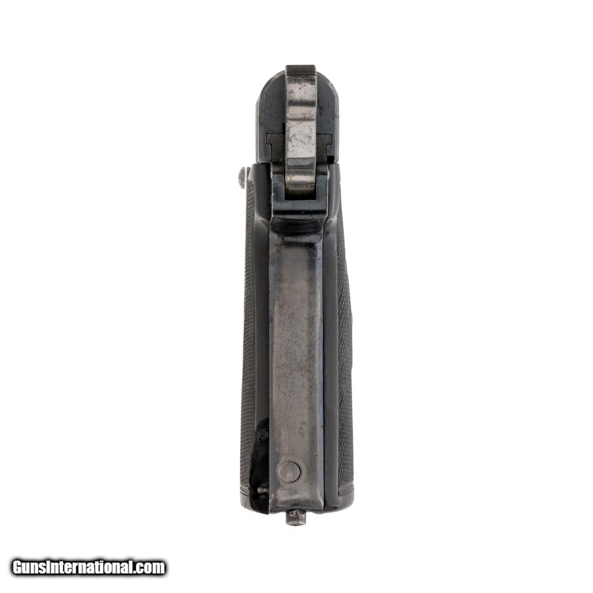 Serial No. 90388, made in 1912, .32acp, 3.5"" barrel. Metal is mostly a grey patina with original blue visible in protected areas. Right side of the slide is engraved with ""AA Pollard/3rd Devon. Bty. RFA"". Gunner Pollard was sent to India on July 1st 1916 and was then transferred to the reserves and sent home for hardship in his family. Bore is good with strong rifling visible. Checkered grips are very good with minor chips visible on the bottom. Action functions correctly.