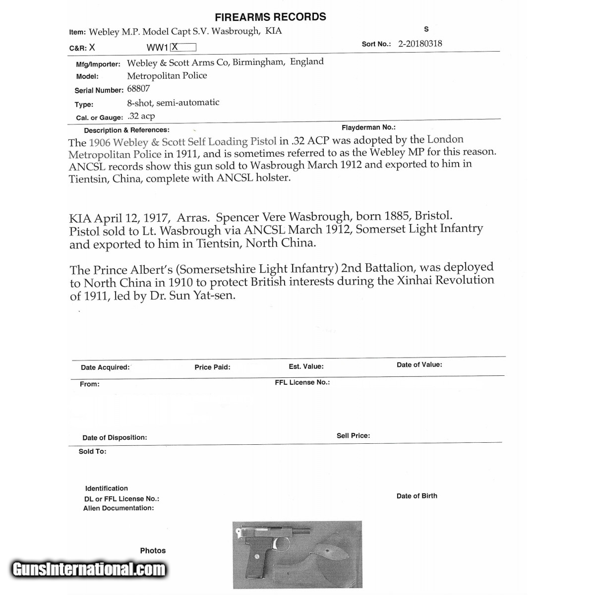Serial No. 68807, made in 1911, .32 ACP, 3.5"" round barrel. Approximately 65% blue remains mixed with patina. Bore is bright with light oxidation visible in the grooves. This Webley & Scott was bought by Spencer Vere Wasbrough and sent to him in Tientsin China in 1912. He had been in China, in 1910 during the Xinhai Revolution. Washbrough would be promoted to Captain and be in charge of a brigade of four ""carrying Companies during the battle of Arras. Two days after the battle began, Capt. Wasbrough would be killed in battle. He was only 32 years old is buried in Highland Cemetery near Pas De Calais, France. Pistol comes with its original holster that was sent to China in 1912.