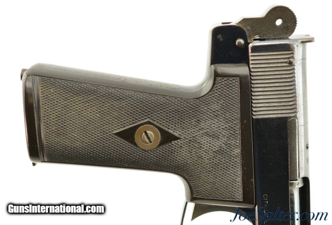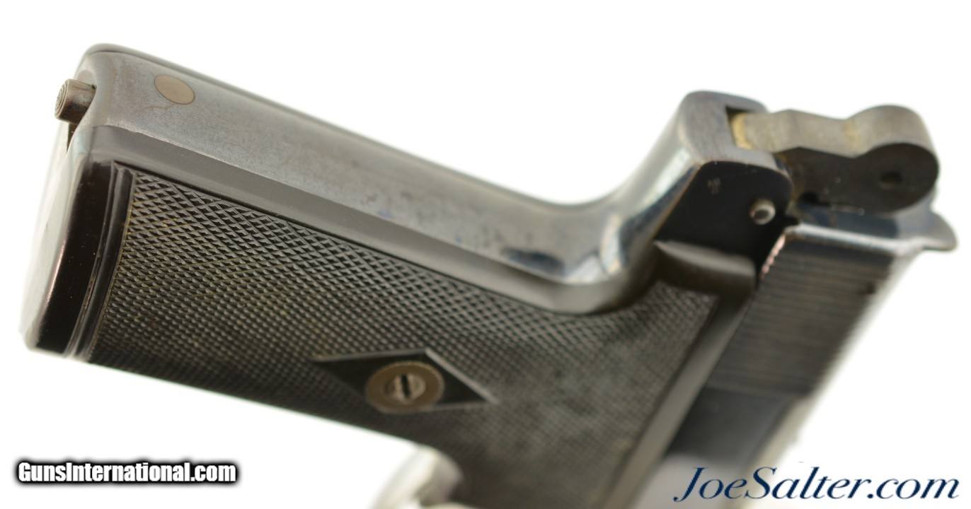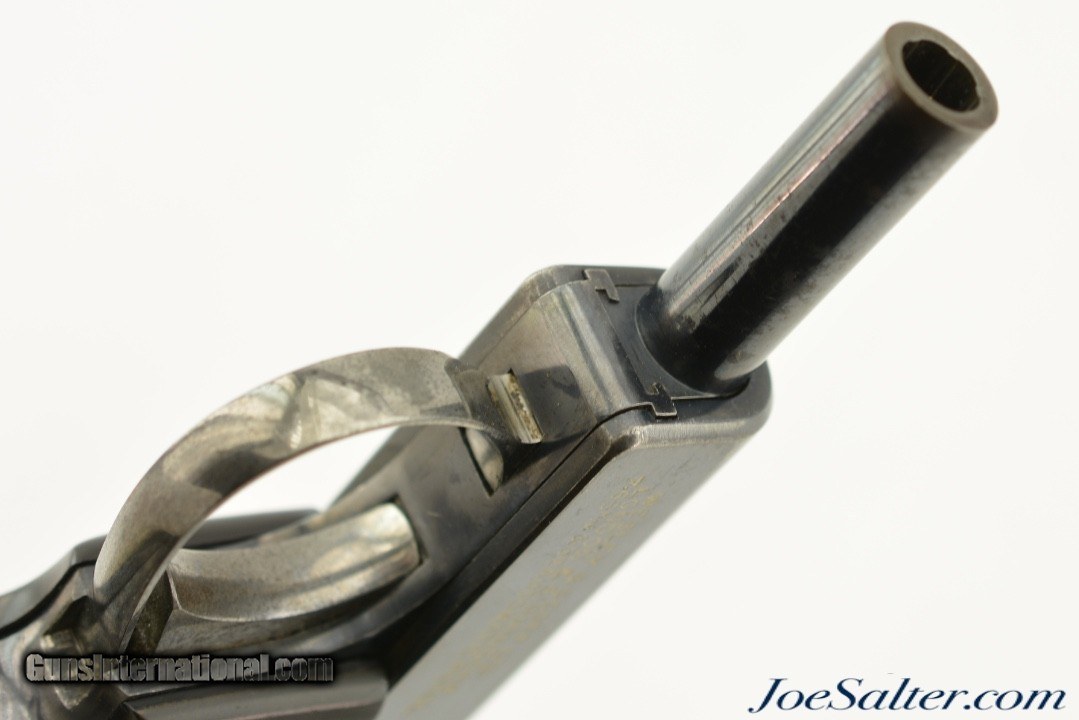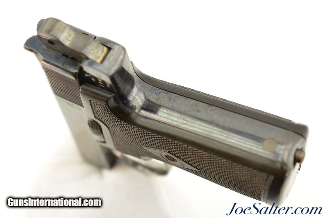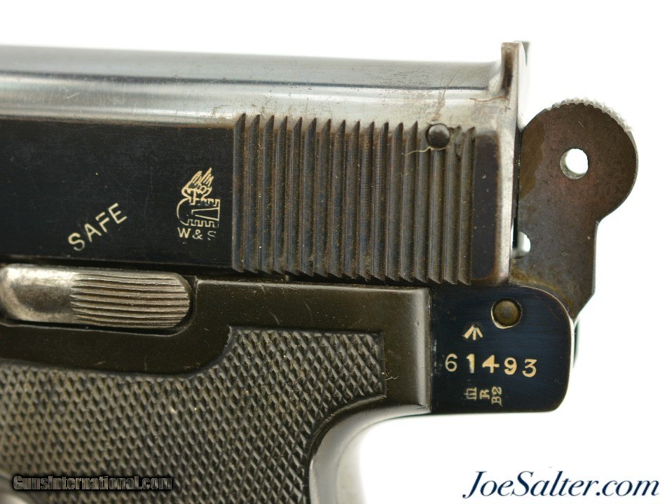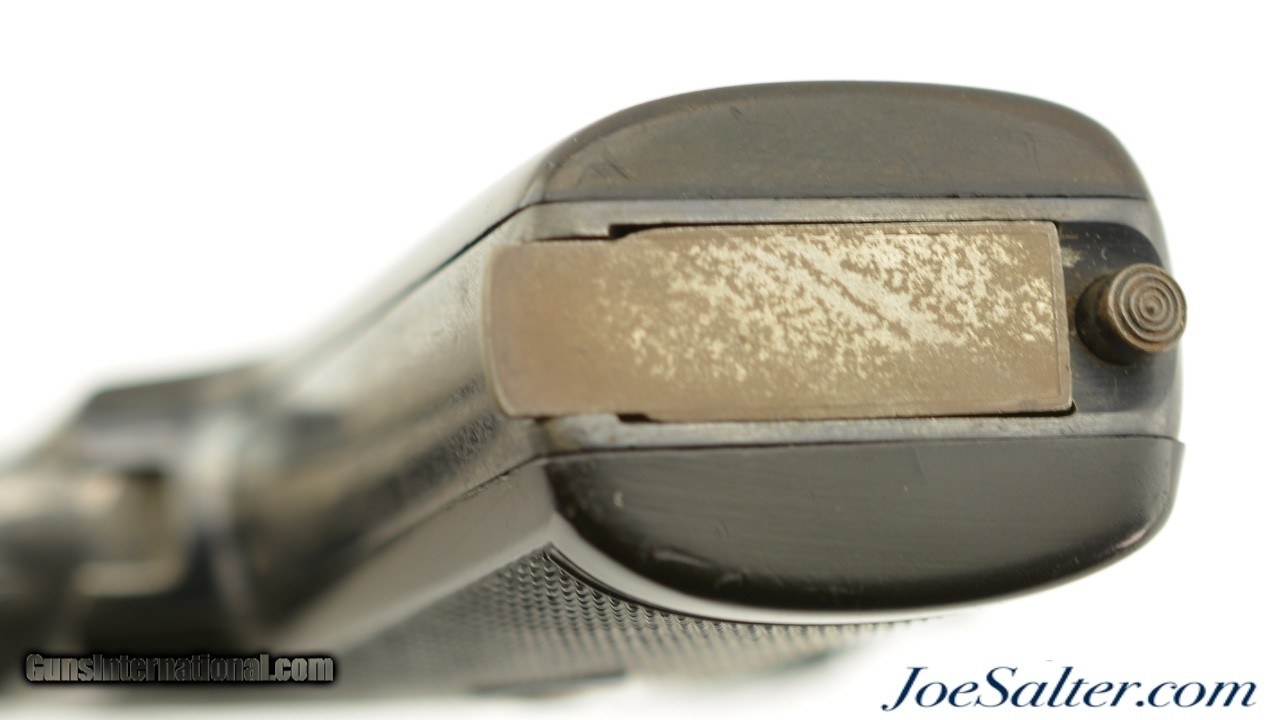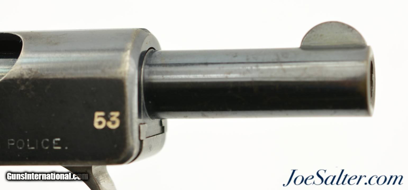 Description: Serial #61493, .32 ACP, 3 1/2" barrel with an excellent, bright bore. This is a splendid "CITY OF LONDON POLICE" marked, Metropolitan Police pistol that retains 92-95% of the original bright blue finish on the slide and frame, with some areas of mild fading at the muzzle and along the edges and projections. There is some minor freckling on the bright trigger guard, safety lever, and along the top radius of the slide. A Police Broad Arrow proof is present on the left side of the frame, just above the serial number, as is an issue or rack number on the right side of the slide: "53." The checkered hard rubber grips are in fine shape, having very little noticeable wear, and only some very minor flattening of the points. A single, correct MP Model, all-nickel magazine with raised follower/slide hold-open is included. This was a police-issued pistol, and is listed by number on page 207 of "Webley & Scott Automatic Pistols" by Gordon Bruce {1992}. The pistol was manufactured between February 14 and February 20, 1911, and is listed by serial number as issued to D Division, City of London Police as late as 1957, just prior to the sale of all of the City of London Police Webleys to Stockton Arms Co. of California in 1958. Despite the sale, these pistols are seldom seen today, and this example rates fine-excellent condition overall. FFL or C&R; SOLD Curio/Relic: Yes |