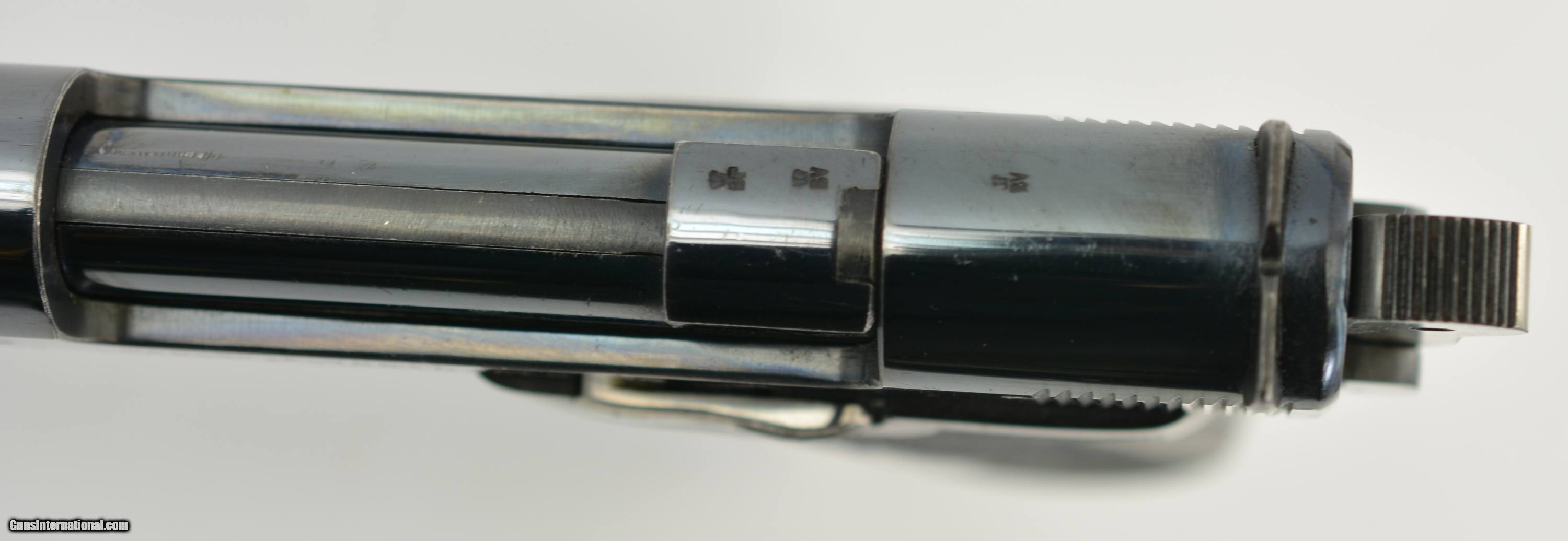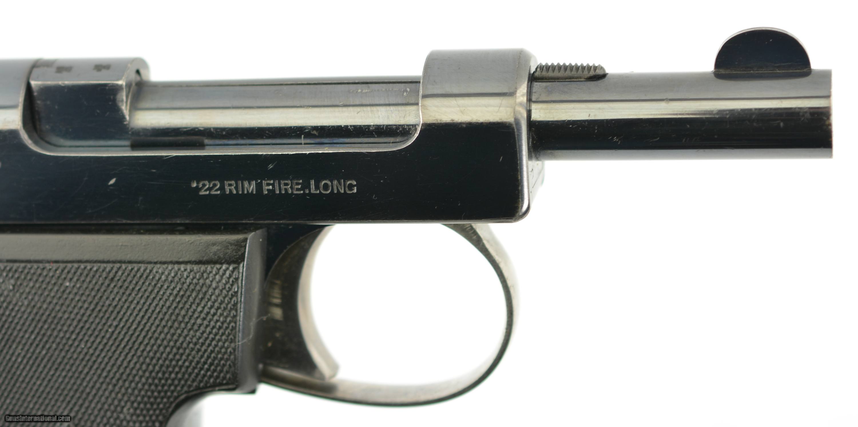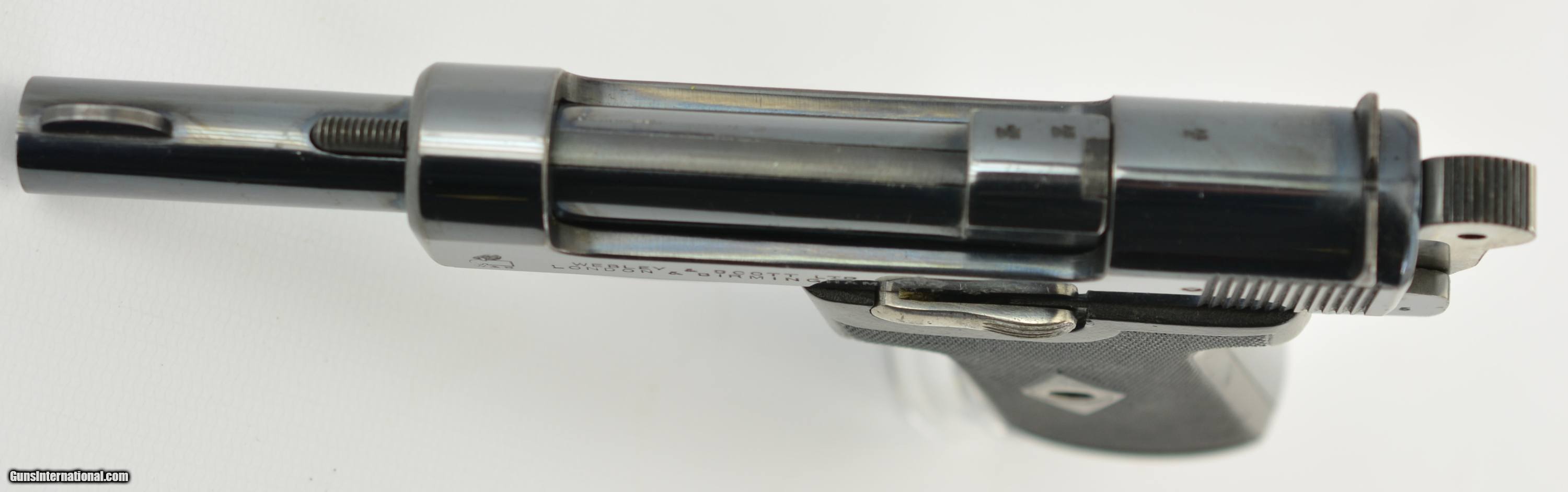 Description: Serial #69415, .22 Long, 4 1/2" barrel with an excellent, bright bore. This is a splendid little, “(Crown) / MP" marked, Metropolitan Police model pistol that retains 97-98% of the original bright blue finish on the slide and frame. There is some minor freckling on the bright trigger guard and safety, and some dark metal along the edges of the ring hammer. The checkered hard rubber grips are in fine shape, having very little noticeable wear, and only some very minor flattening of the points. The pistol is housed in an original brown leather holster with tab closure, and was made to fit the .32 and .22 Metropolitan Police model pistols. These pistols were intended to provide Scotland Yard with economical training pistols, but were also sold commercially. In typical confusing style, although the Model 1911 was a manually-loaded and extracted single-shot, it was described as a “Semi-Automatic" by Webley to differentiate it from their “Automatic", self-loading pistols. They are seldom seen today, especially in the United States, and this example rates excellent condition overall. FFL or C&R SOLD Curio/Relic: Yes Manufacturer: Webley Model: 1911 Serial Number: 69415 Caliber Info: .22 Gauge Info: .22 |