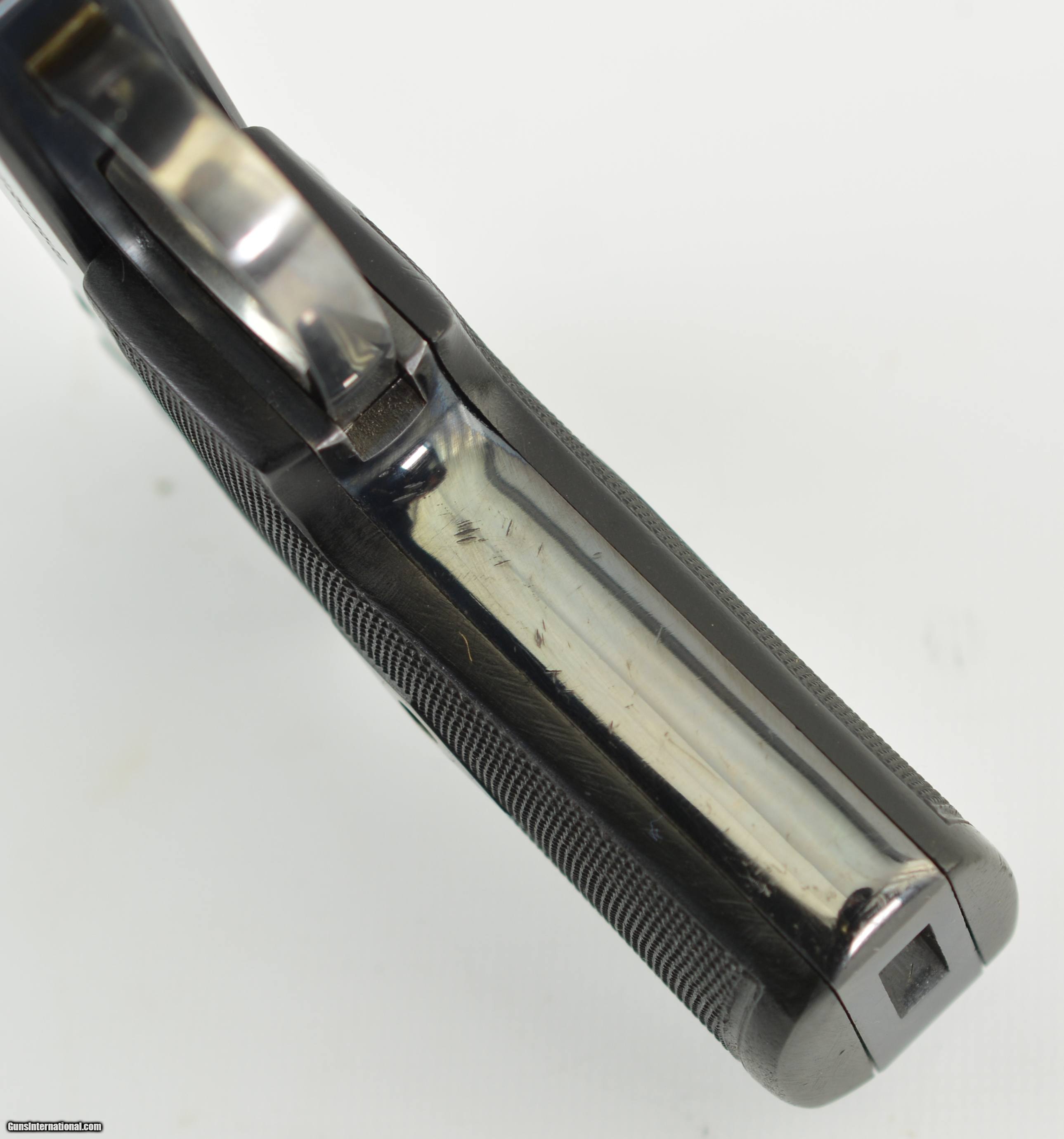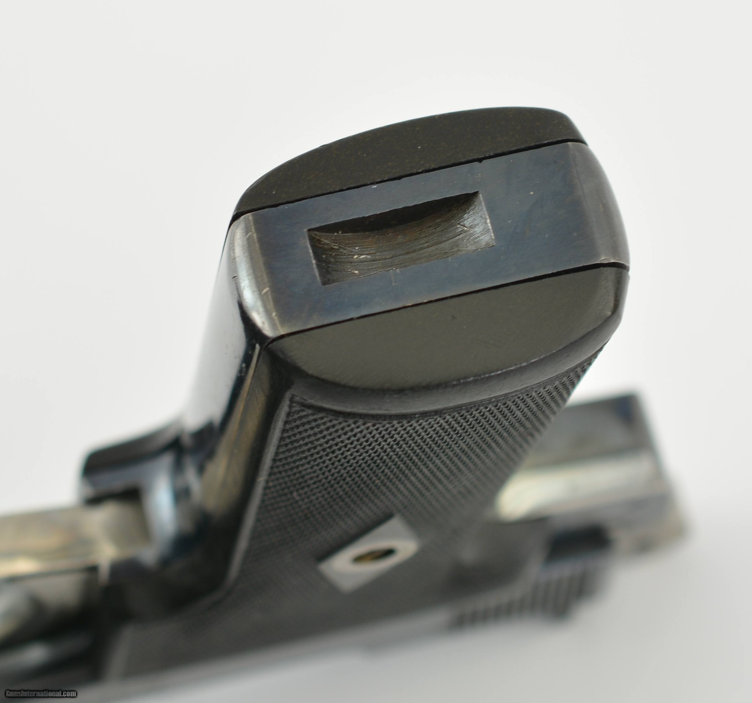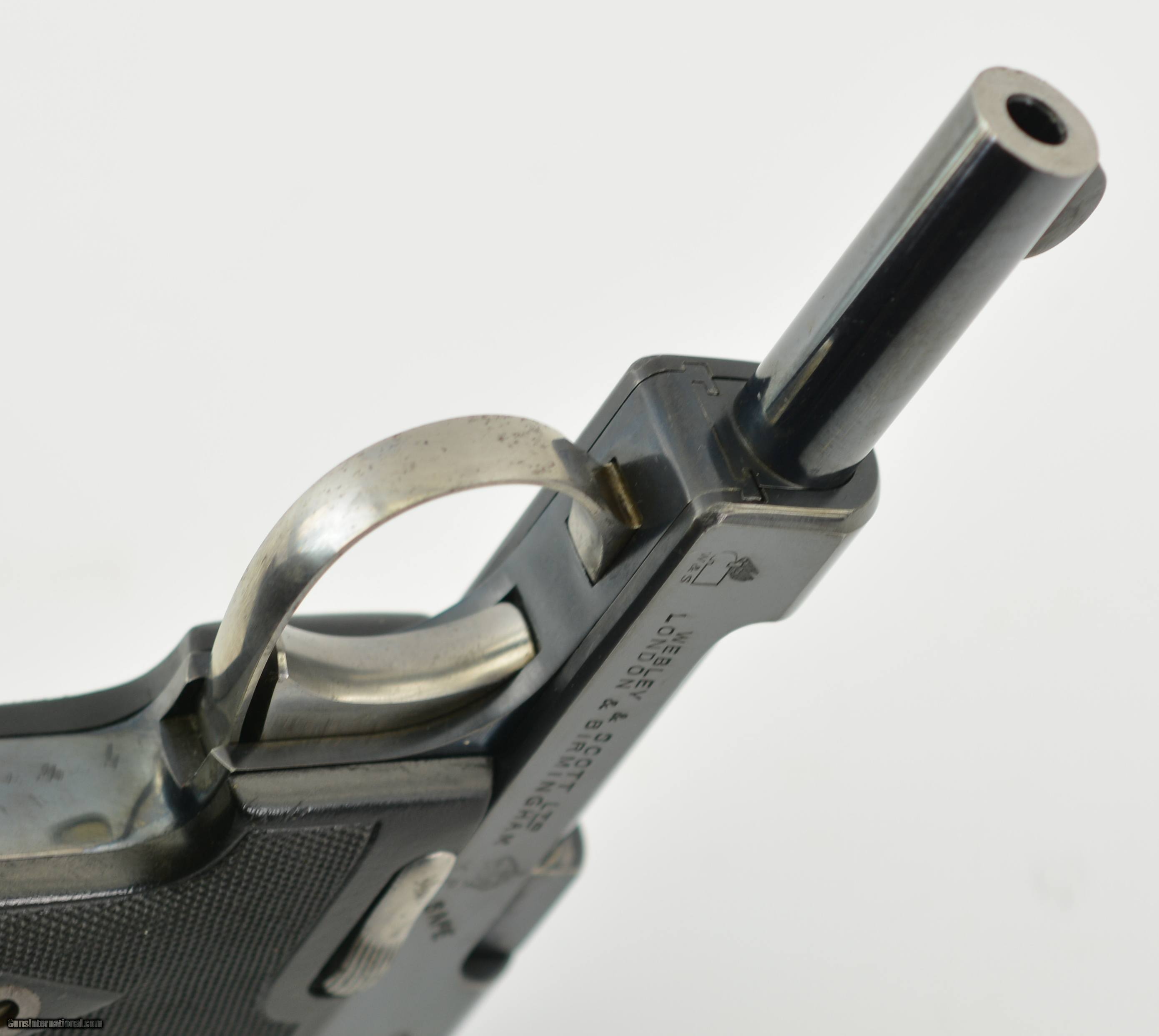 Description: Serial #69415, .22 Long, 4 1/2" barrel with an excellent, bright bore. This is a splendid little, “(Crown) / MP" marked, Metropolitan Police model pistol that retains 97-98% of the original bright blue finish on the slide and frame. There is some minor freckling on the bright trigger guard and safety, and some dark metal along the edges of the ring hammer. The checkered hard rubber grips are in fine shape, having very little noticeable wear, and only some very minor flattening of the points. The pistol is housed in an original brown leather holster with tab closure, and was made to fit the .32 and .22 Metropolitan Police model pistols. These pistols were intended to provide Scotland Yard with economical training pistols, but were also sold commercially. In typical confusing style, although the Model 1911 was a manually-loaded and extracted single-shot, it was described as a “Semi-Automatic" by Webley to differentiate it from their “Automatic", self-loading pistols. They are seldom seen today, especially in the United States, and this example rates excellent condition overall. FFL or C&R SOLD Curio/Relic: Yes Manufacturer: Webley Model: 1911 Serial Number: 69415 Caliber Info: .22 Gauge Info: .22 |