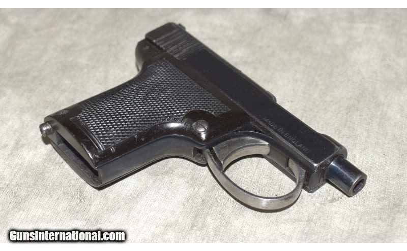 Description: Nice little vest pocket-size mouse gun from England. This one features simple post and notch fixed sights, oversize trigger guard, and mechanical safety. 6.35mm (.25ACP) SOLD Curio/Relic: Yes Chambers: 6 Metal Condition: Very good. There are a number of scratches but nothing very bad. Wood Condition: Very good. Light handling marks. Bore Condition: Shiny and clean with good rifling. Barrels: 2-1/4 inch Triggers: Factory single action trigger. Butt Pad: Checkered black plastic Weight: 10 Oz Sights: Rudimentary post and notch. Item Location: Rogers |