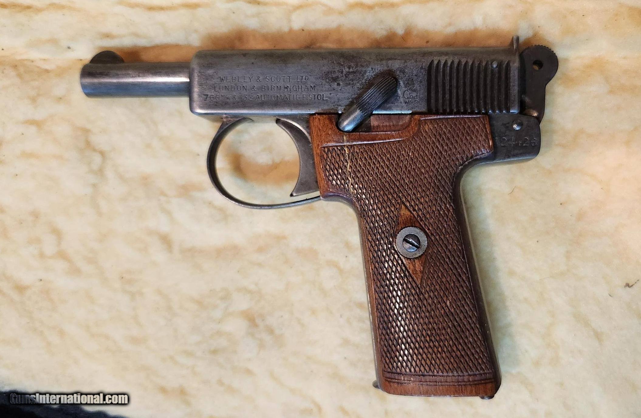 Description: Webley & Scott LTD, Model 1908. 32 ACP caliber. Excellent overall condition. Both stocks have cracks. Left stock is cracked and repaired, near trigger housing. Right stock (actually a hole). Both are clearly shown in pictures. Bore is excellent. $1600 includes shipping to FFL or C&R Only. E-MAIL PLEASE. SOLD Handgun Caliber: .32 ACP (7.65x17mm Browning SR) Manufacturer: WEBLEY AND SCOTT Model: 1908 Serial Number: 124426 Barrel Length: 3 1/2 INCH |