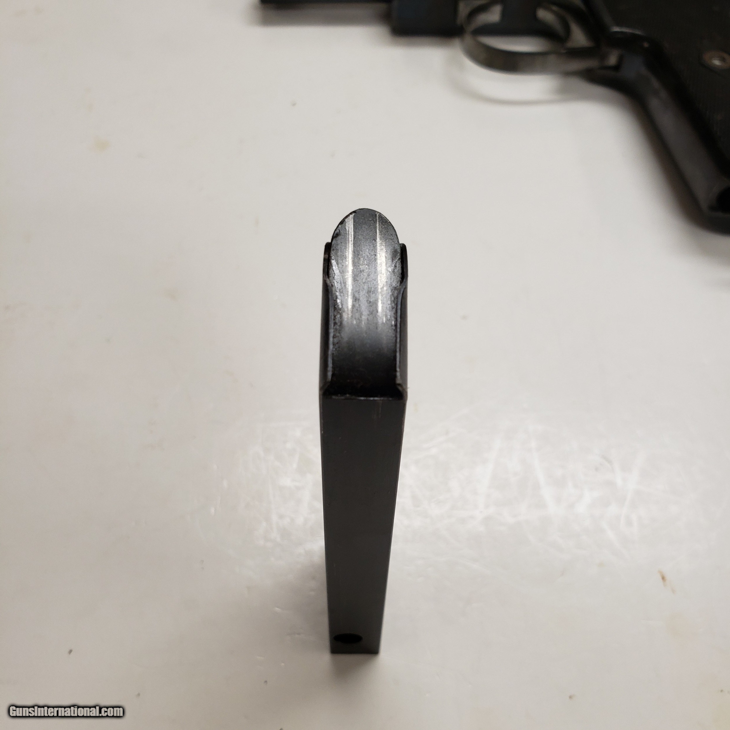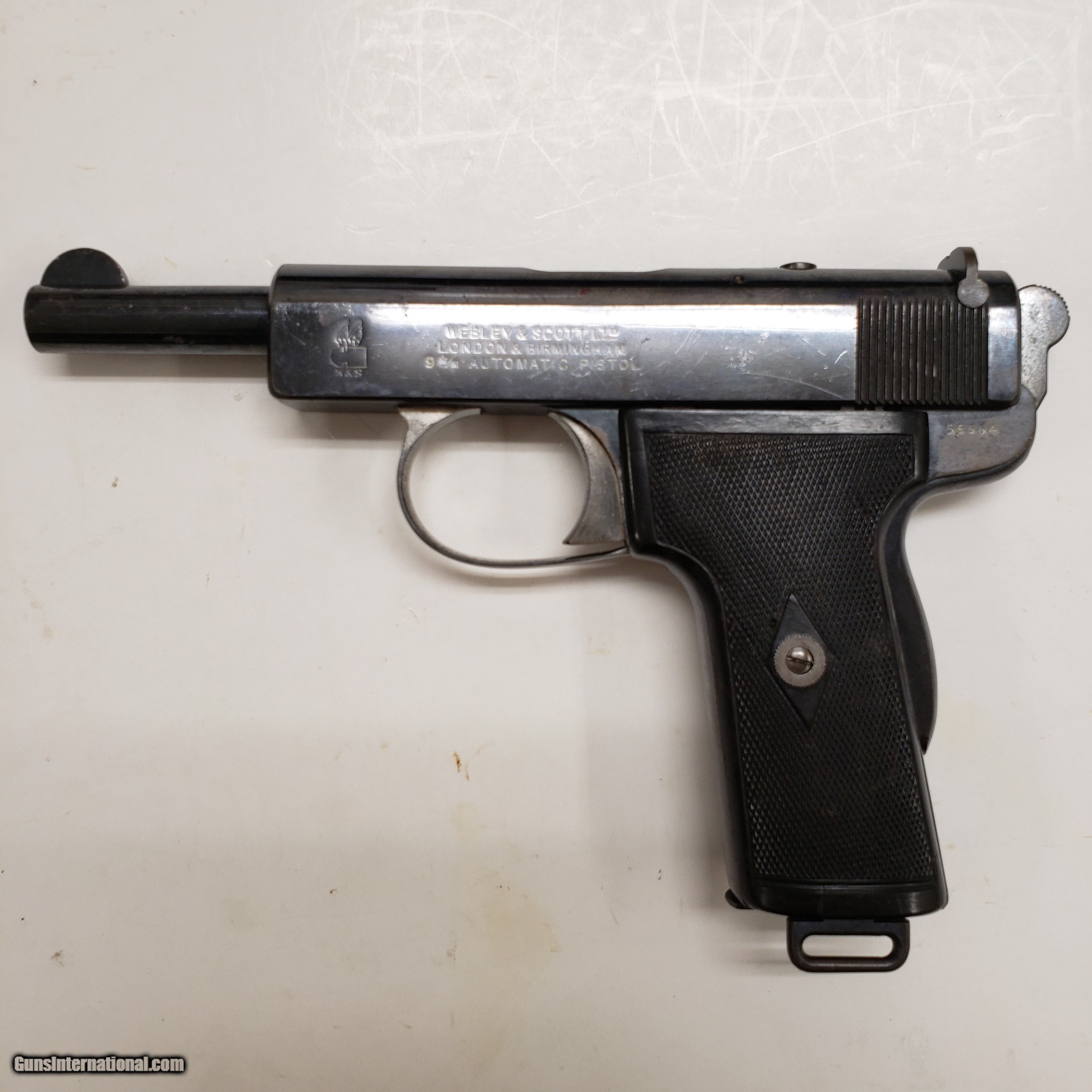 Description: Webley & Scott Model 1909 9MM. 90% Bright blue original finish with a few minor surface scratches. Pistol is chambered for a .9mm Browning long cartridge. Pistol was manufactured 18 Nov 1910. Pistol shows minimal usage with bright bore and perfect grips. Serial number 555XX. SOLD Curio/Relic: Yes Manufacturer: Webley & Scott Model: 1909 Serial Number: XXX64 Caliber Info: 9MM |